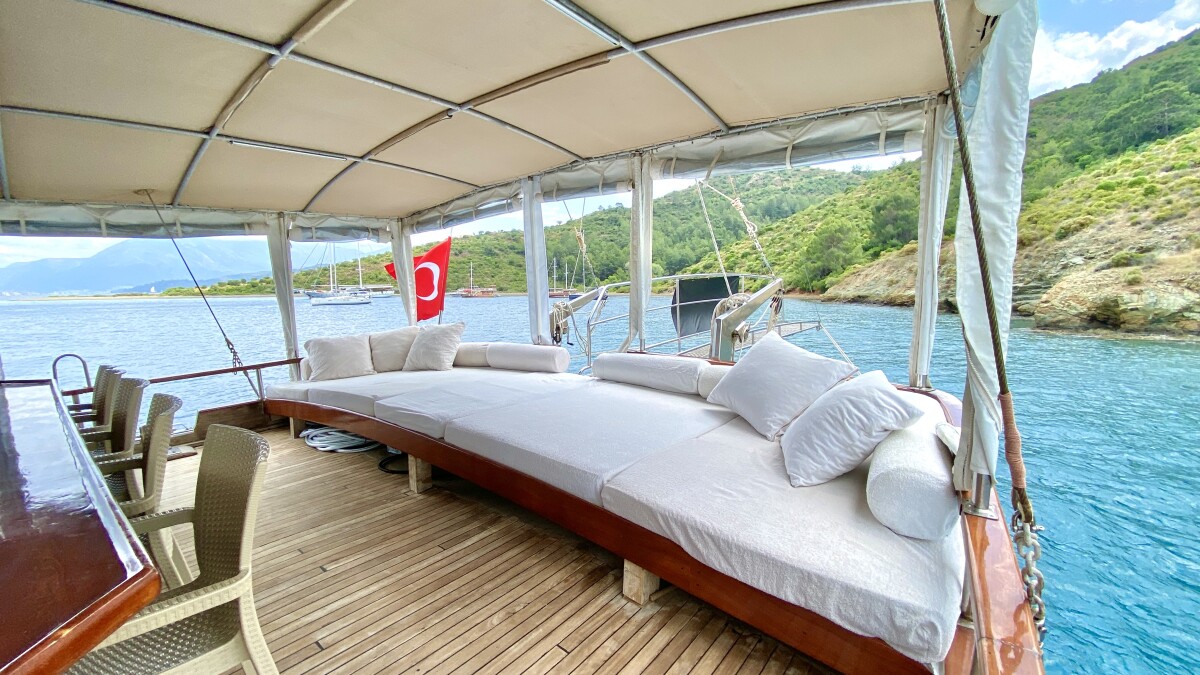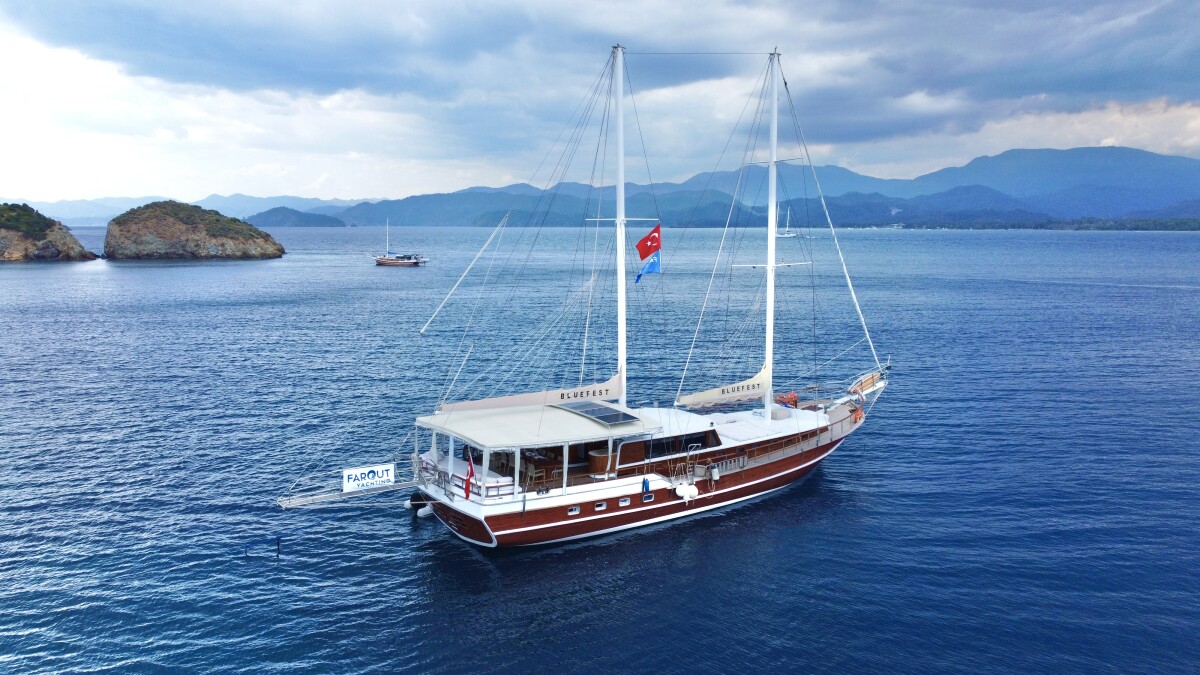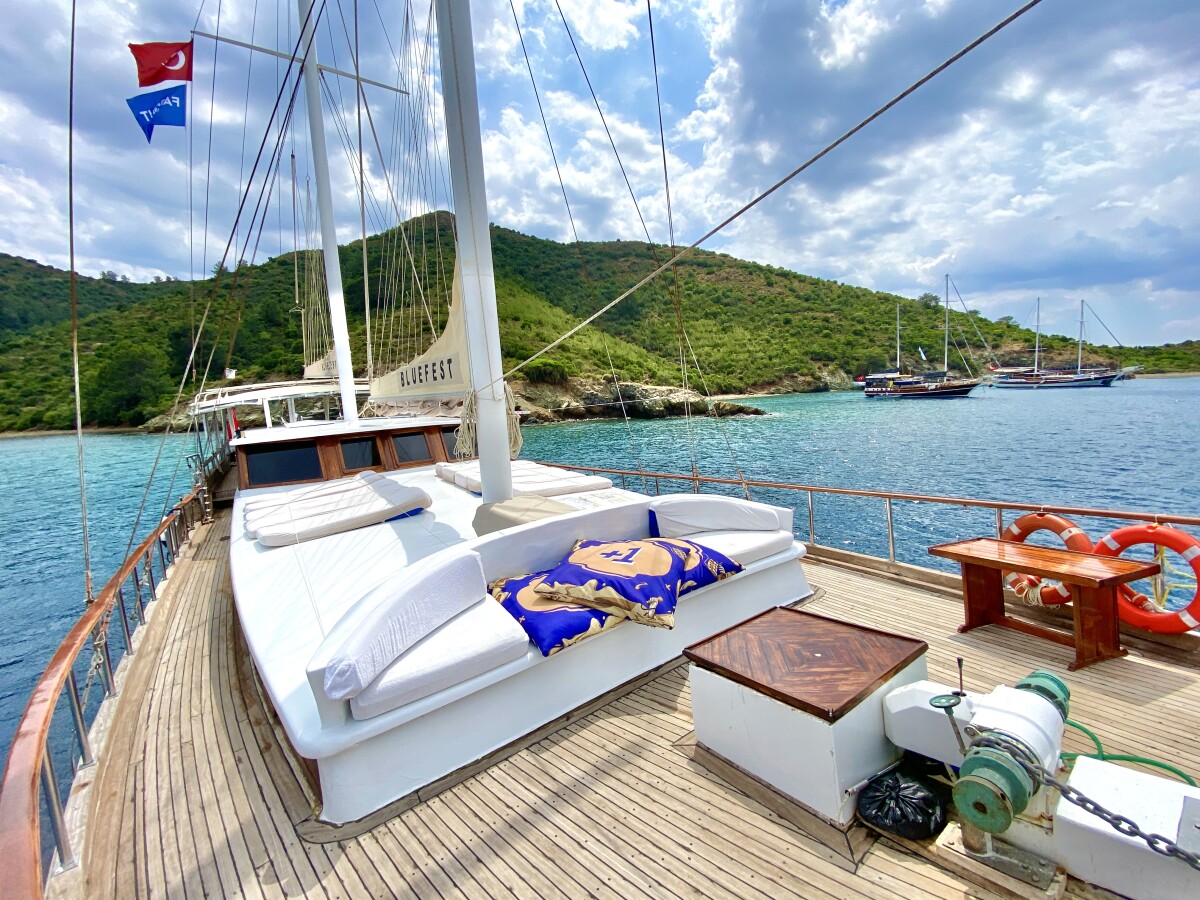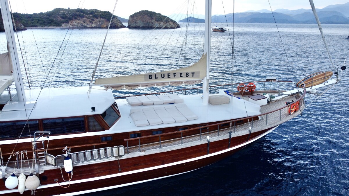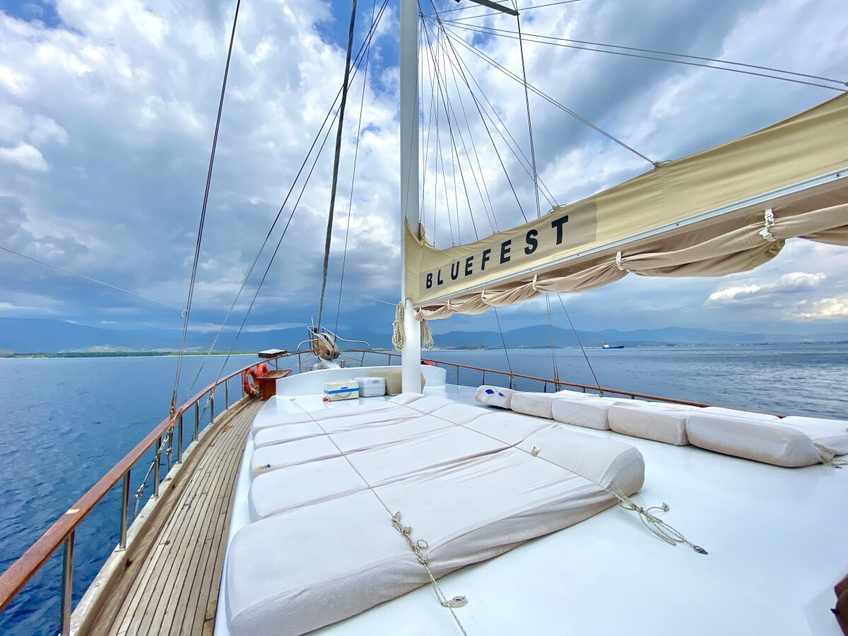 Bluefest ist eine 27 Meter lange, traditionelle Gulet, die Yachtcharter entlang der Süd- und Südwestküste der Türkischen Riviera anbietet. Die türkische Küste besticht durch ihren zeitlosen Charme. Die karische und lykische Küste bietet Besuchern eine Fülle an Sehenswürdigkeiten, kulinarischen Genüssen und kristallklarem, blauem Meer. Von dicht bewaldeten Hügeln bis hin zu luxuriösen Sandbuchten mit türkisfarbenem Wasser und von pinienbewachsenen Inseln bis zu lebhaften, farbenfrohen Hafenstädten – in diesem Teil des Mittelmeers finden Sie ruhige und entspannte Ankerplätze. Die Gulet bietet Platz für bis zu 18 Gäste in sieben klimatisierten Doppelkabinen und zwei klimatisierten Dreibettkabinen. Alle Kabinen verfügen über ein eigenes Bad, komfortable Betten und Stauraum. Der großzügige Innen- und Deckbereich der Yacht sorgt für Komfort an Bord. Ein gemütlich gestalteter Salon mit offener Küche und kleiner Bar lädt zum Verweilen im Schatten und zum Genießen der Kreuzfahrt ein. Das Achterdeck bietet einen geräumigen Sitz- und Essbereich für Mahlzeiten im Freien. Die großzügige Liegefläche am Heck lädt zum Entspannen nach dem Essen oder einfach zum Verweilen und Genießen der Aussicht im Schatten ein. Mittschiffs befindet sich eine leicht erhöhte Sonnenliegefläche, die ungestörten Blick in die Sonne ermöglicht. Für alle, die sich mit Blick auf die wunderschöne Landschaft zurücklehnen möchten, sind optional Sonnenschirme erhältlich. Eine lange Sitzbank mit Blick auf den Bug der Gulet bietet die Möglichkeit, die Aussicht während der Küstenfahrt zu genießen. Die professionell ausgebildete und freundliche Crew der Gulet steht Ihnen jederzeit an Bord zur Verfügung und wahrt diskret Ihre Privatsphäre. Sie haben die Gelegenheit, die köstlichen Gerichte der mediterranen und internationalen Küche sowie die Spezialrezepte Ihres Küchenchefs zu probieren.