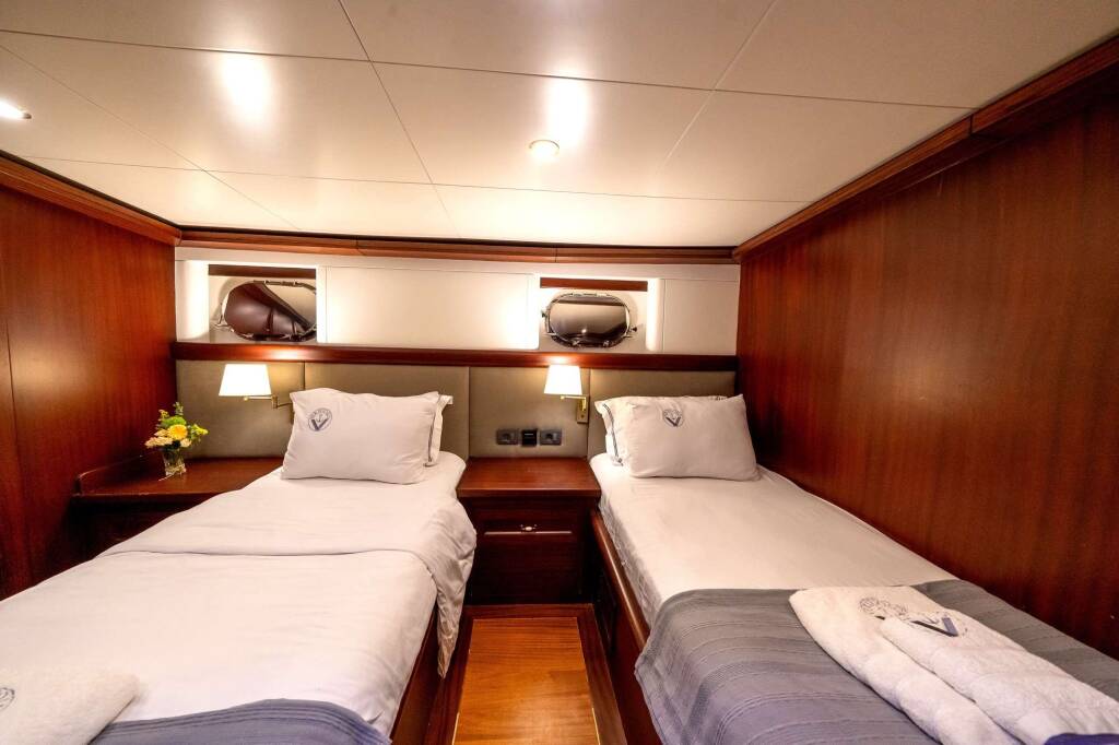 Master cabin: 180/200 cm; Double cabins: 160/200 cm; Twin: 90/200 cm.