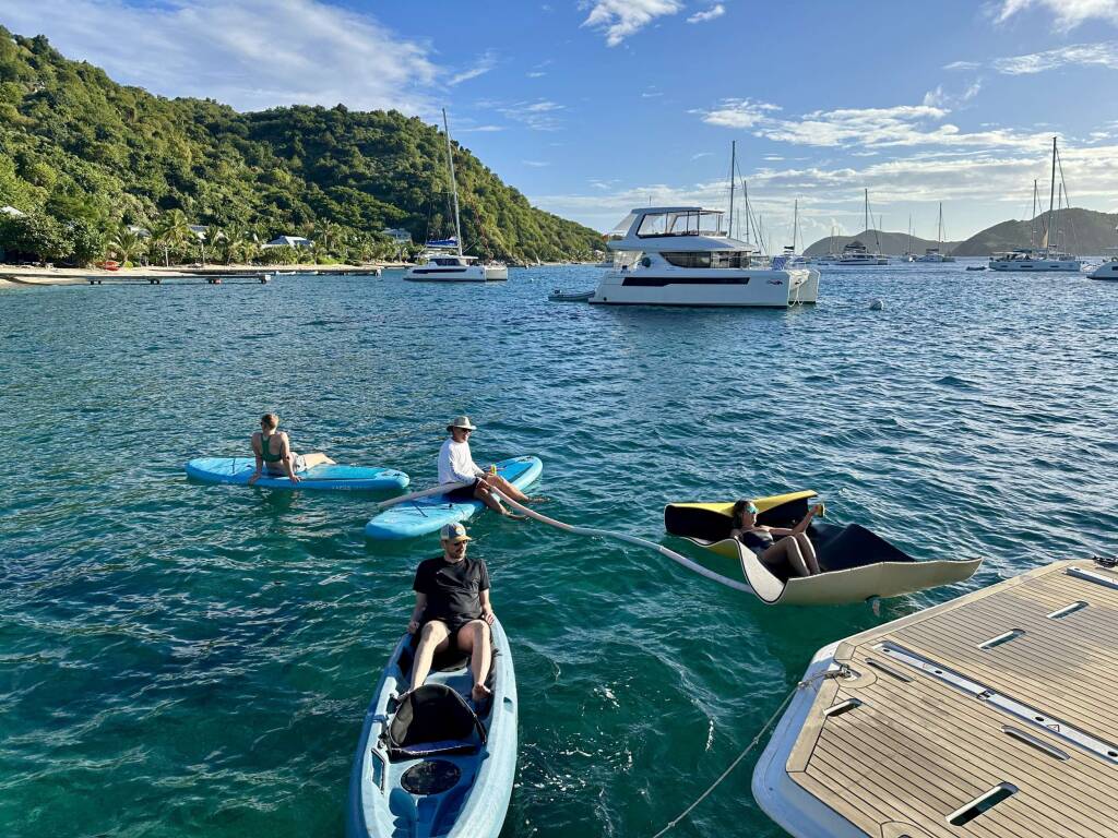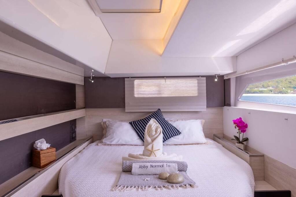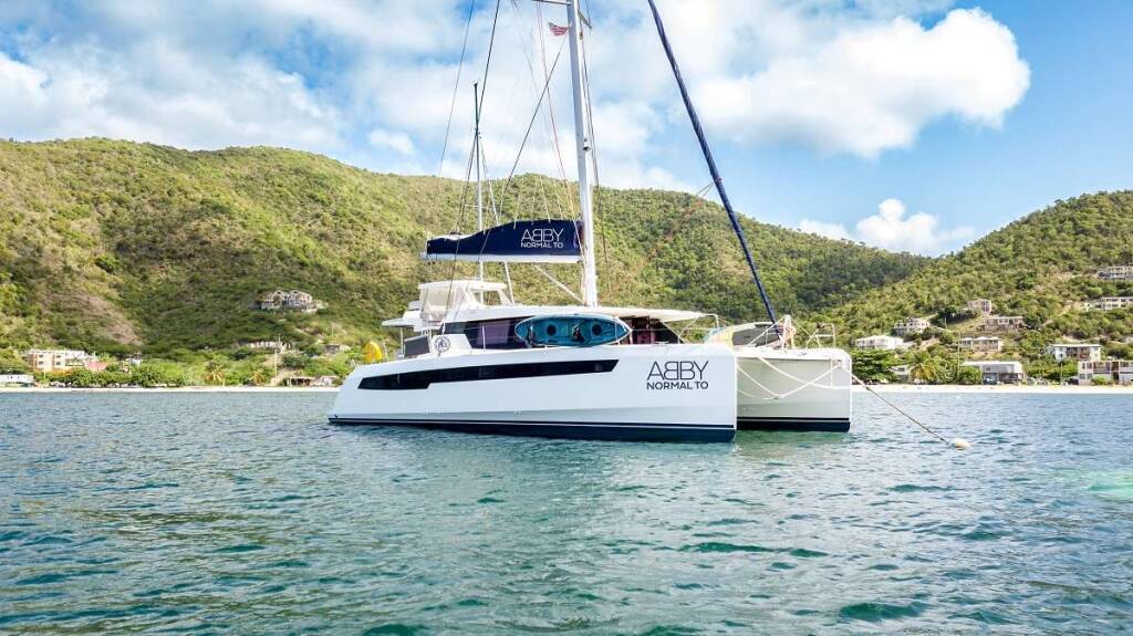 Luxus-Crew-Katamaran ABBY NORMAL TO, Baujahr 2019, liegt vor Anker in Caribbean Virgin Islands (BVI). Sie verfügt über 4 Kabinen und bietet Platz für 8 Personen.