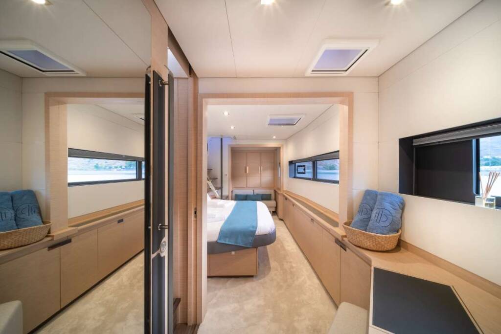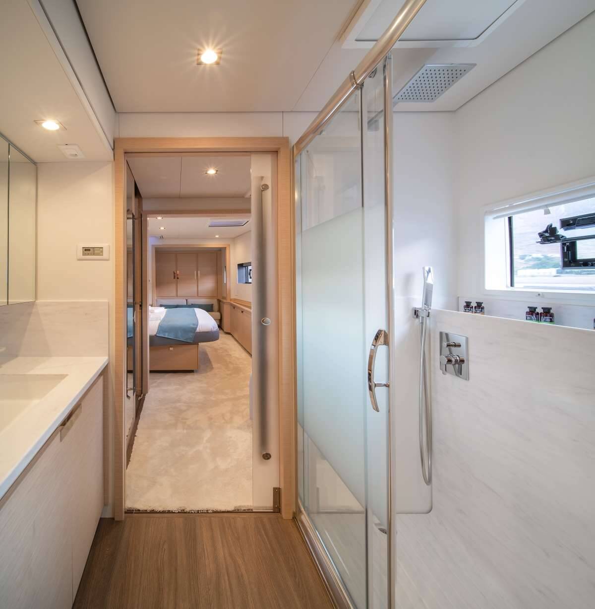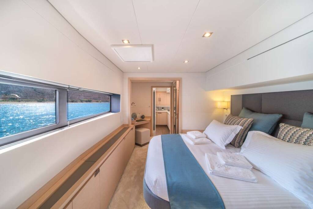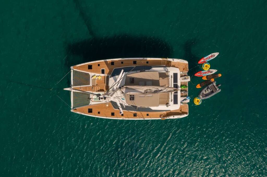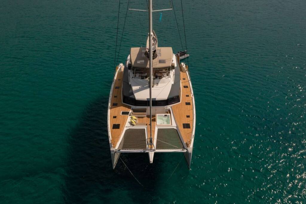 Luxus-Crew-Katamaran AETHER, Baujahr 2018, liegt vor Anker in Greece. Sie verfügt über 4 Kabinen und bietet Platz für 8 Personen.
