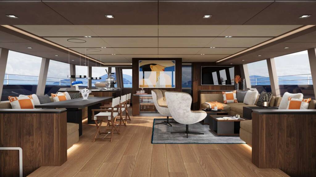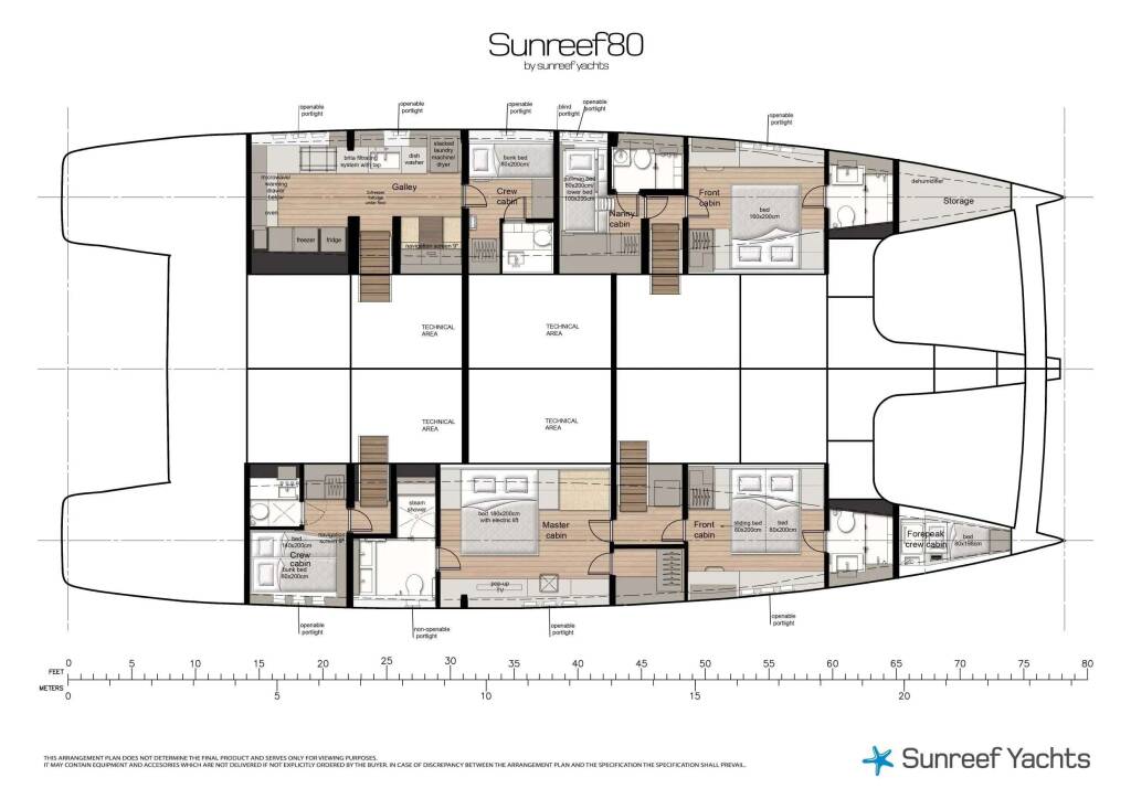 Luxus-Crew-Katamaran AHAVA, Baujahr 2025, liegt vor Anker in W. Med -Riviera/Cors/Sard.. Sie verfügt über 4 Kabinen und bietet Platz für 8 Personen.