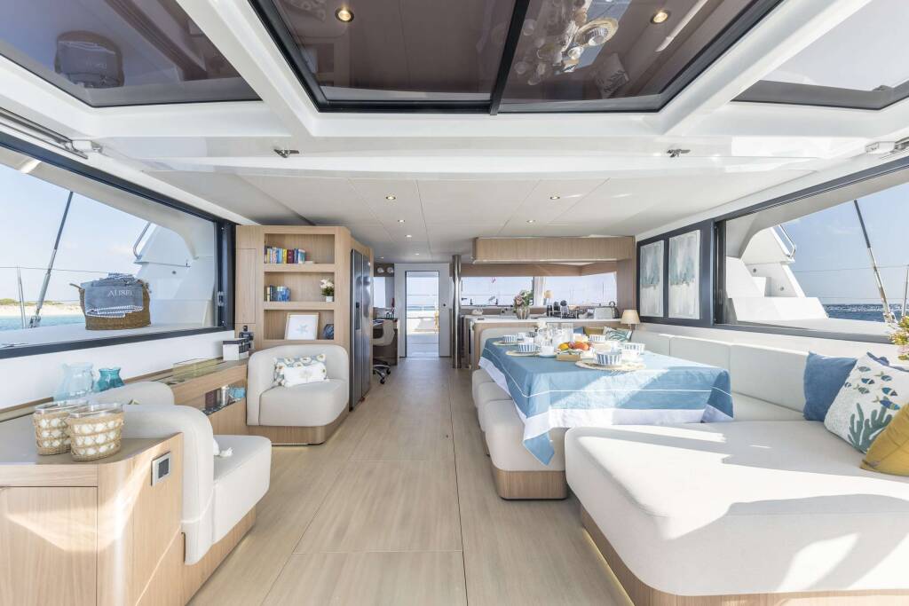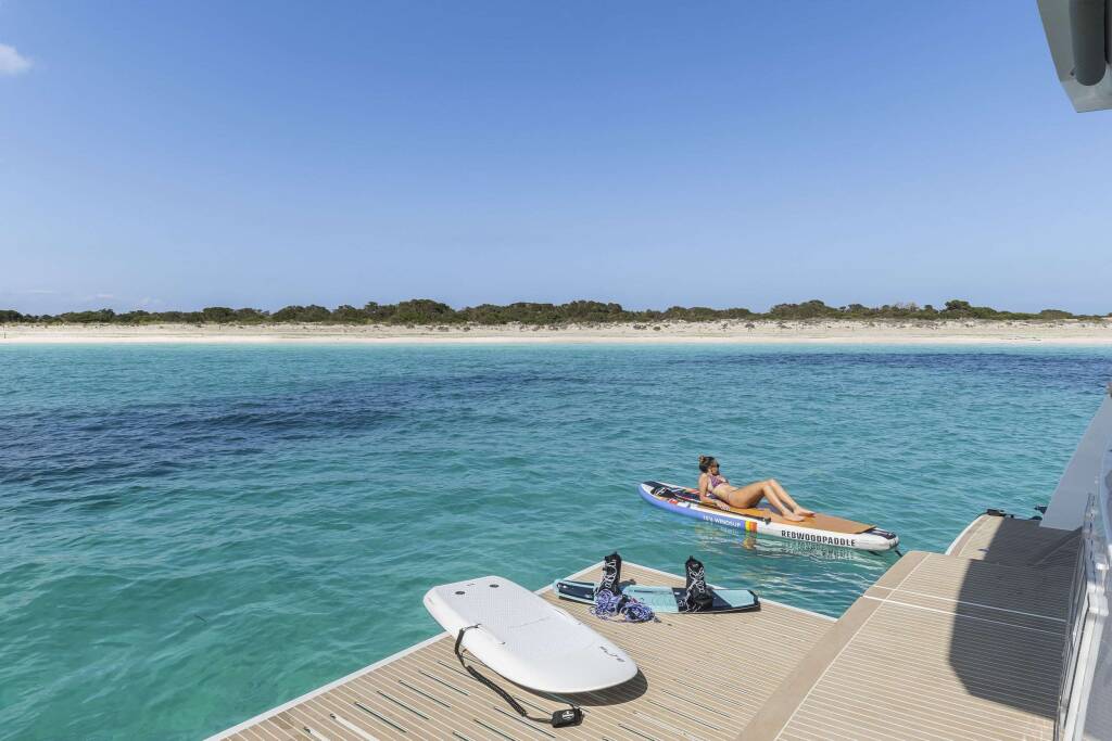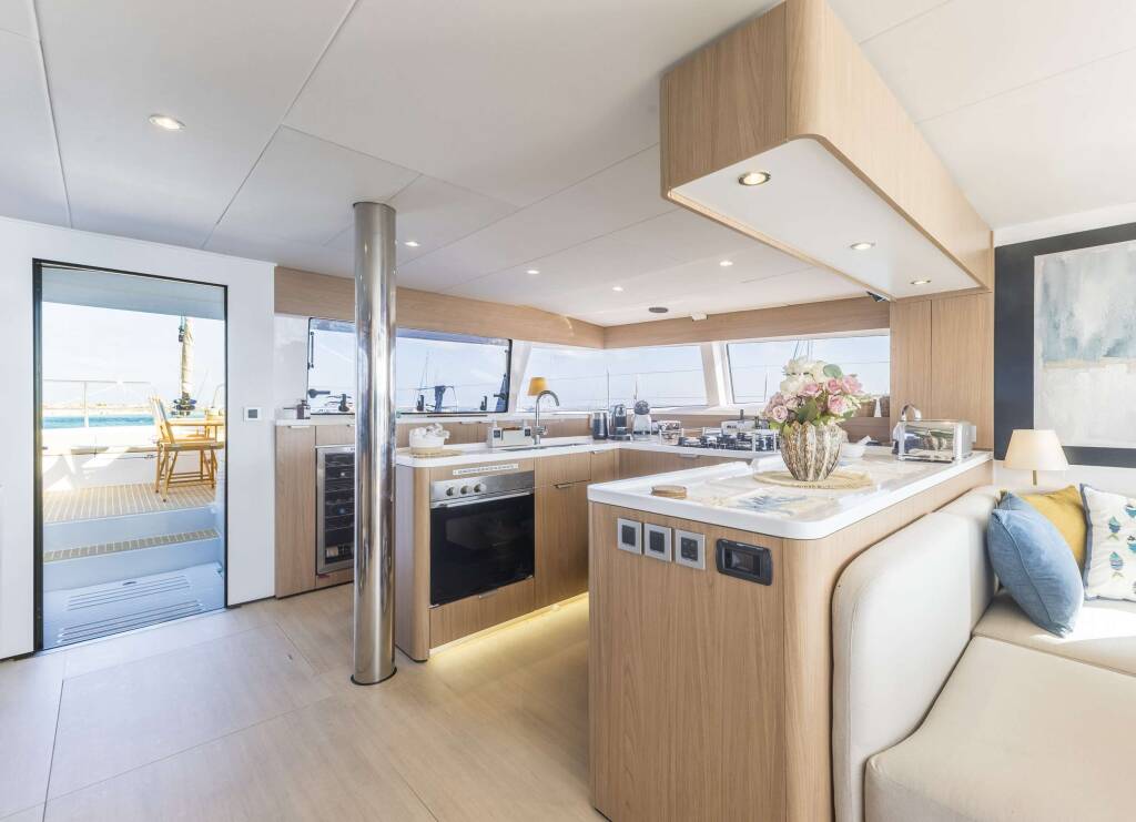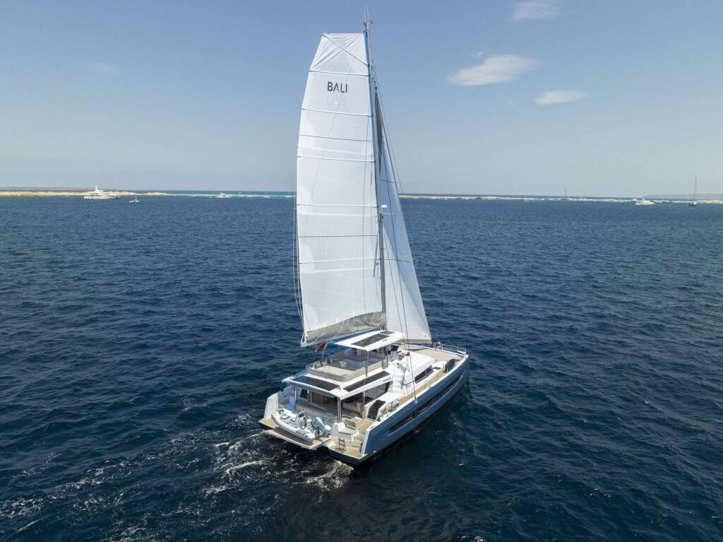 Luxus-Crew-Katamaran ALISEI, Baujahr 2025, liegt vor Anker in W. Med -Naples/Sicily. Sie verfügt über 4 Kabinen und bietet Platz für 8 Personen.