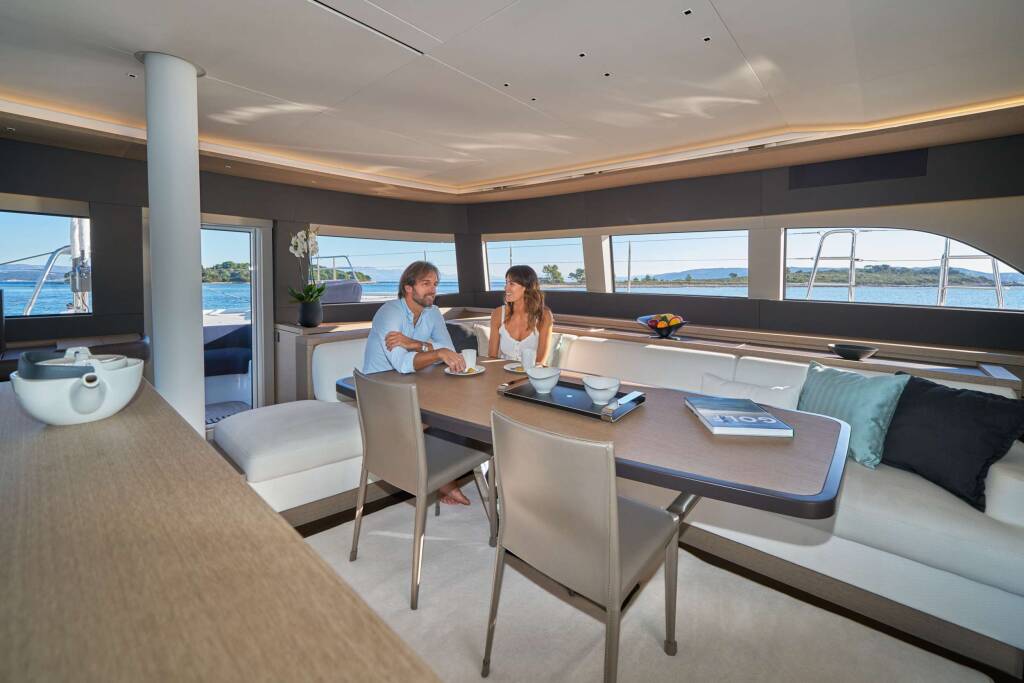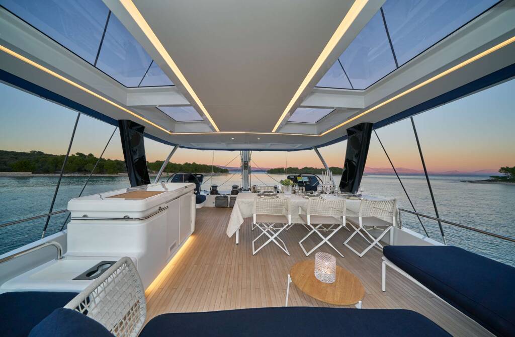 Luxus-Crew-Katamaran AMADA MIA, Baujahr 2021, liegt vor Anker in Croatia, Montenegro. Sie verfügt über 4 Kabinen und bietet Platz für 8 Personen.