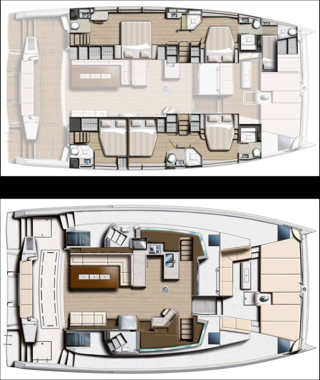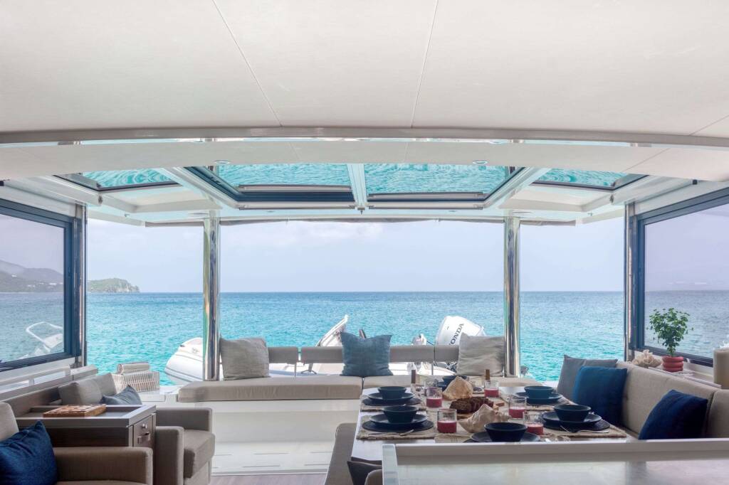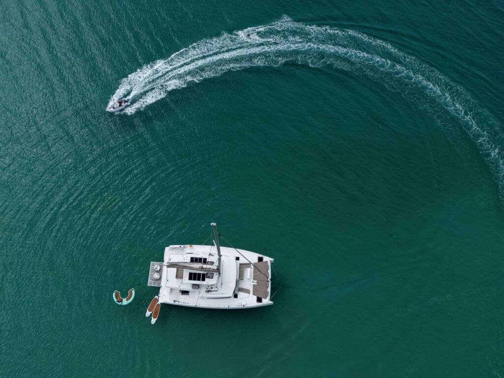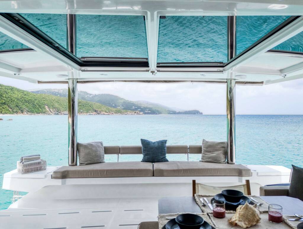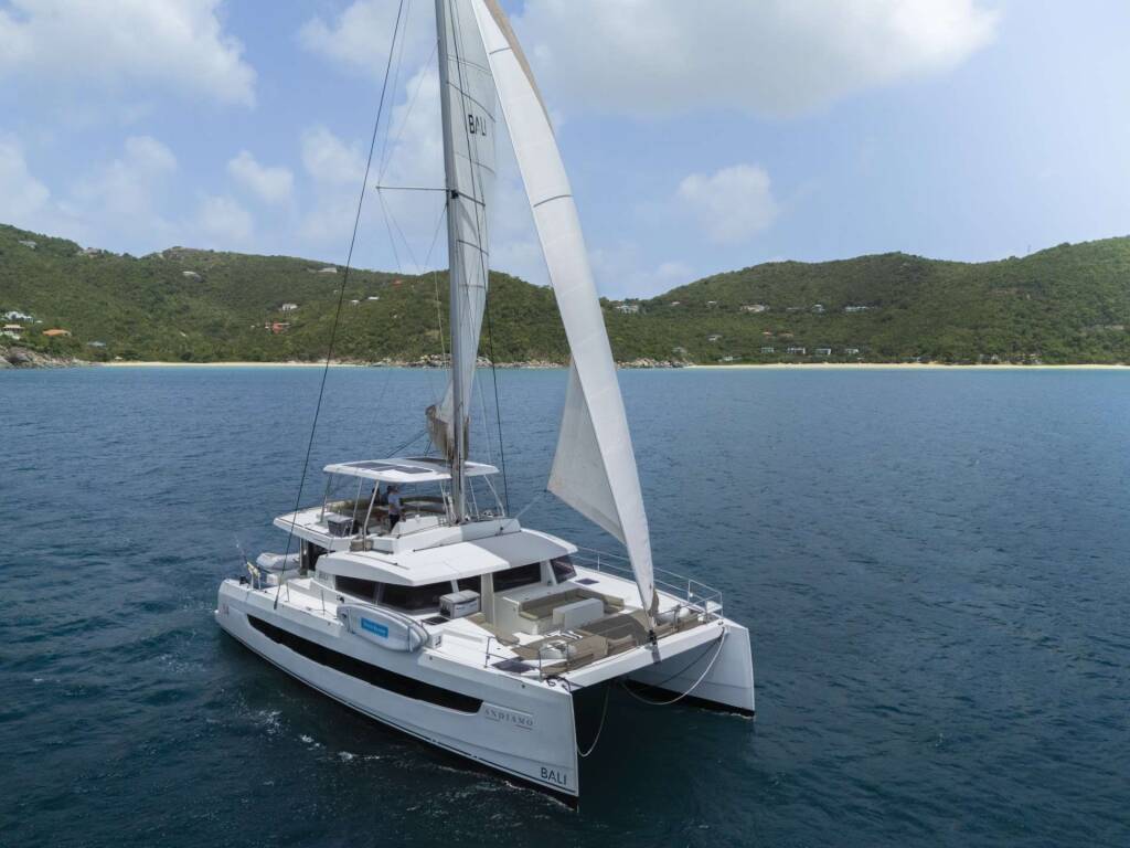 Luxus-Crew-Katamaran ANDIAMO, Baujahr 2023, liegt vor Anker in Caribbean Leewards, Caribbean Virgin Islands (BVI). Sie verfügt über 4 Kabinen und bietet Platz für 8 Personen.