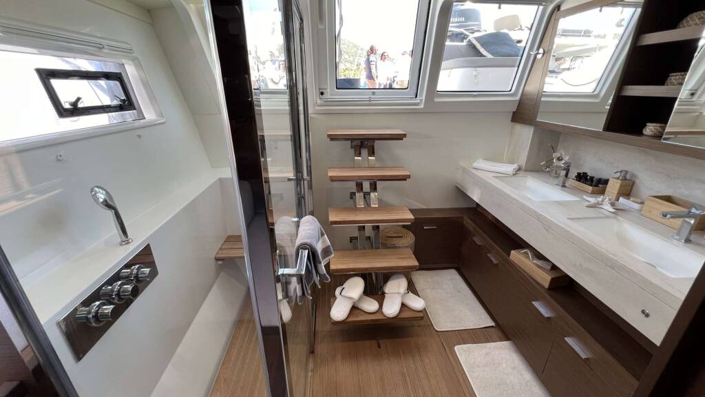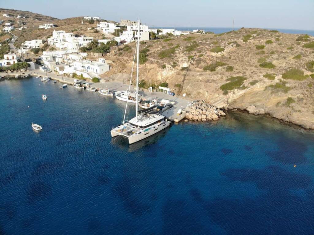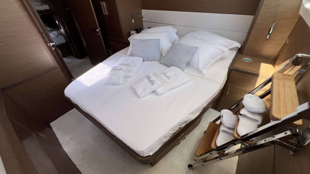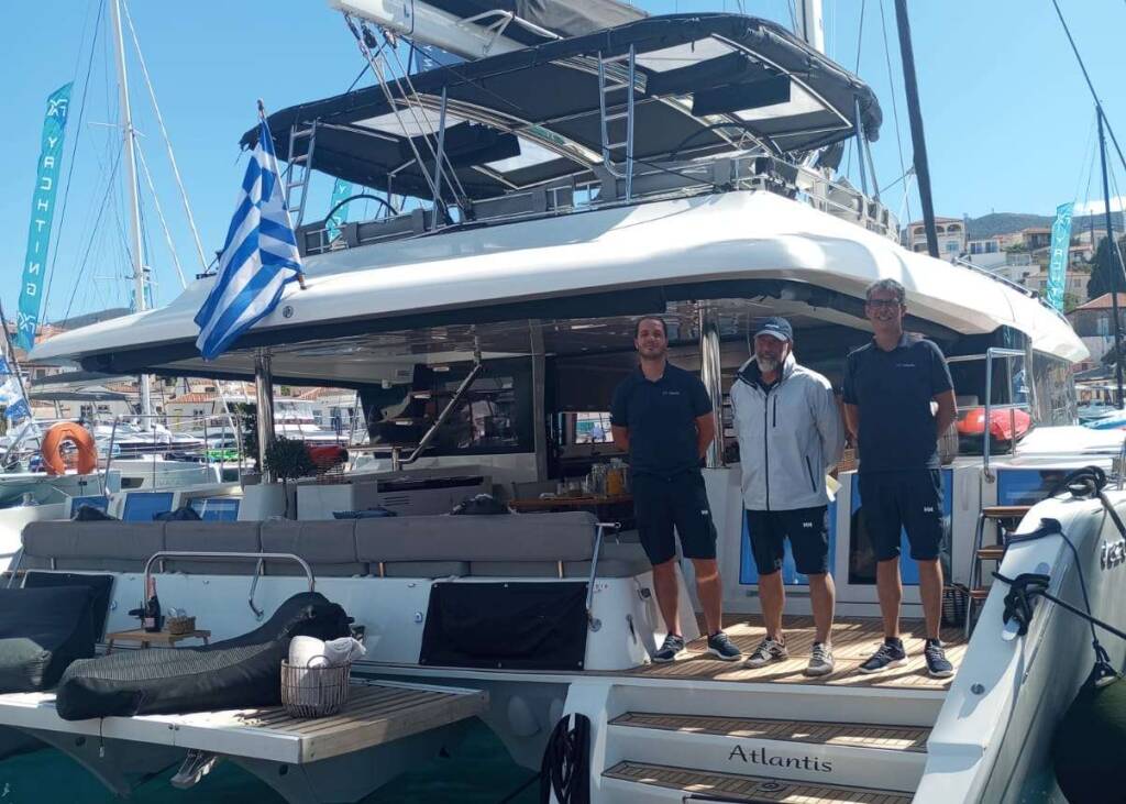 Luxus-Crew-Katamaran ATLANTIS, Baujahr 2020, liegt vor Anker in Greece. Sie verfügt über 4 Kabinen und bietet Platz für 8 Personen.