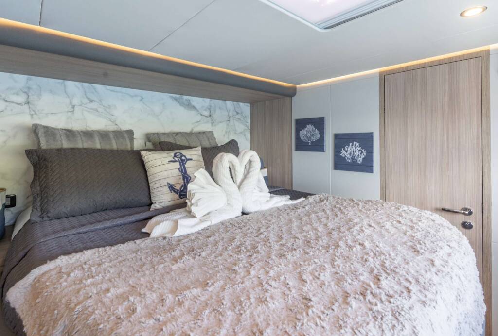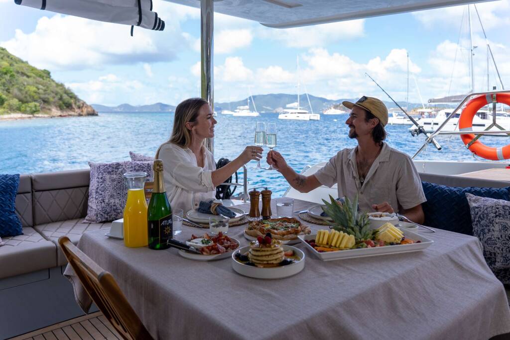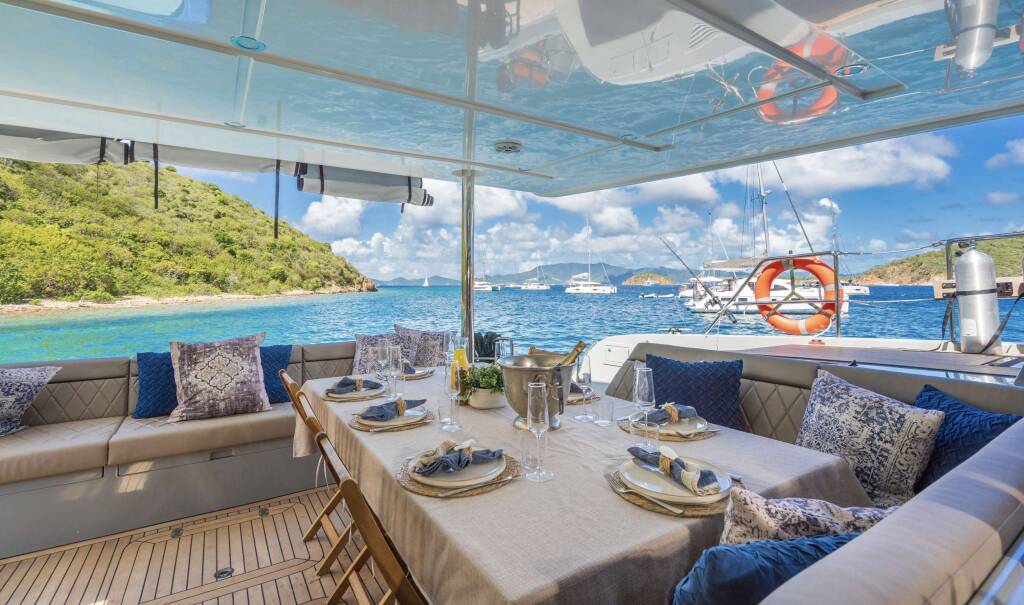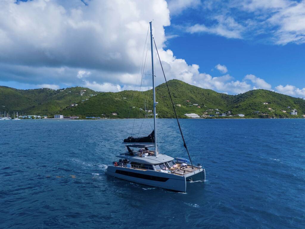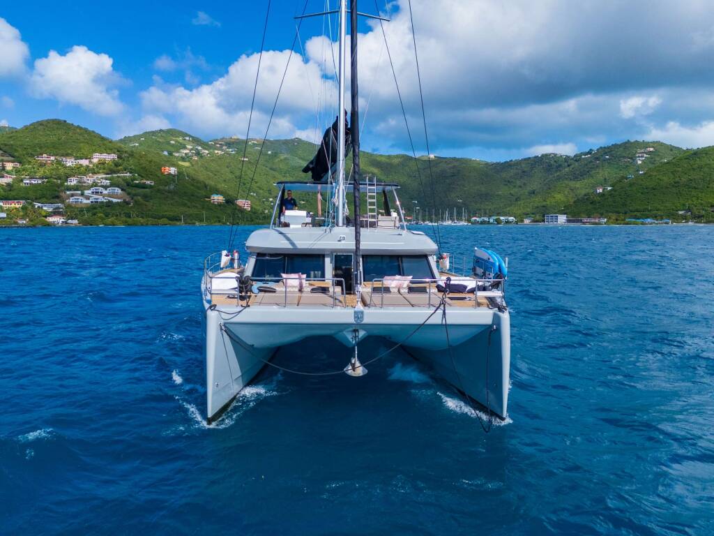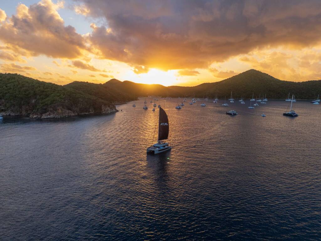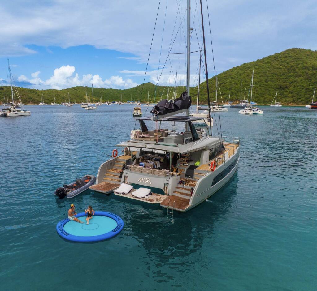 Luxus-Crew-Katamaran ATLAS, Baujahr 2025, liegt vor Anker in Caribbean Virgin Islands (US/BVI), Caribbean Virgin Islands (US). Sie verfügt über 7 Kabinen und bietet Platz für 12 Personen.