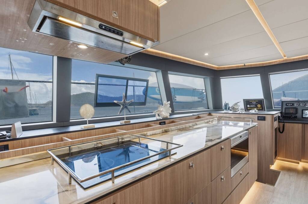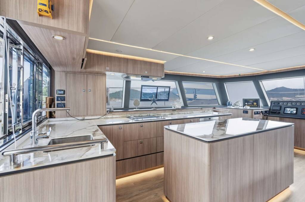 Green Other: 1700 watts of solar panels on the bimini roof and a large 58kwh Lithium battery bank that can operate the air conditioning for 8 hours without using a generator, reducing noise and fossil fuel use, especially at night while guests are sleeping. The vessel also uses electric induction cooking rather than traditional propane.