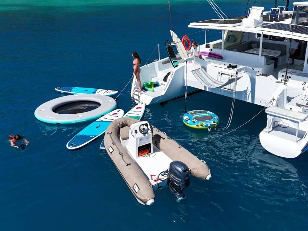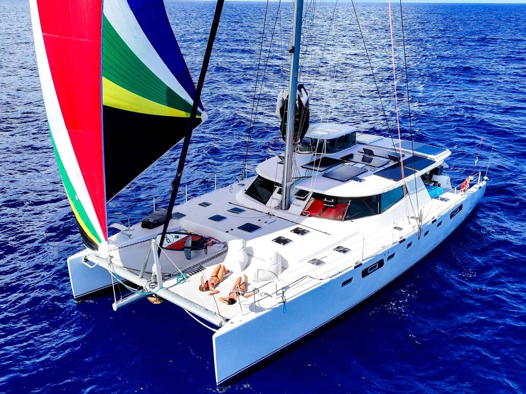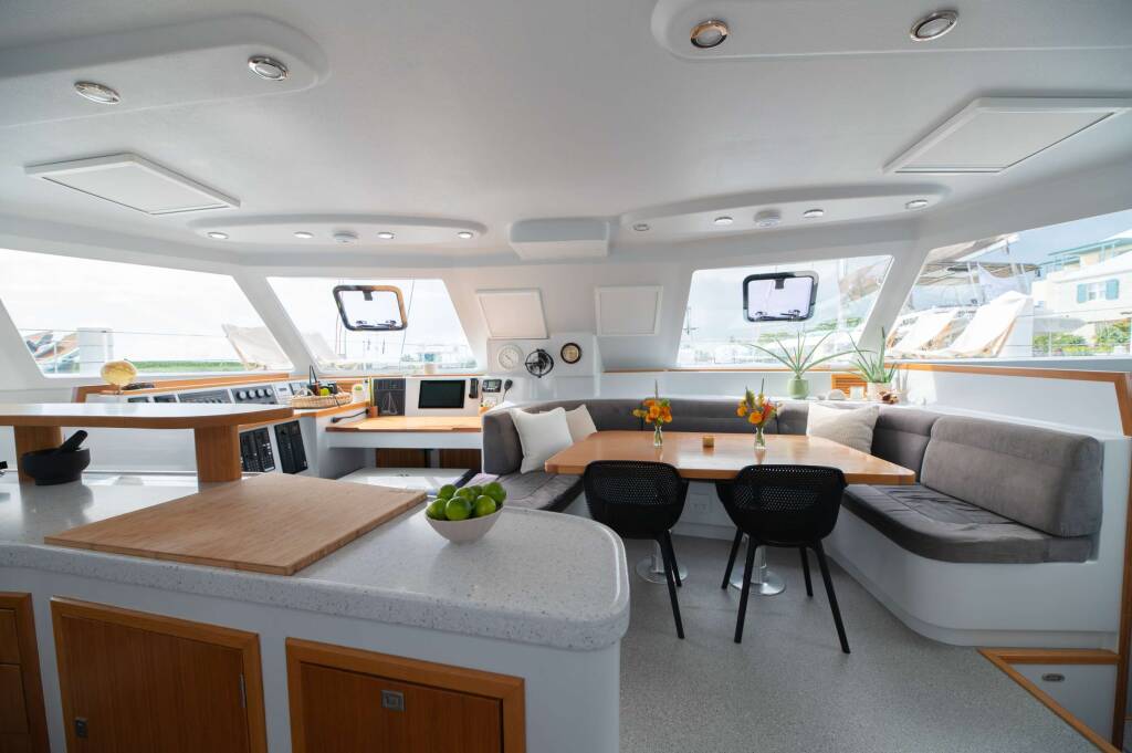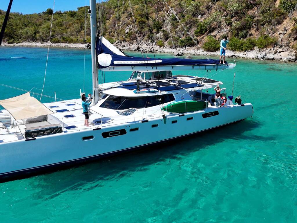 Luxus-Crew-Katamaran AWATEA, Baujahr 2019, liegt vor Anker in Caribbean Windwards, Caribbean Virgin Islands (BVI). Sie verfügt über 5 Kabinen und bietet Platz für 10 Personen.