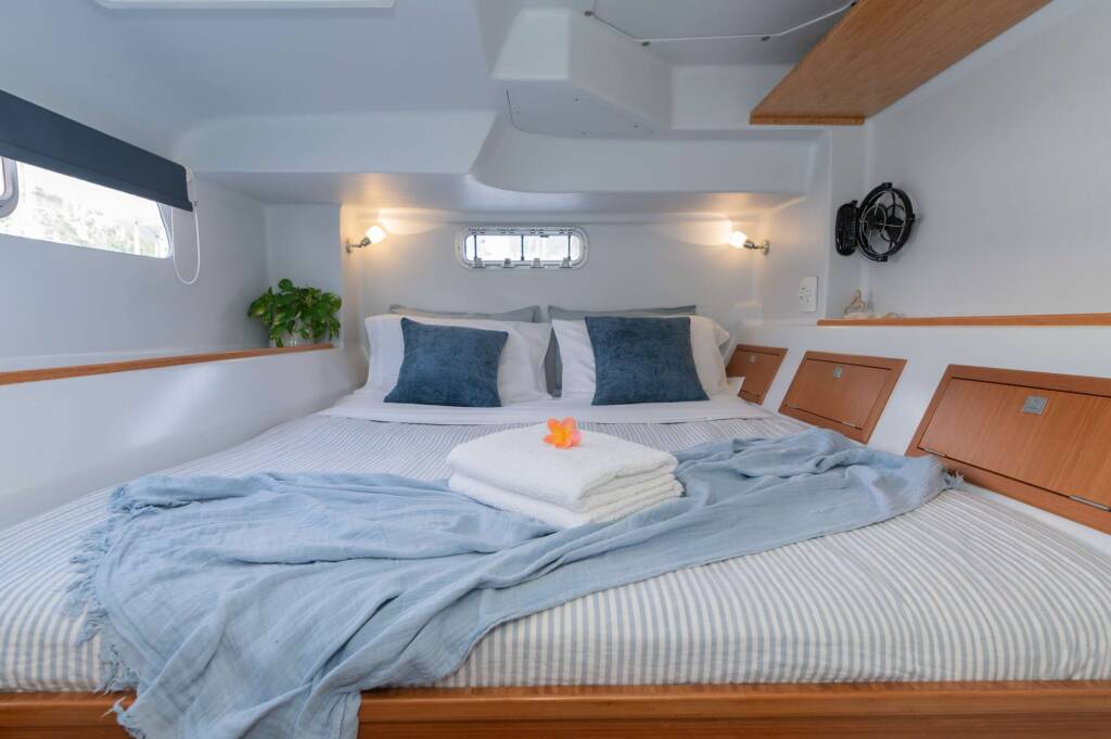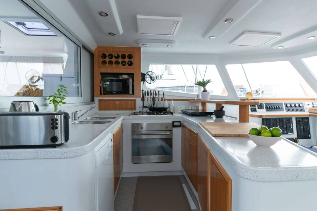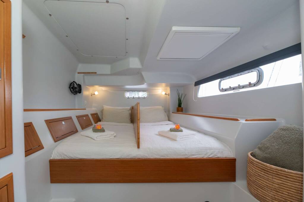 Following his superyacht years, he returned to NZ to pursue a bachelor's degree in marine and coastal ecology, which is where he met his wife, Chef Olivia. After graduating, the two went on to live a life of adventure. Starting out renovating their home and living a self-sufficient life on 10 acres in the remote bush of West Coast, NZ. They spent 3 years renovating their property and learning to grow enough food to feed their new family. Their first child, Ivy was born there followed by another, Angus. By the time the third was due the pair had had their fill of the wild country and were ready to return to the pristine beaches and ideal boating grounds of the winterless North (of NZ that is). They had their third child there and spent the next couple years enjoying all that Northland had to offer. Fraser got a job as engineer on a coastal tug and barge then was handpicked by the company owner to run their oyster farm operation. However Fraser soon began to get itchy feet and felt as though he was starting to dry out so he began to search for catamarans.