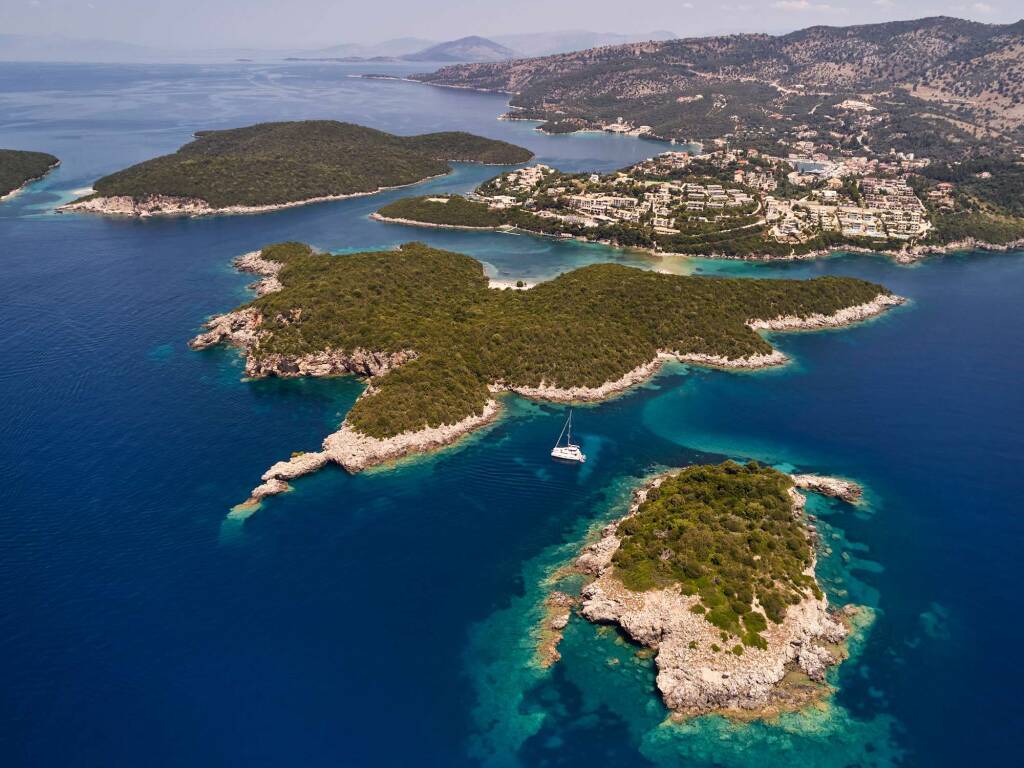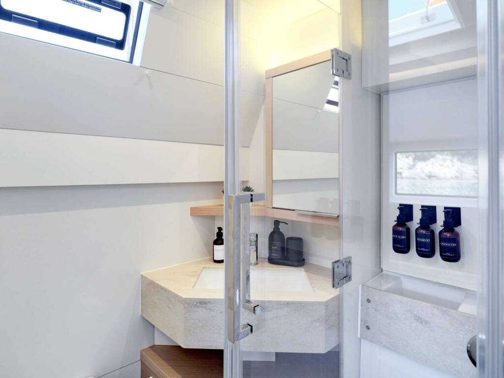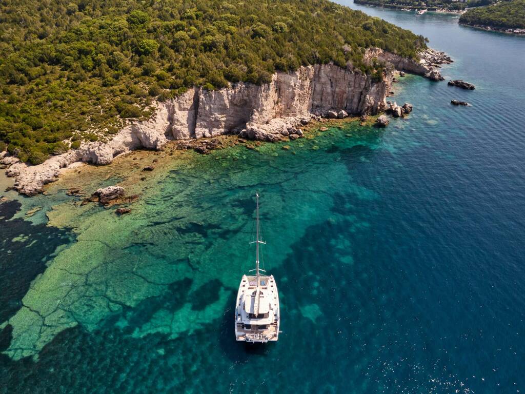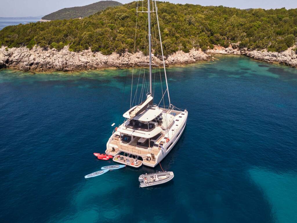 Luxus-Crew-Katamaran AZUL, Baujahr 2023, liegt vor Anker in Greece. Sie verfügt über 4 Kabinen und bietet Platz für 8 Personen.