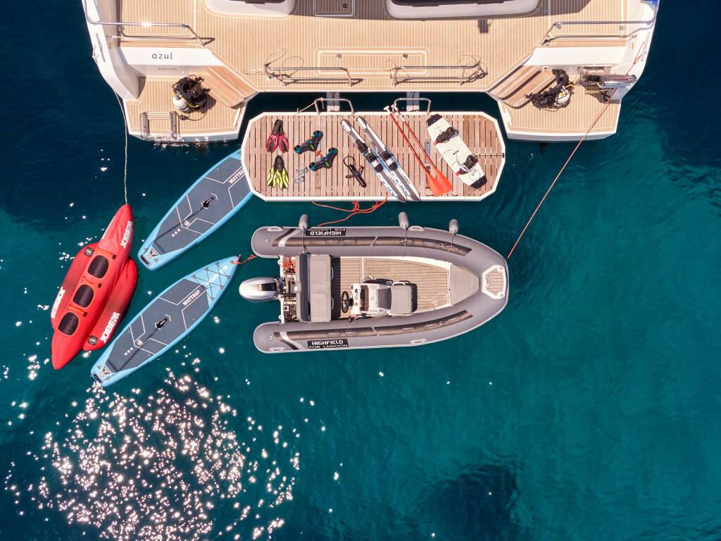 Other Toys: Tender Highfield CL 420 with 60hp outboard, Seascooter x2, SUP x2, Seabob (iAqua Dart Nano 720 Xtreme), Wakeboard, Water ski adults, Fishing equipment, snorkeling equipment, Tubes. Dive tanks and dive compressor on request and extra charge (for certified divers only with prooven diving experience), BCD, Regulator, etc. to be rented from a local dive store, or provided by the client)