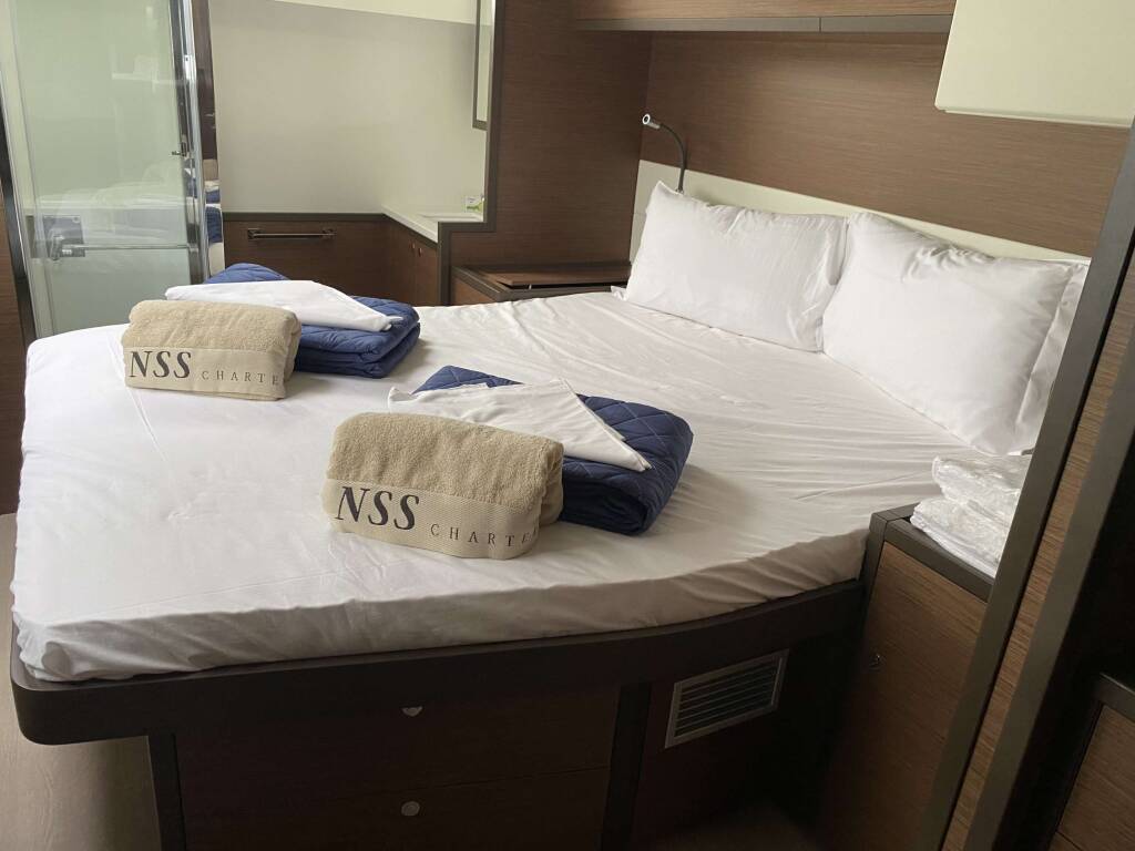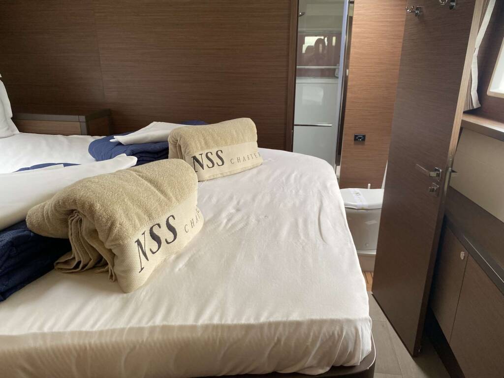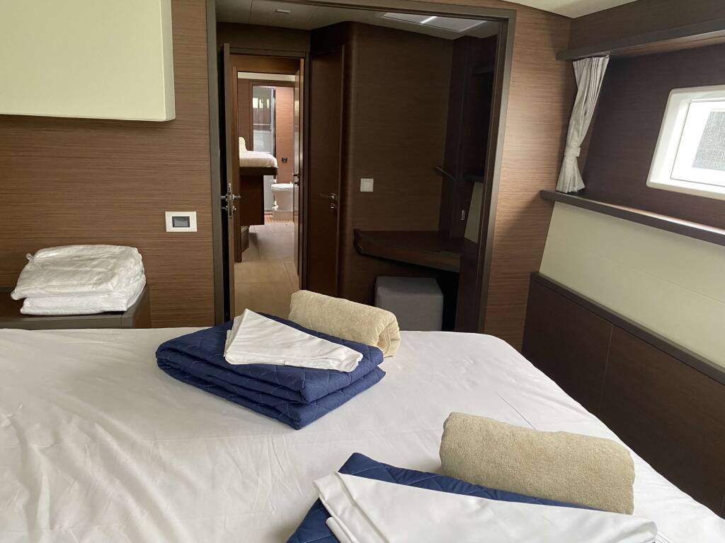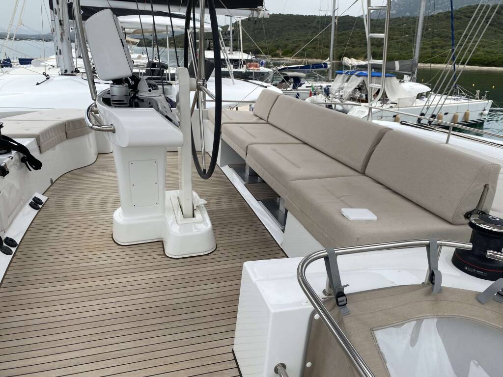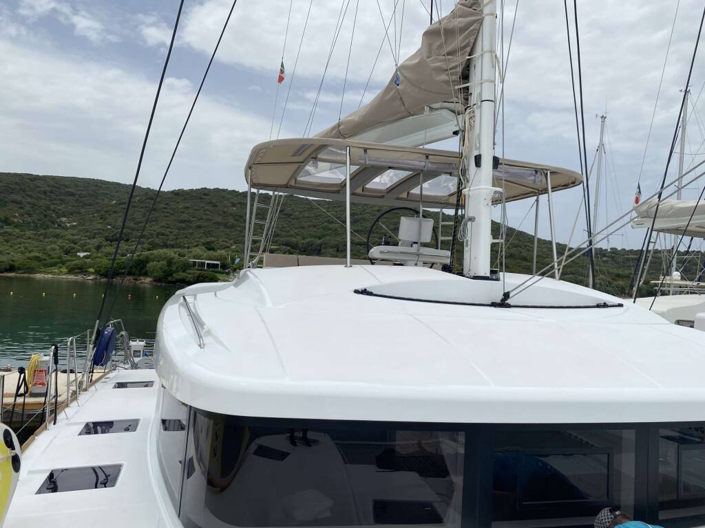 Luxus-Crew-Katamaran Big Daddy, Baujahr 2022, liegt vor Anker in W. Med -Riviera/Cors/Sard.. Sie verfügt über 5 Kabinen und bietet Platz für 10 Personen.