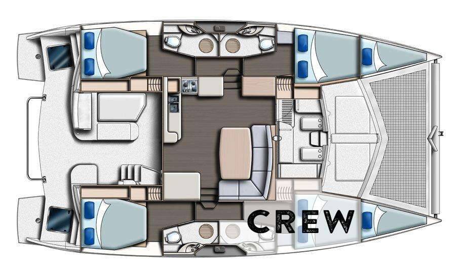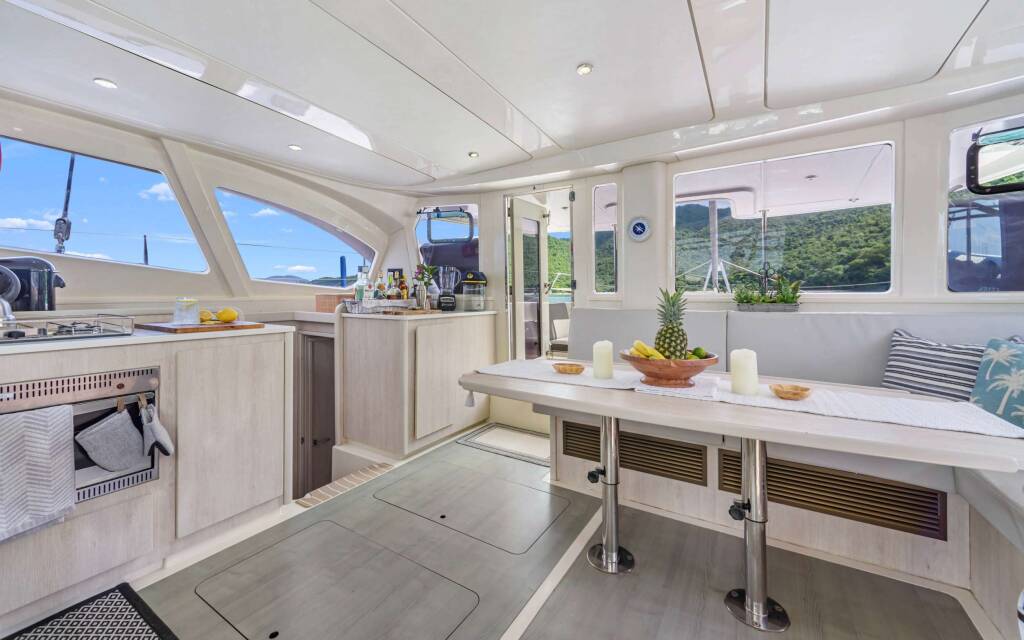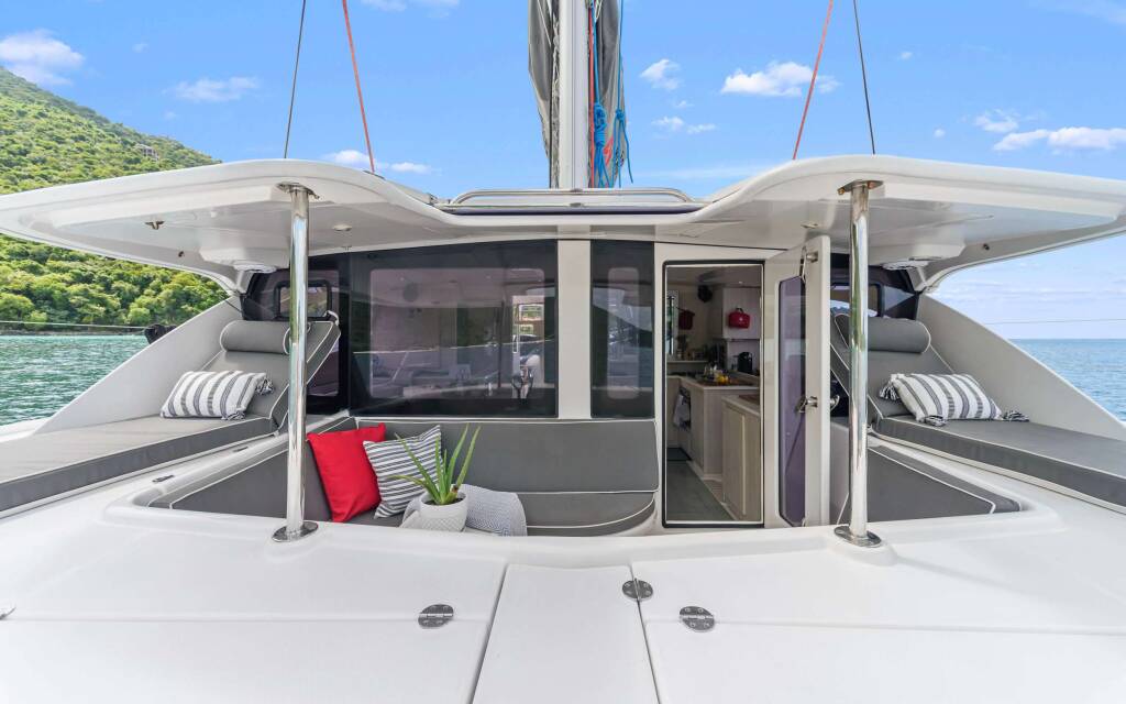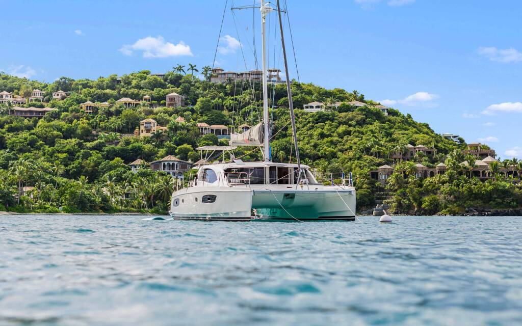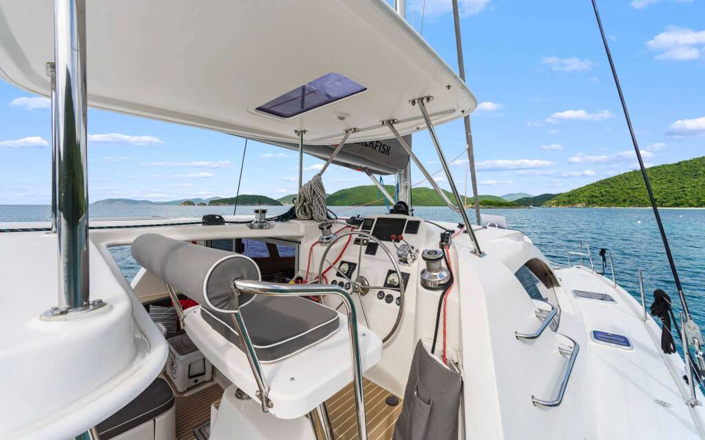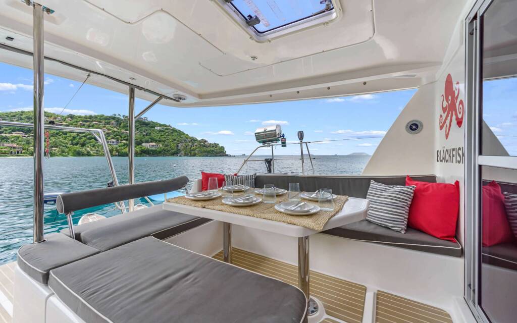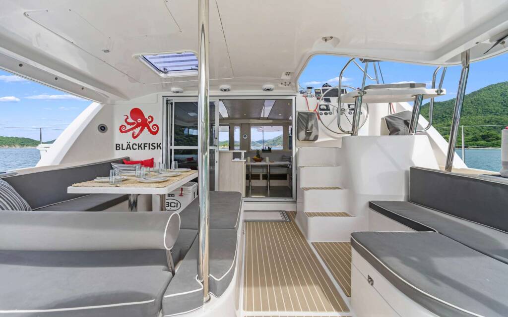Luxus-Crew-Katamaran BLACKFISK, Baujahr 2015, liegt vor Anker in Caribbean Virgin Islands (US/BVI), Caribbean Virgin Islands (US). Sie verfügt über 3 Kabinen und bietet Platz für 6 Personen.