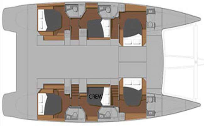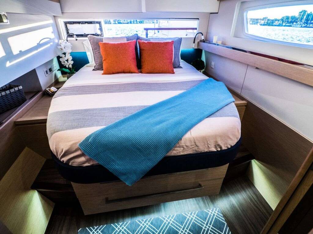 Accommodation: 5 spacious and well appointed staterooms each with en-suite dry bathrooms and separate stall showers. Toilets are all electric and have single press flush cycle. Headroom in cabins and saloon is just over 6’ 8”, toilet is 6’ 7” and shower stall is 6’ 11”. Cockpit has 6’ 11” of headroom. Yacht has quiet central A/C for guest comfort and each stateroom has individual A/C controls. Fly-bridge has full bimini over upper lounge area for shade.