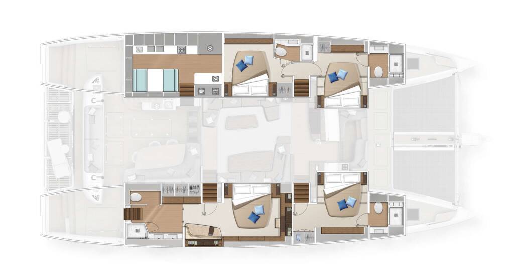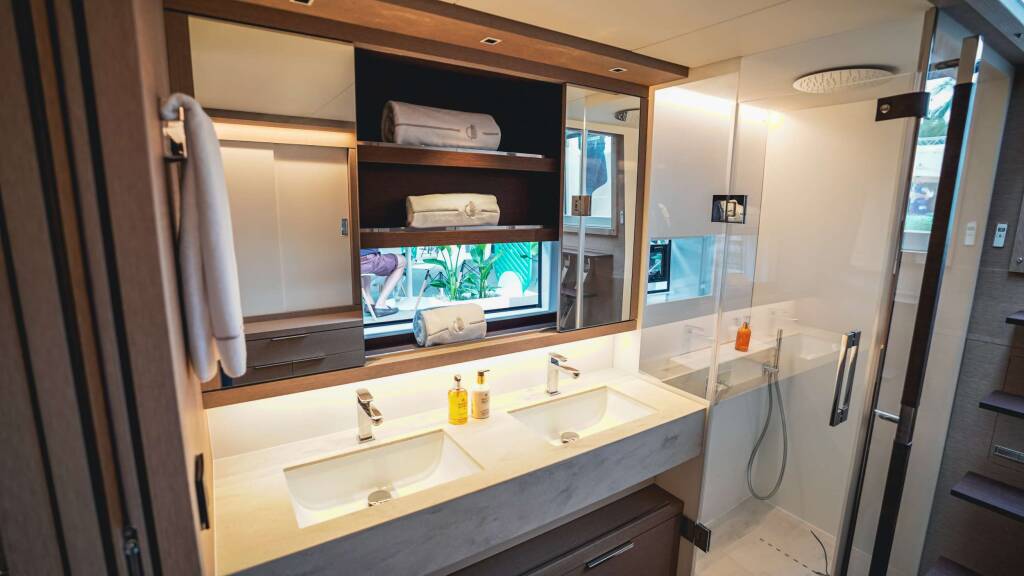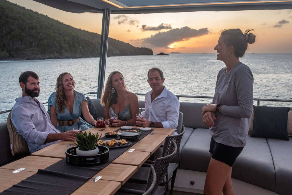 Luxus-Crew-Katamaran C'EST LA VIE, Baujahr 2022, liegt vor Anker in Caribbean Virgin Islands (US/BVI), Caribbean Leewards. Sie verfügt über 4 Kabinen und bietet Platz für 8 Personen.