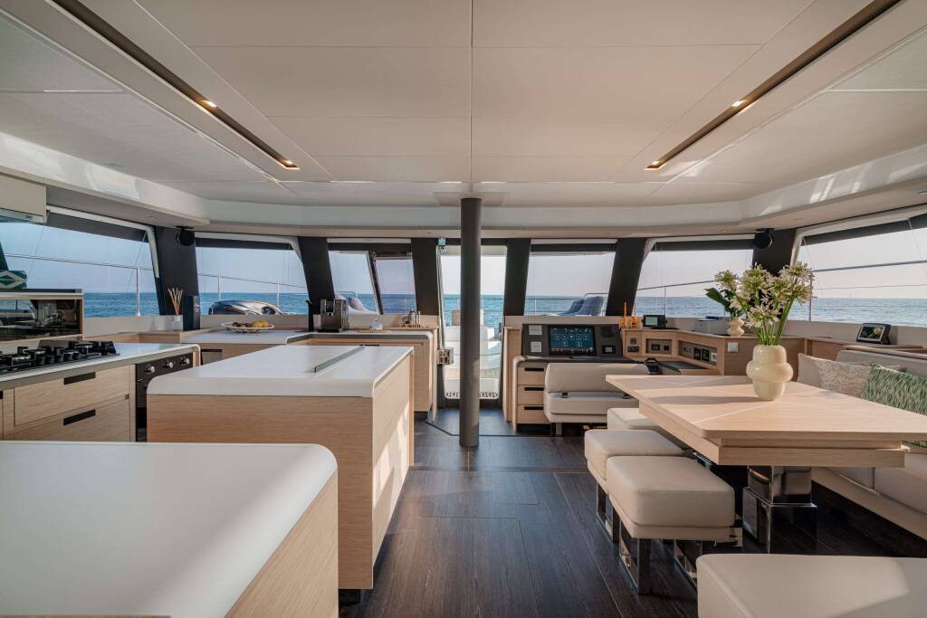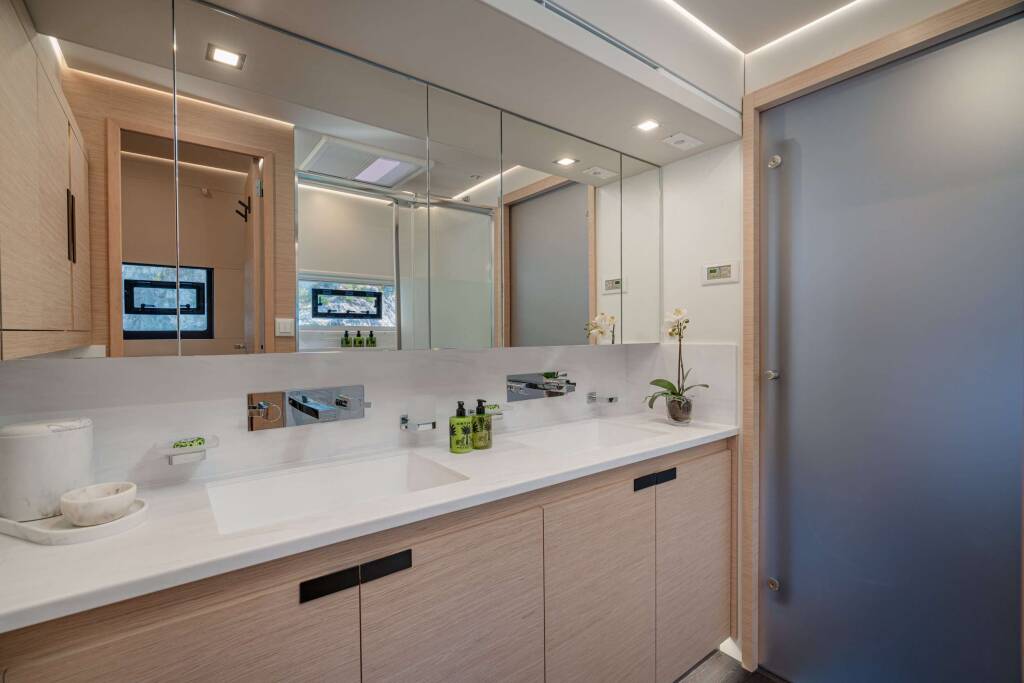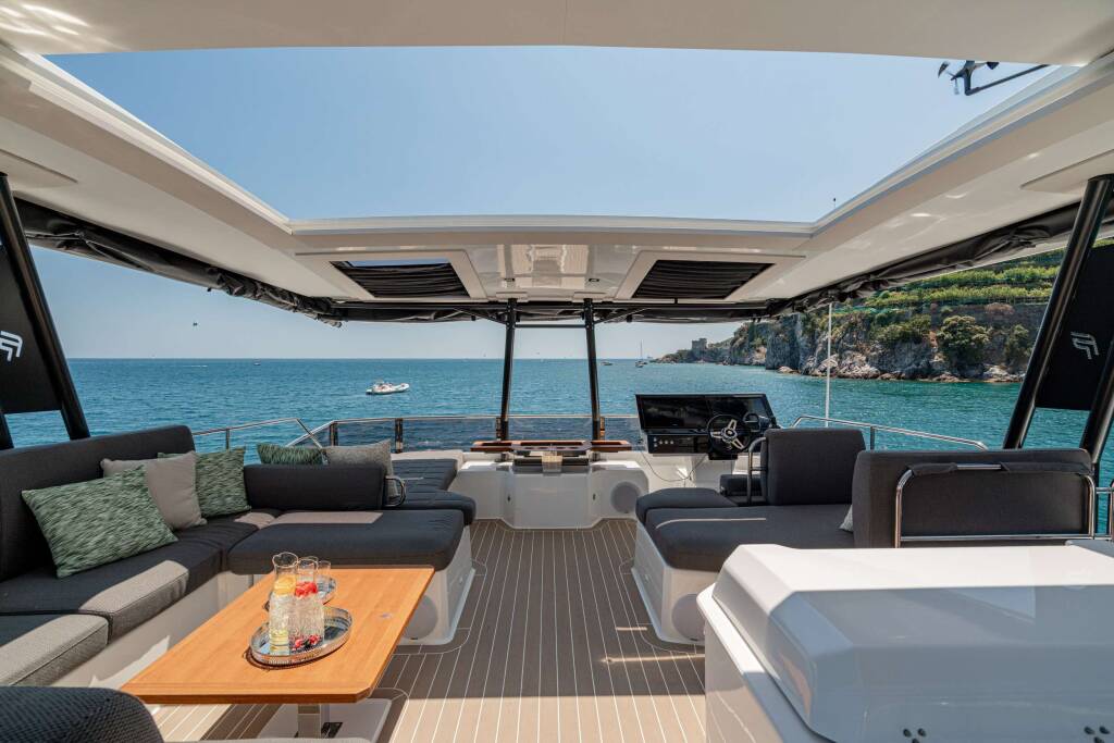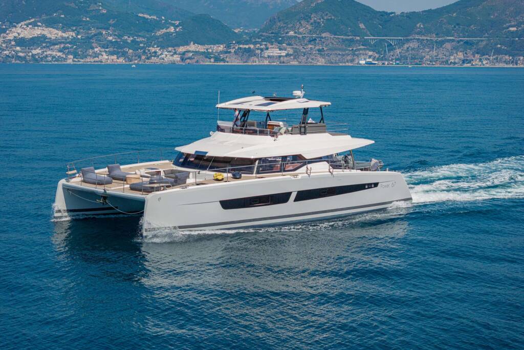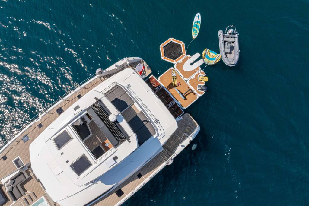Luxus-Crew-Katamaran CORE, Baujahr 2024, liegt vor Anker in W. Med -Naples/Sicily. Sie verfügt über 4 Kabinen und bietet Platz für 8 Personen.