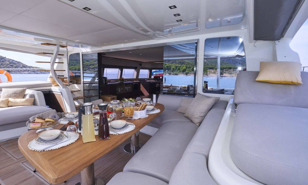 Luxus-Crew-Katamaran CRAZY HORSE, Baujahr 2019, liegt vor Anker in Greece. Sie verfügt über 5 Kabinen und bietet Platz für 10 Personen.