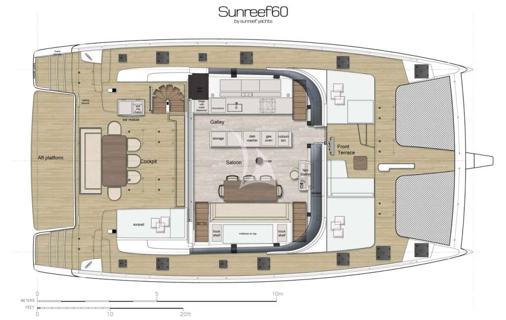 Spacious cockpit featuring a big dining table for 8, a cozy sofa, combined with a stylish and functional galley create a semi-open lounging area.