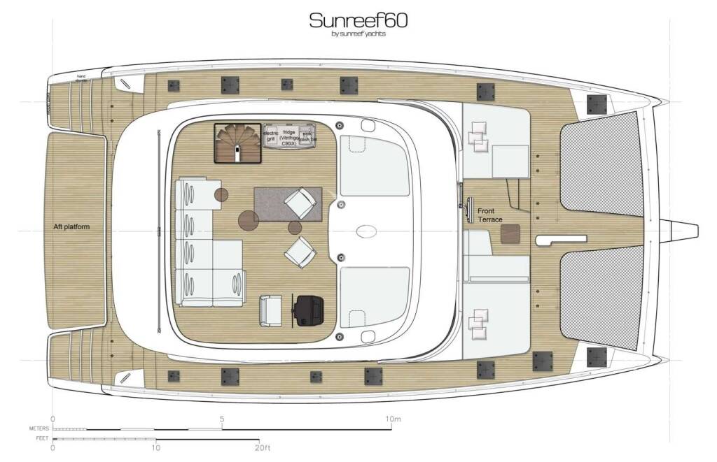 Large Flybridge is equipped with BBQ and large stylish Flexform lounging sofas, cushions and sunbeds.