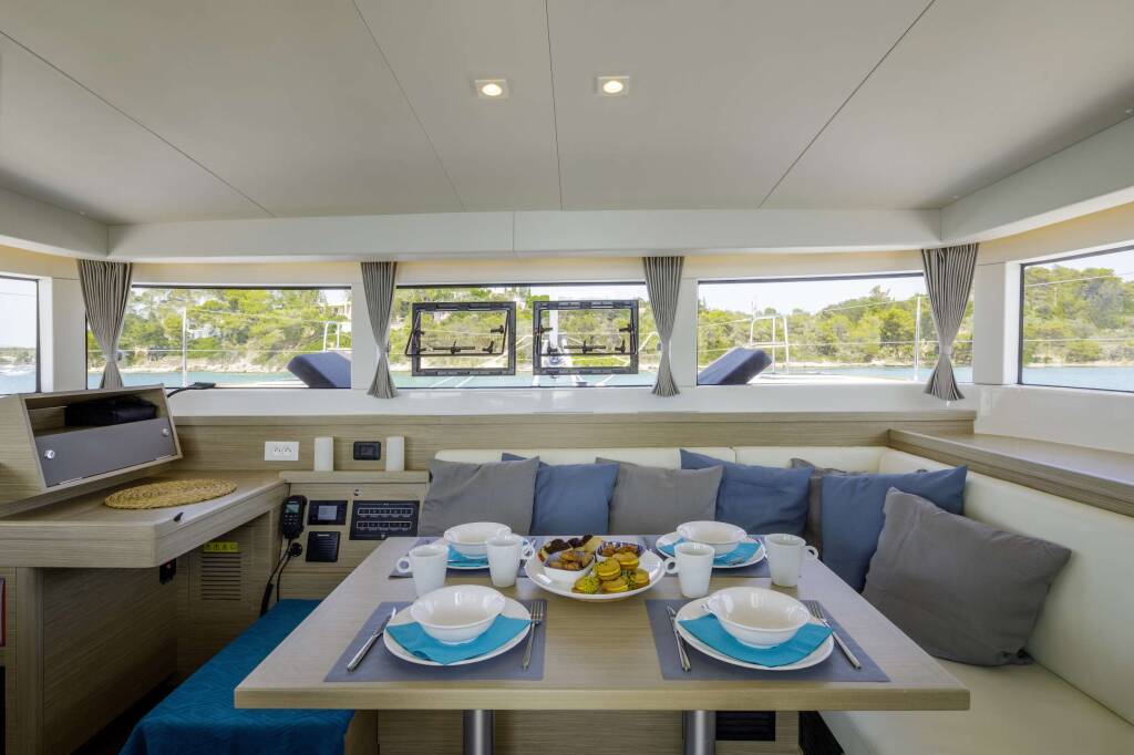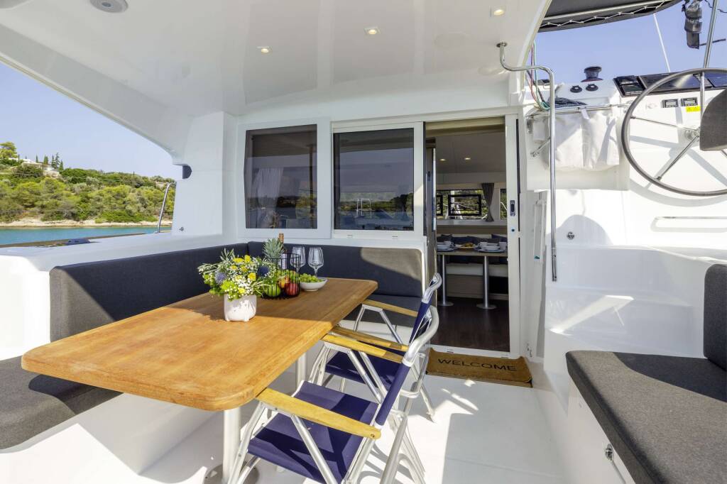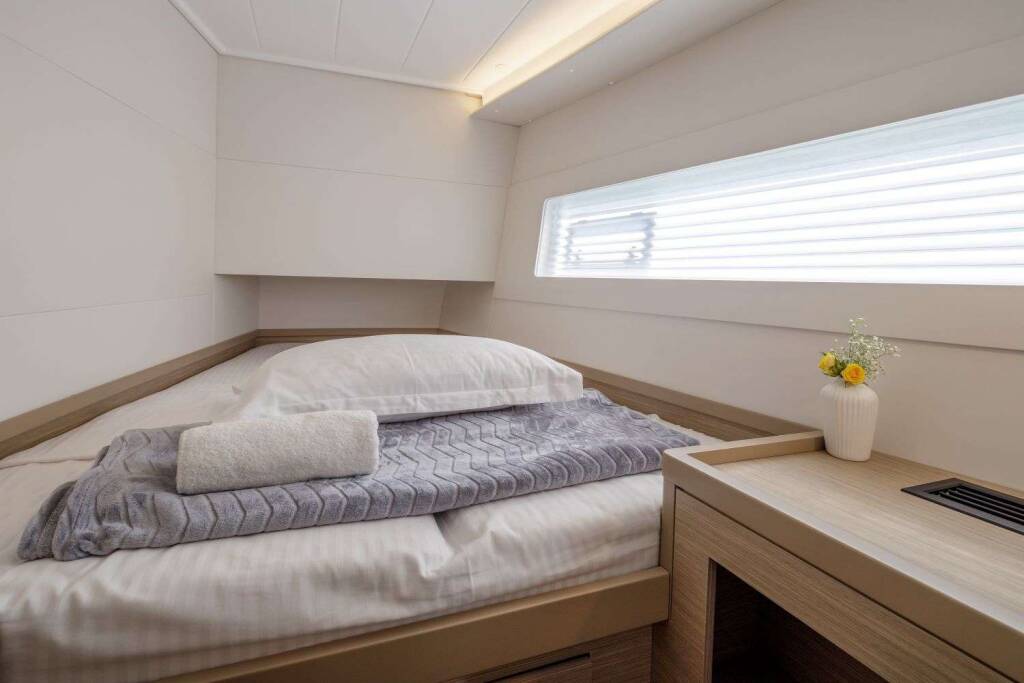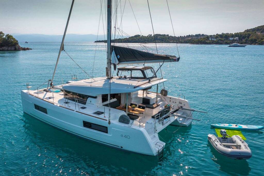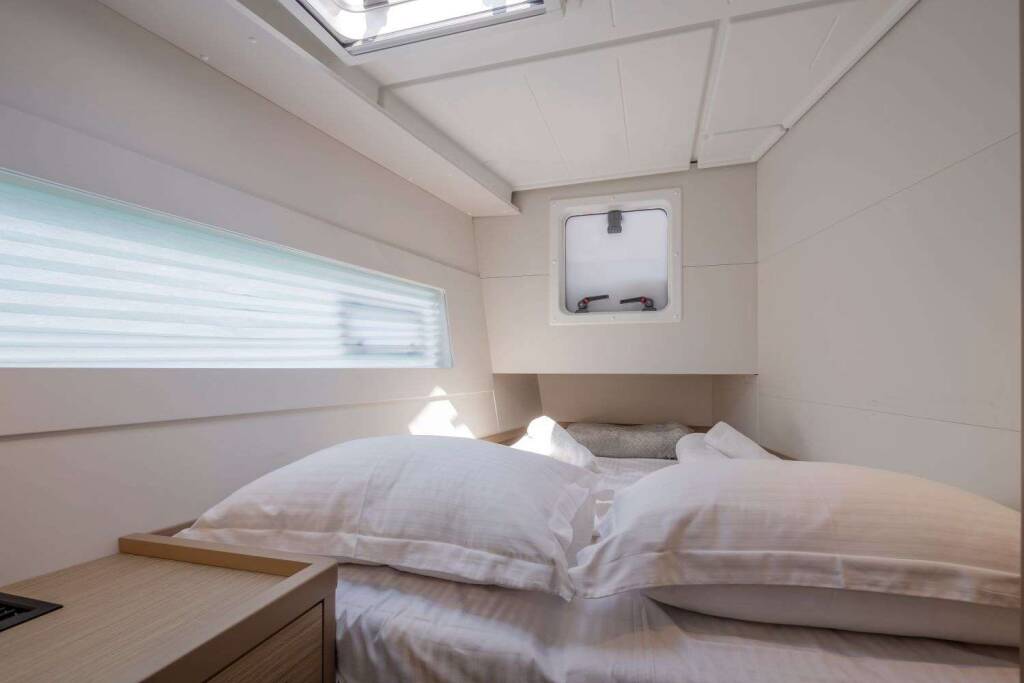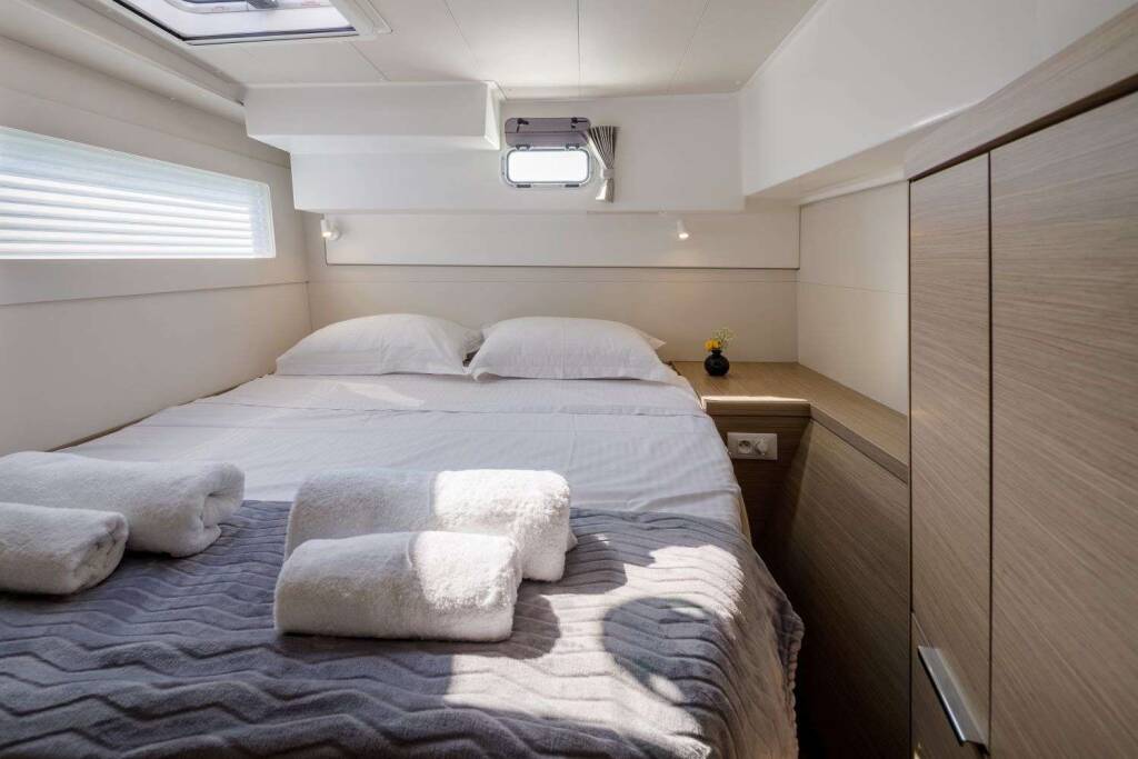 Luxus-Crew-Katamaran DEMY , Baujahr 2023, liegt vor Anker in Greece. Sie verfügt über 3 Kabinen und bietet Platz für 6 Personen.