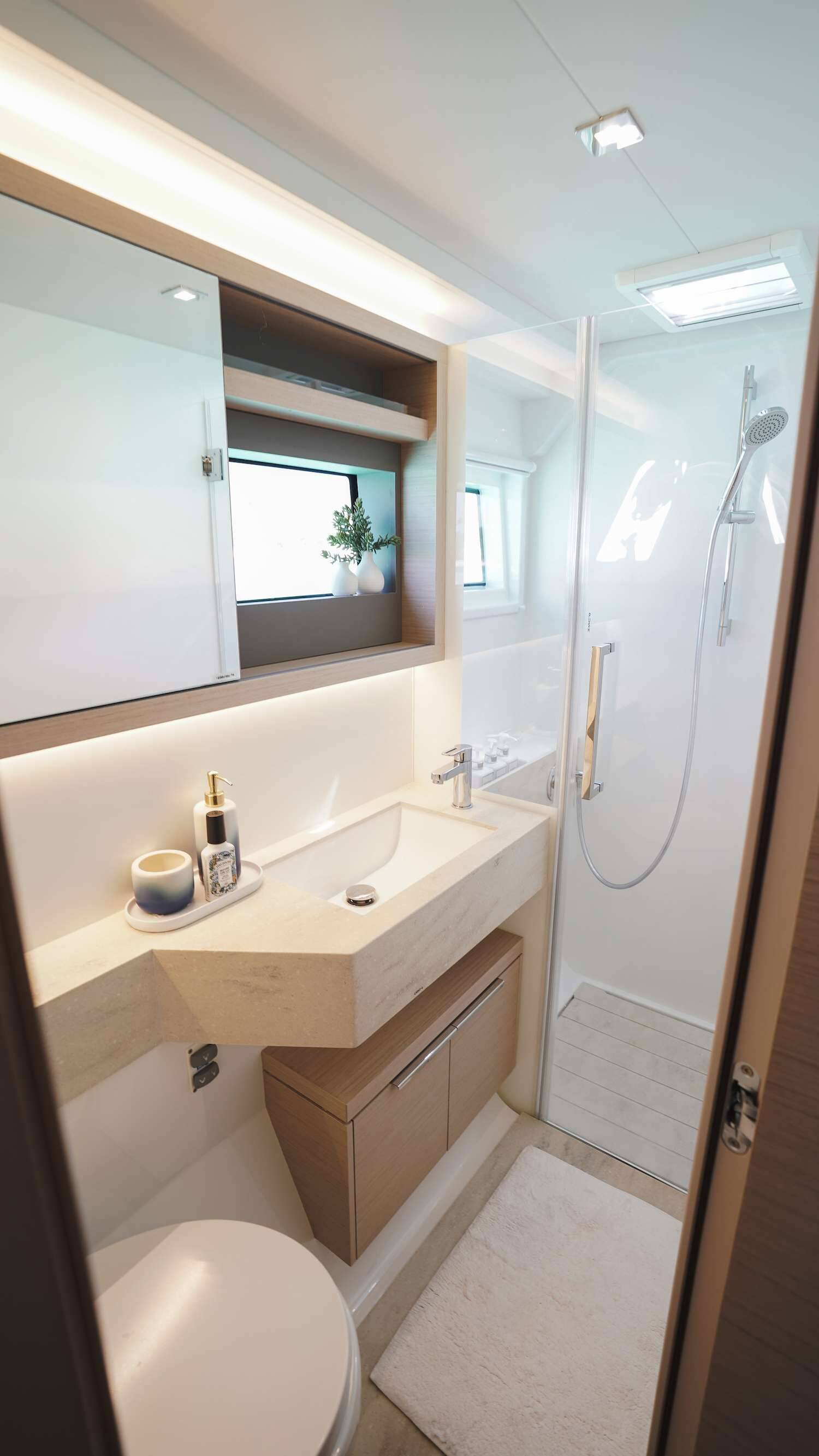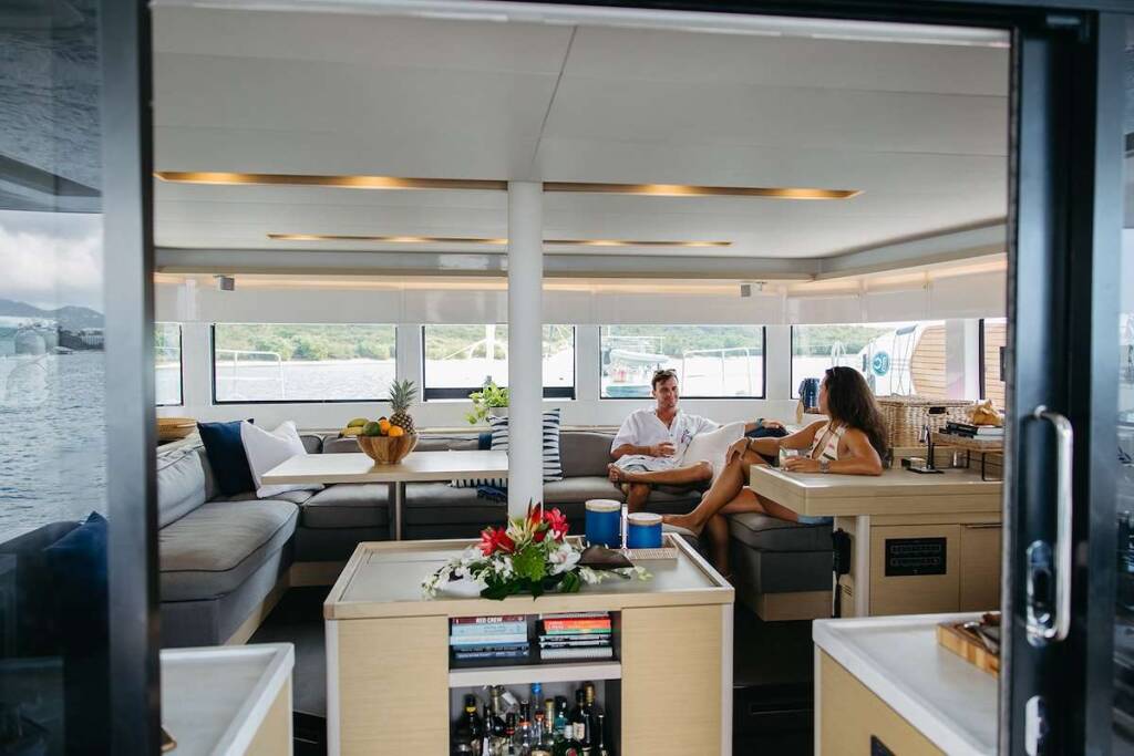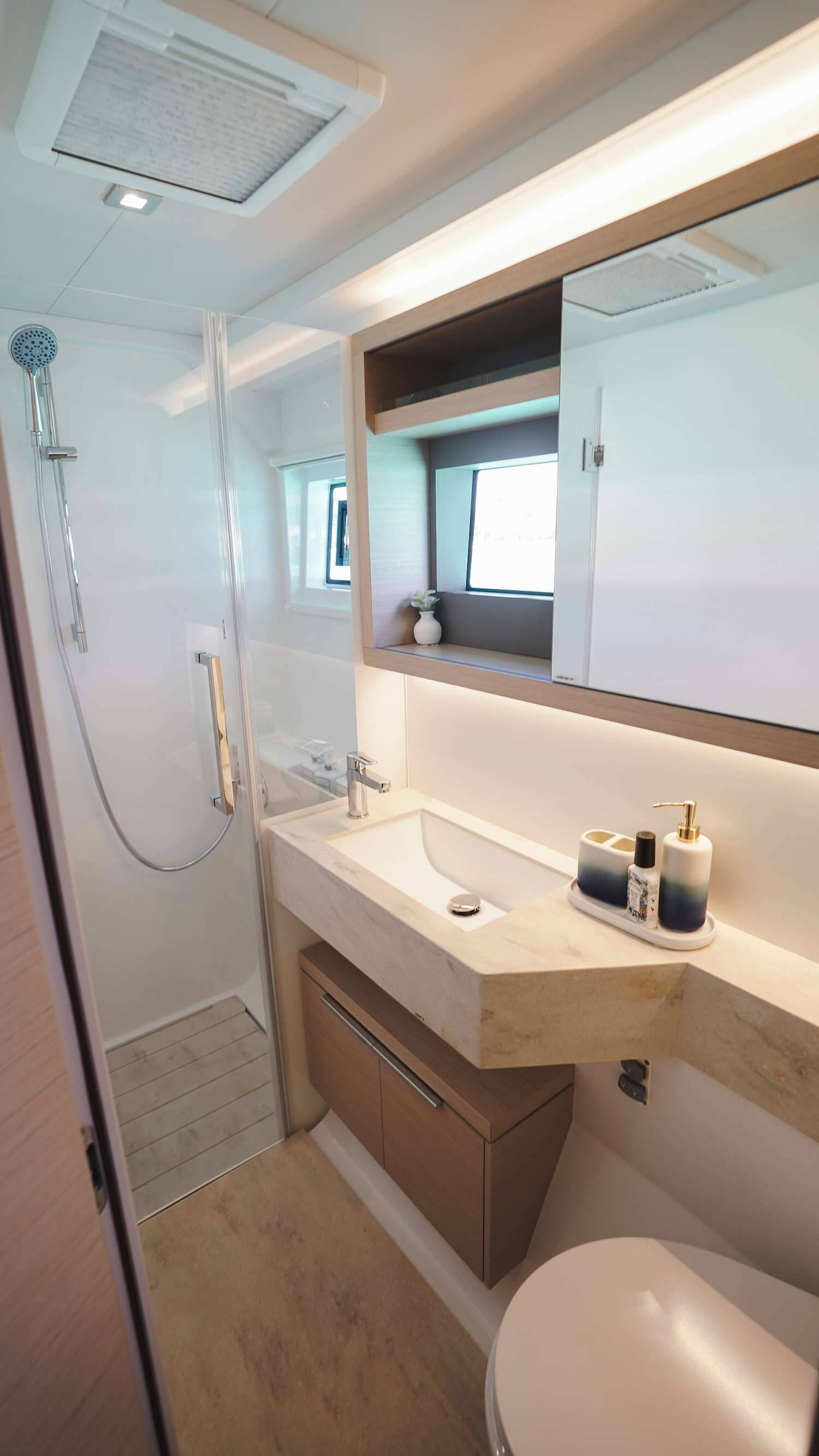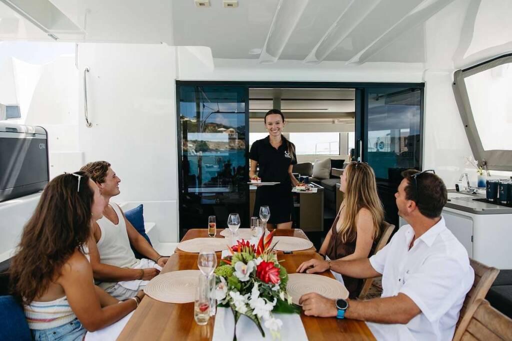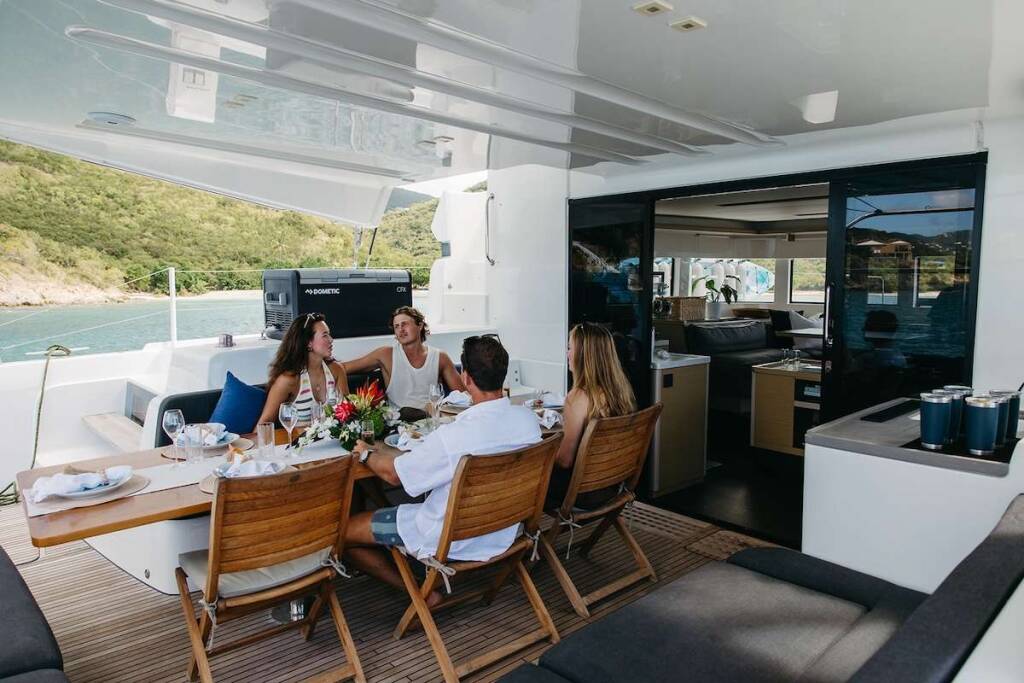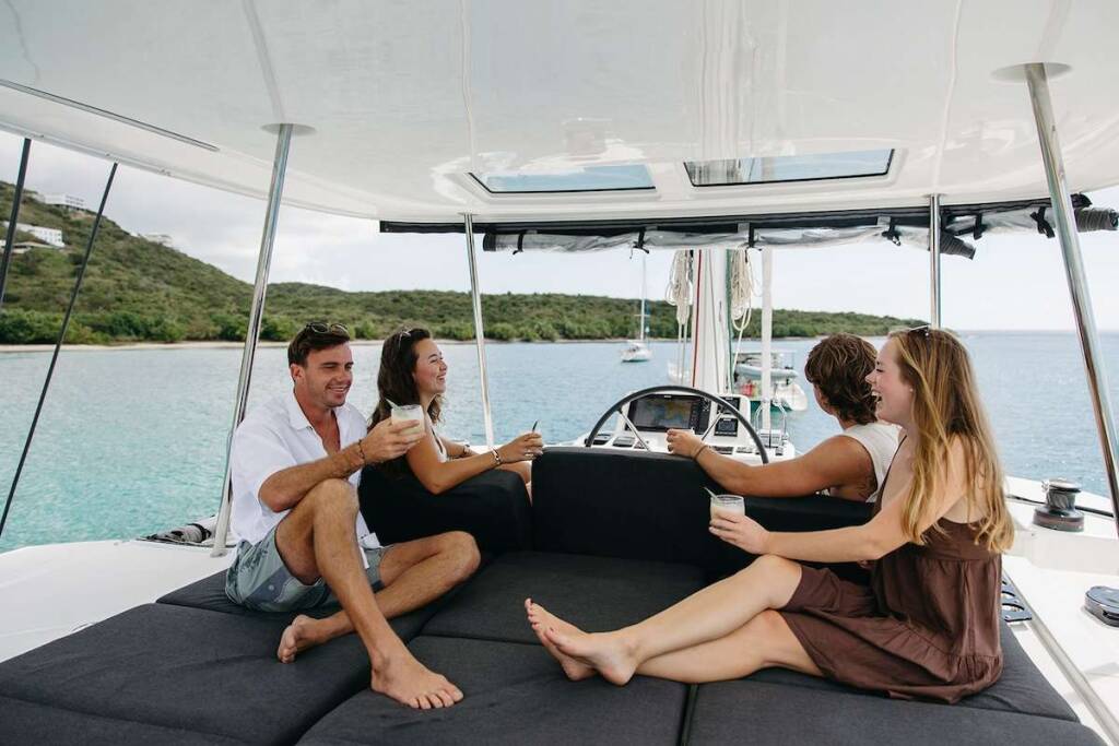 Luxus-Crew-Katamaran ETHER, Baujahr 2022, liegt vor Anker in Caribbean Virgin Islands (US/BVI), Caribbean Leewards. Sie verfügt über 4 Kabinen und bietet Platz für 8 Personen.