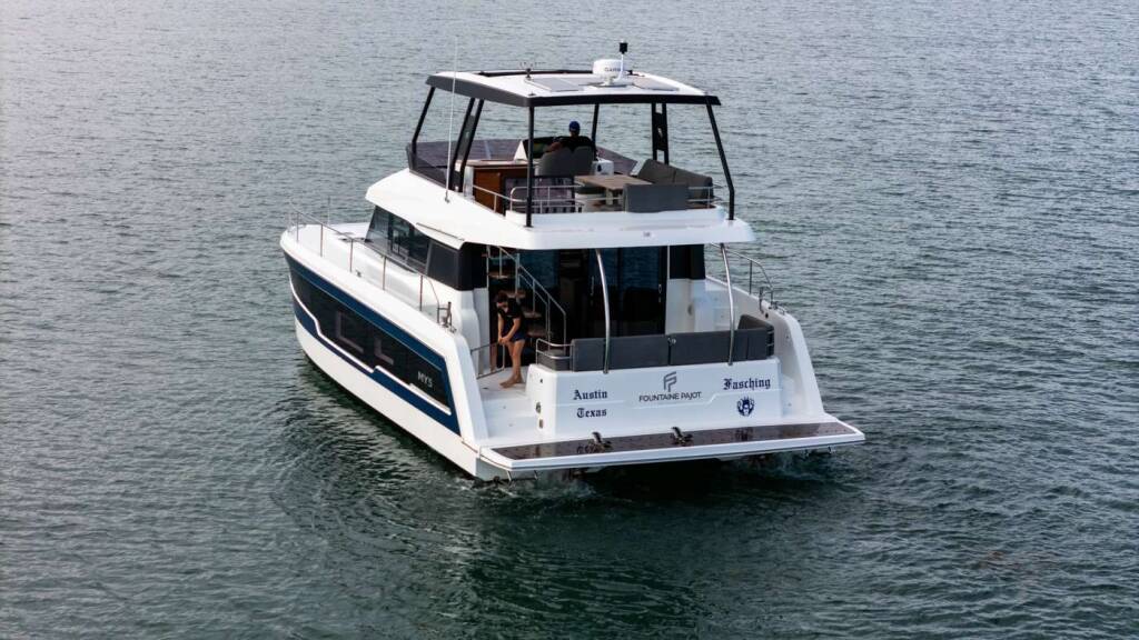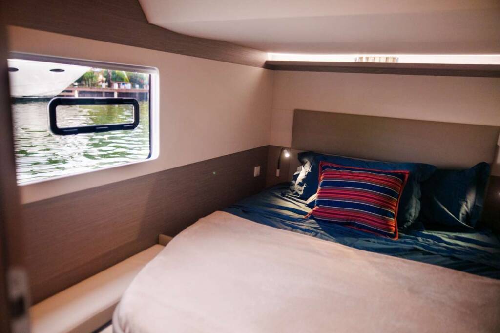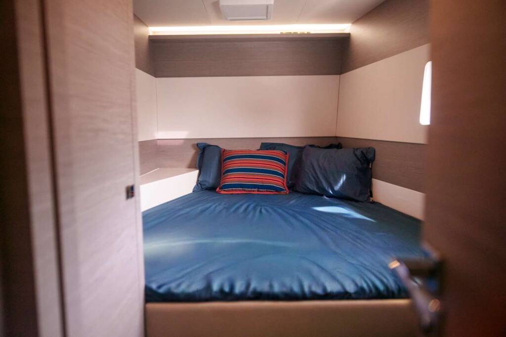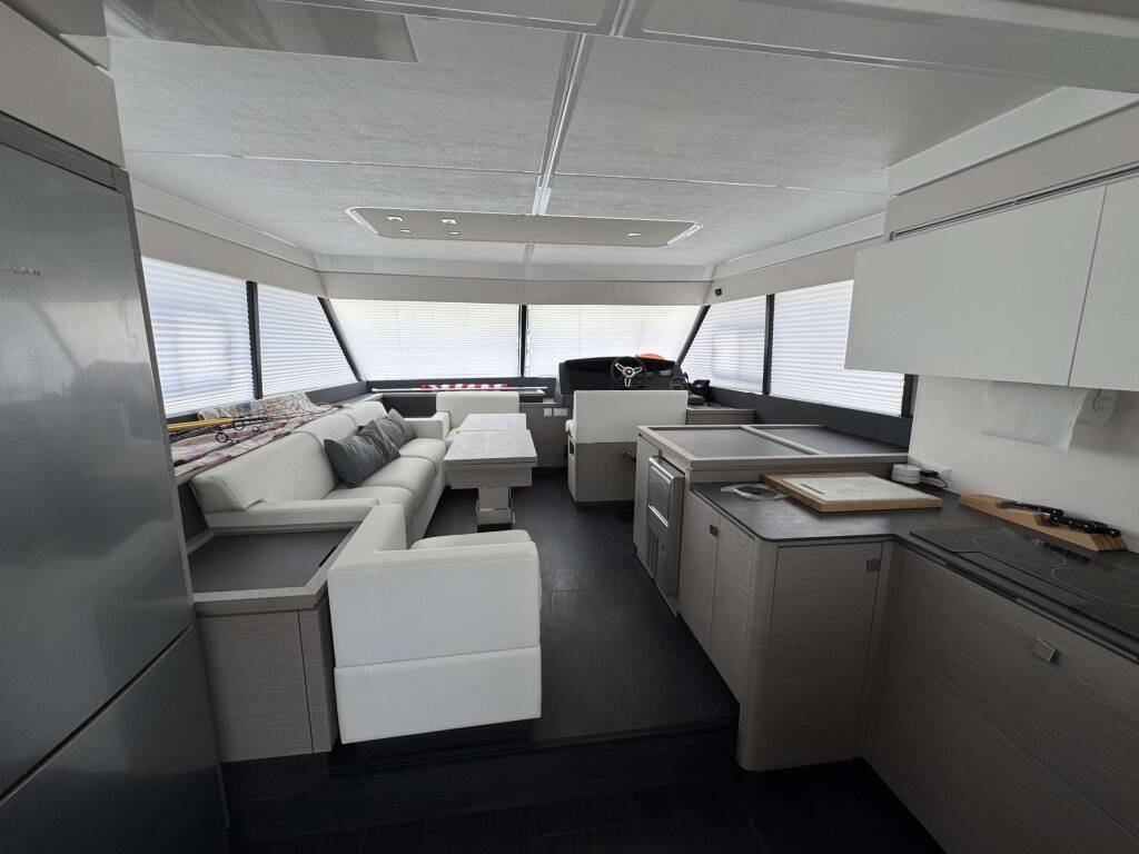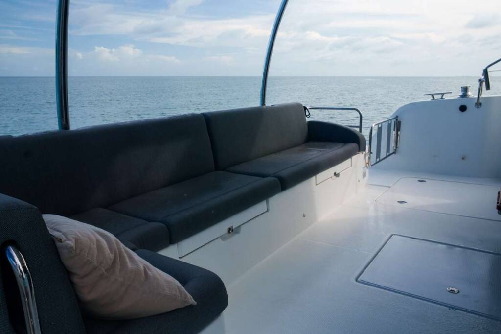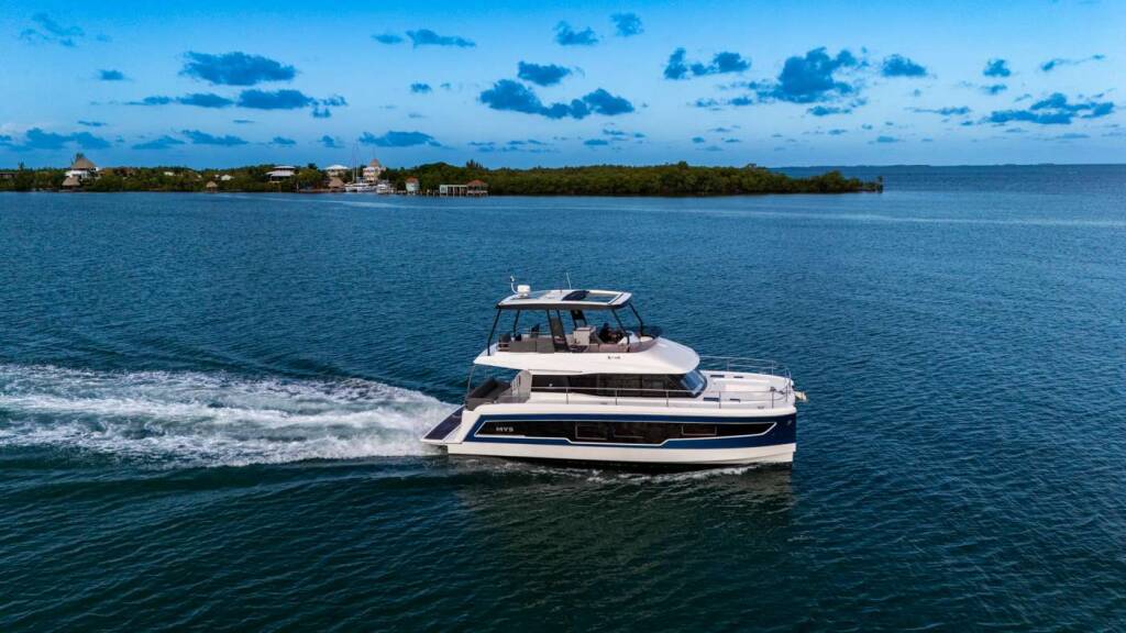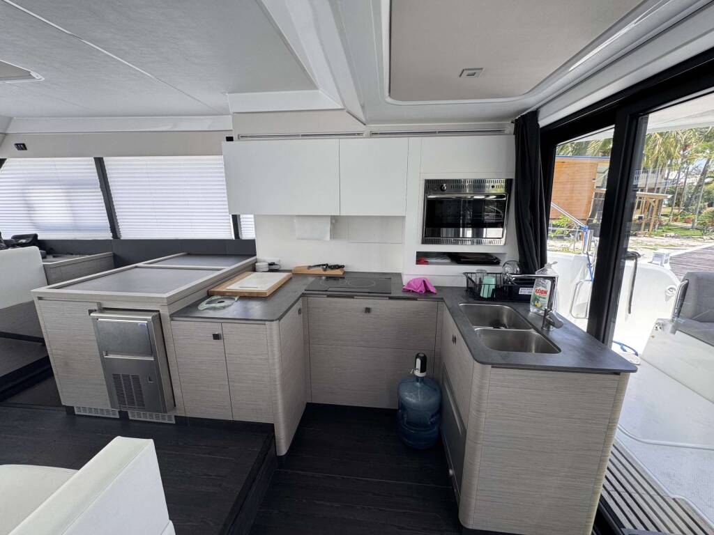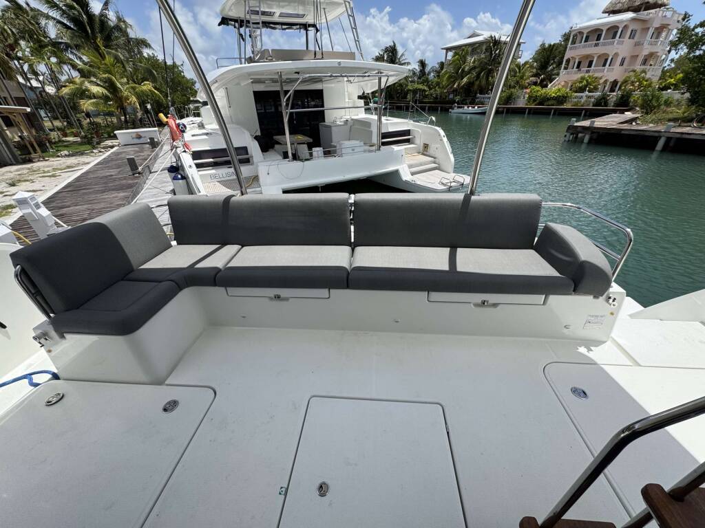 Luxus-Crew-Katamaran FASCHING, Baujahr 2024, liegt vor Anker in Belize. Sie verfügt über 3 Kabinen und bietet Platz für 6 Personen.
