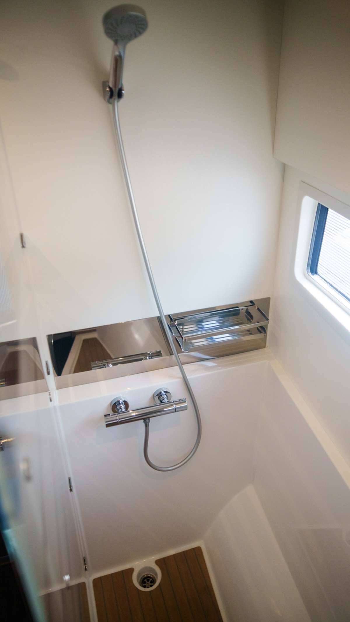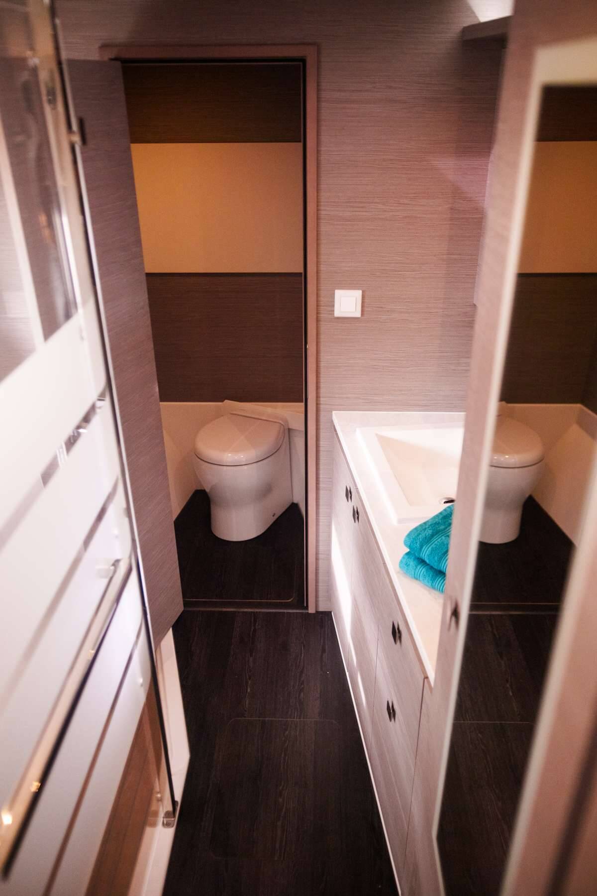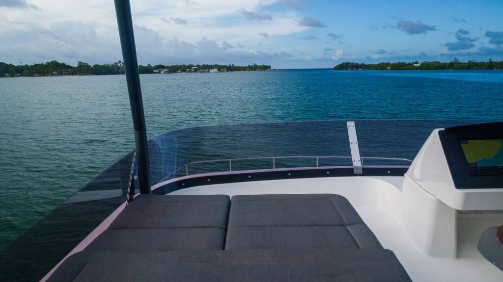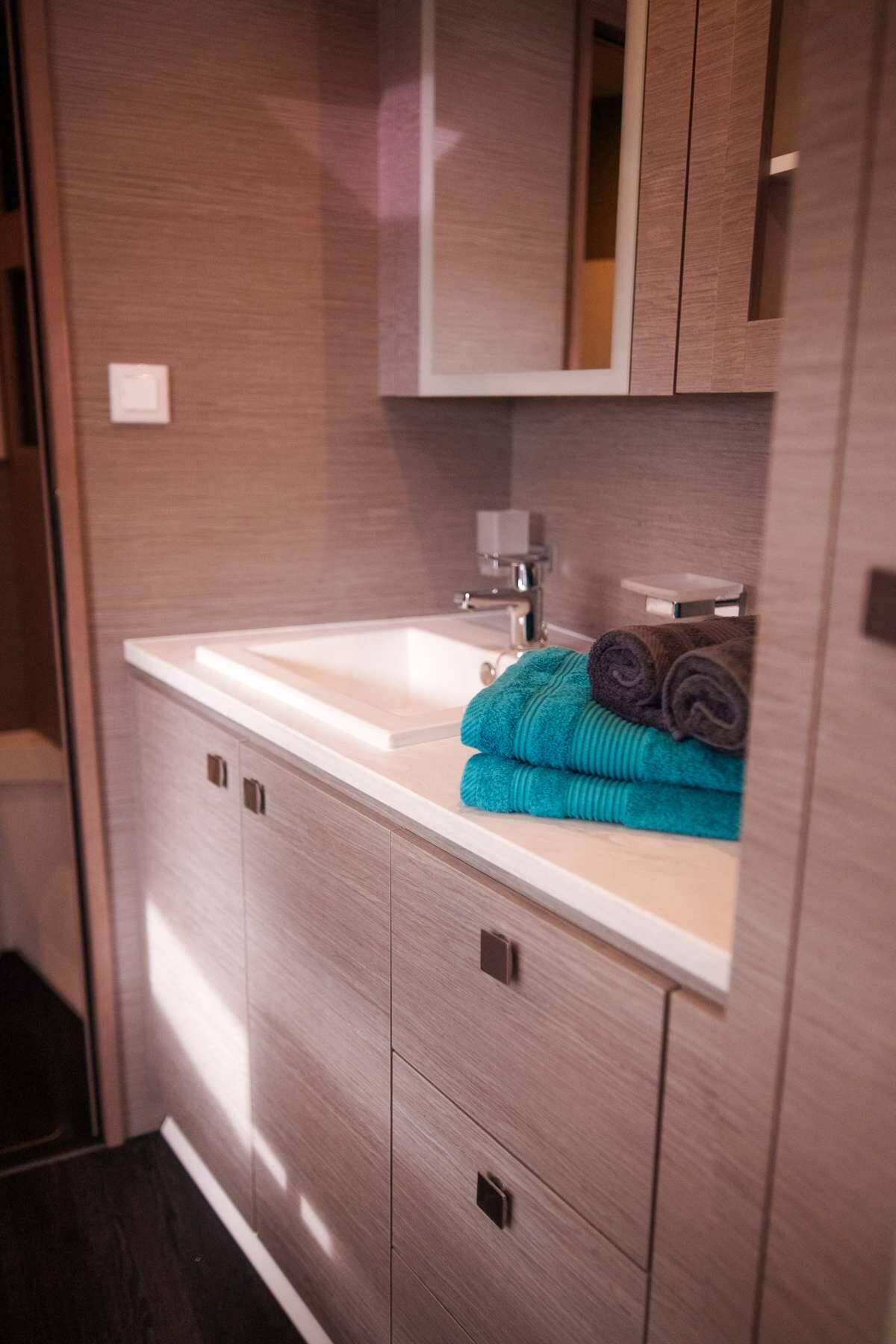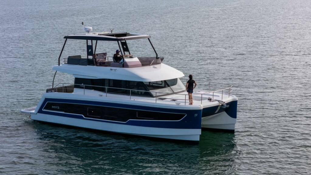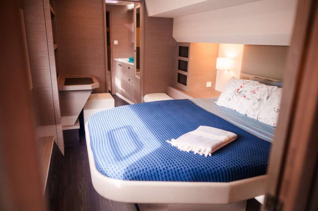 Luxus-Crew-Katamaran FASCHING, Baujahr 2024, liegt vor Anker in Belize. Sie verfügt über 3 Kabinen und bietet Platz für 6 Personen.
