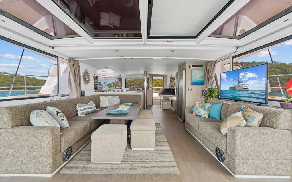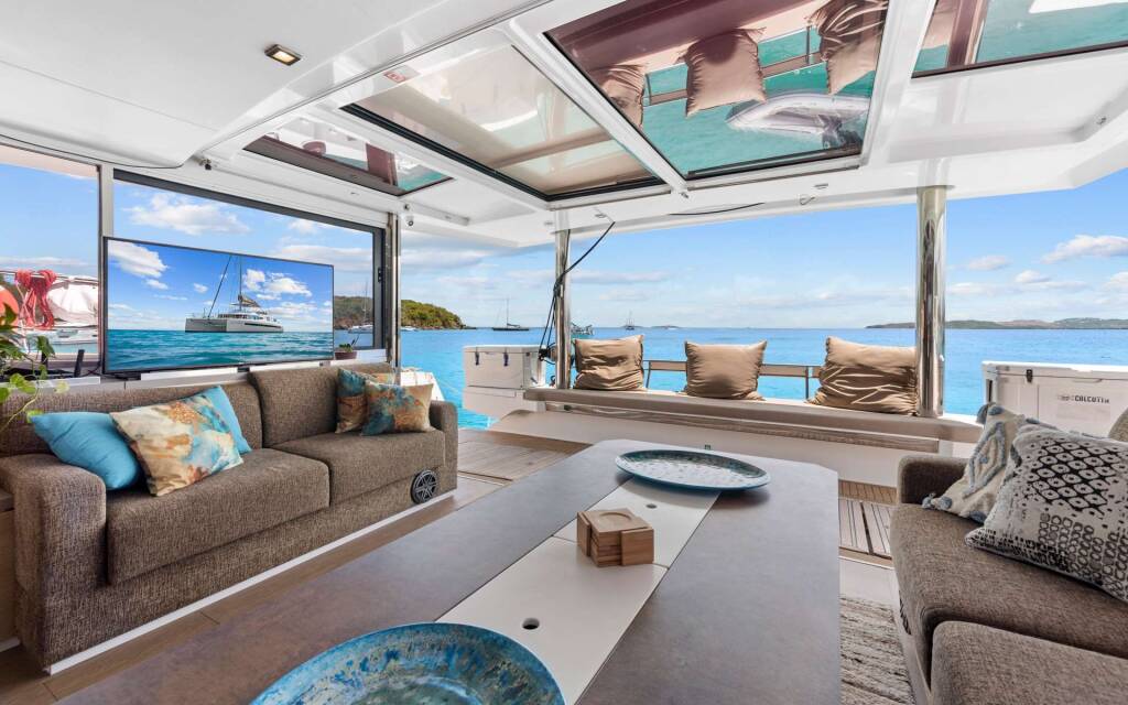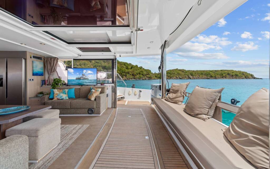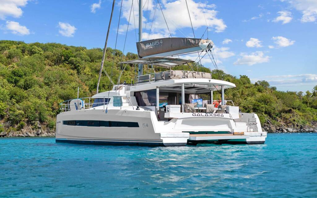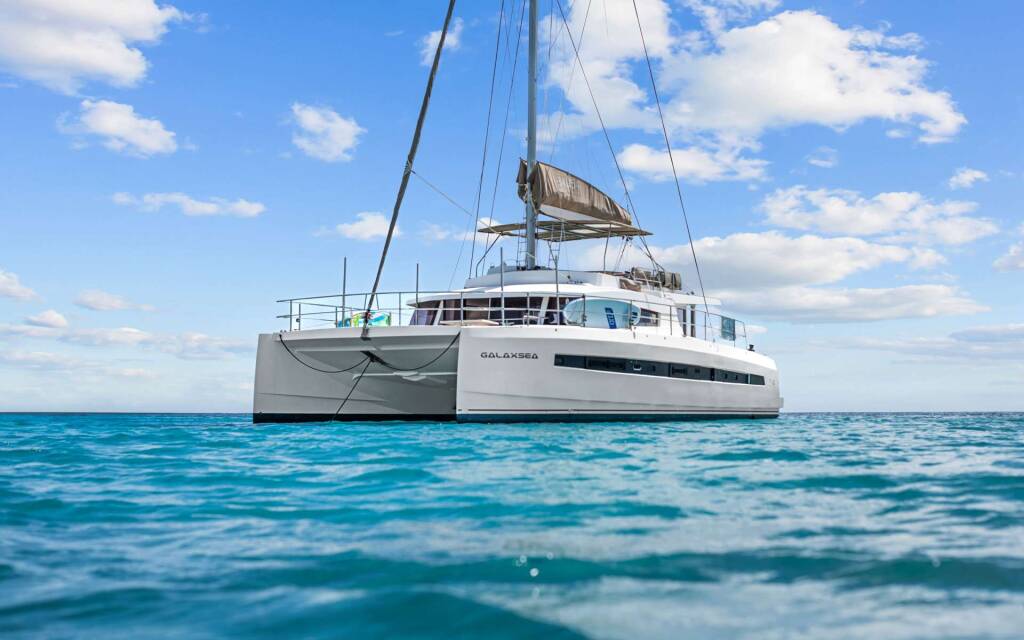 Luxus-Crew-Katamaran GALAXSEA, Baujahr 2019, liegt vor Anker in Caribbean Virgin Islands (US/BVI), Caribbean Leewards. Sie verfügt über 4 Kabinen und bietet Platz für 8 Personen.