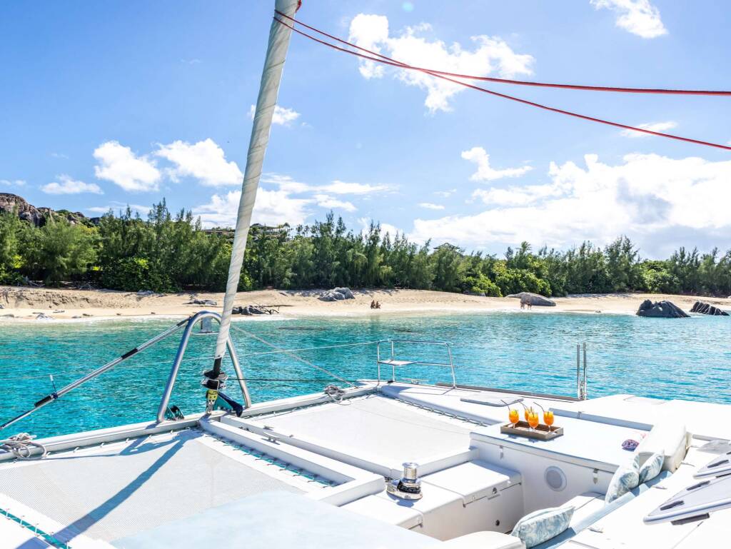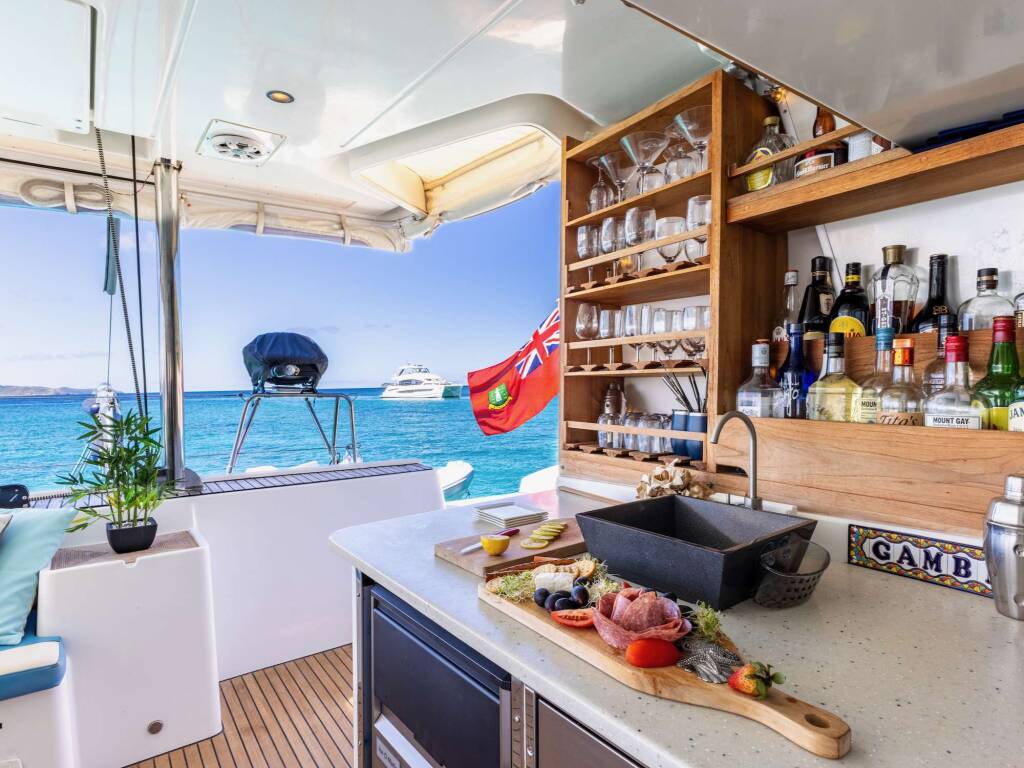 Luxus-Crew-Katamaran GAMBIT, Baujahr 2008, liegt vor Anker in Caribbean Virgin Islands (BVI). Sie verfügt über 4 Kabinen und bietet Platz für 6 Personen.