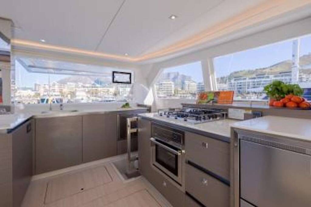 Salon has lounge area, galley, and formal dining area with forward door to access the foredeck.
