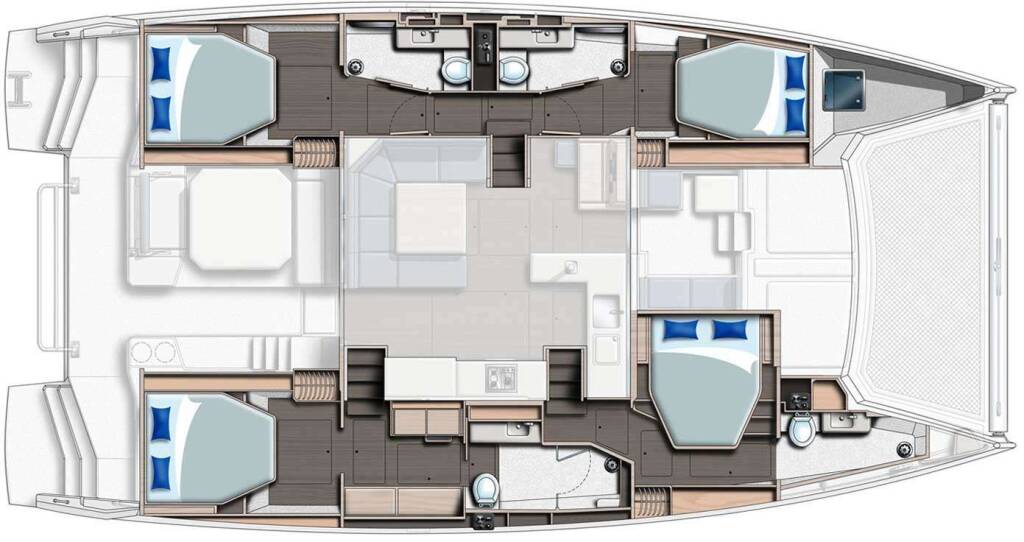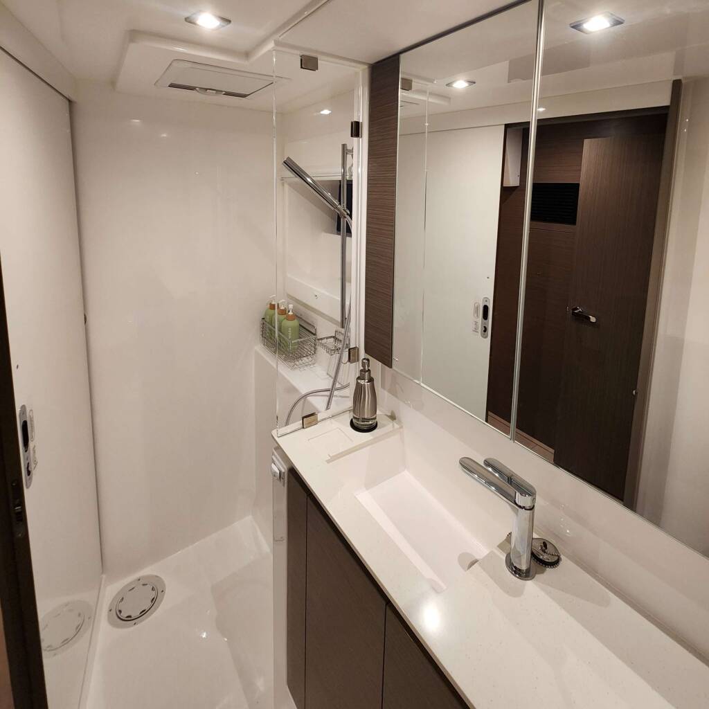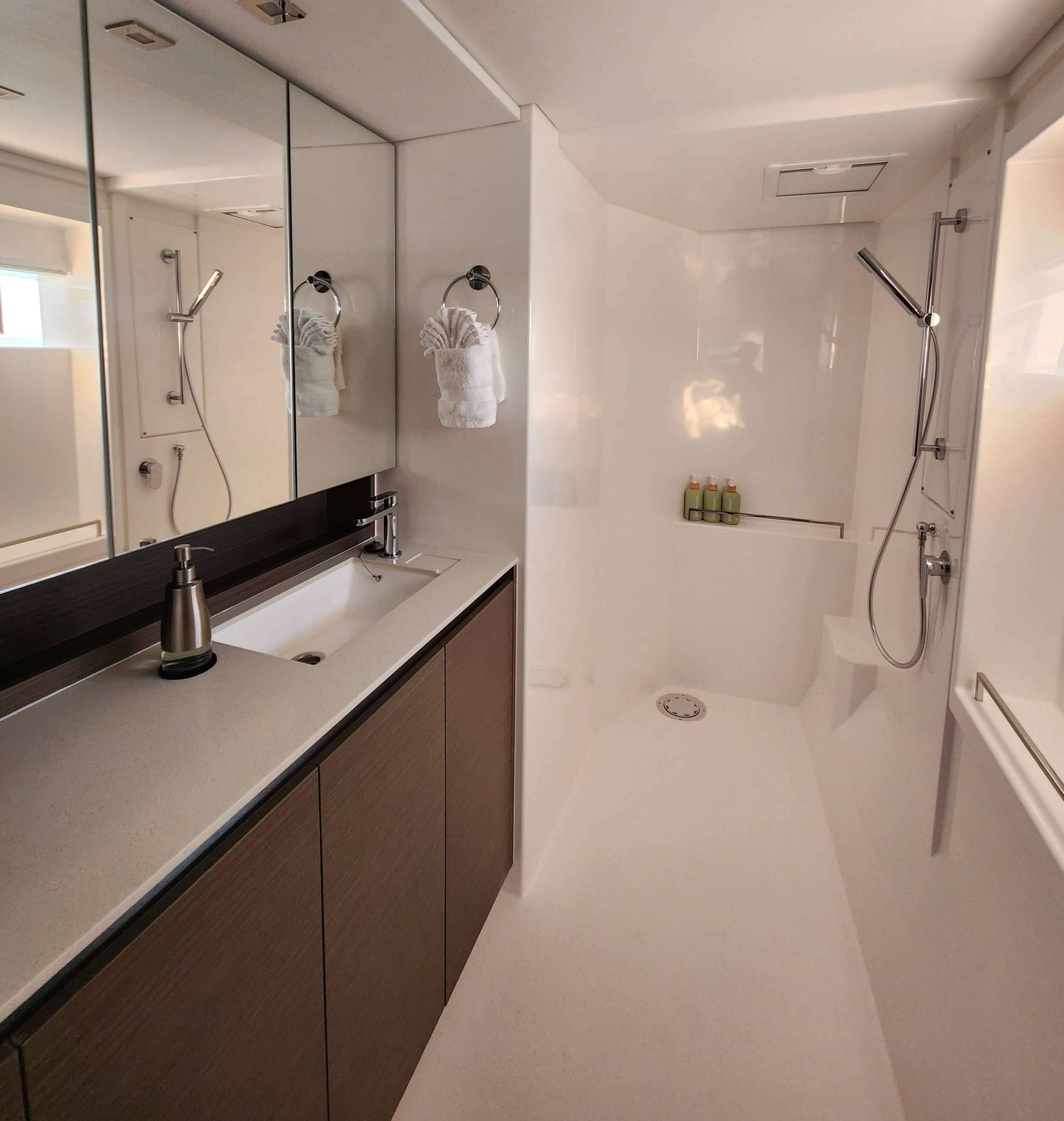 Accommodation: Hazel Della is equipped with 2 queen cabins and 1 master cabin with queen berth for guest use, each with en-suite electric head, shower, and sink/vanity.