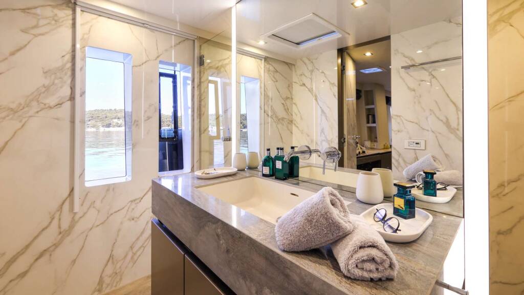 Luxus-Crew-Katamaran HONEYBIRD, Baujahr 2019, liegt vor Anker in Croatia, Adriatic Sea. Sie verfügt über 3 Kabinen und bietet Platz für 6 Personen.