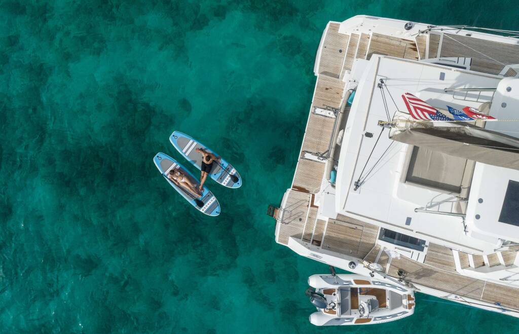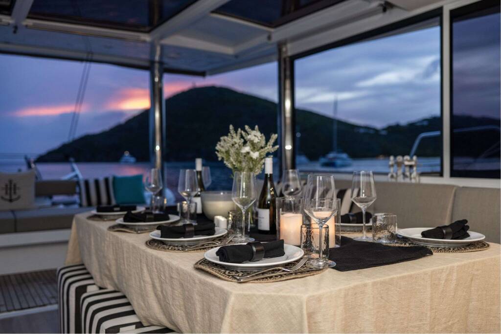 Luxus-Crew-Katamaran HYDROTHERAPY, Baujahr 2023, liegt vor Anker in Caribbean Leewards, Caribbean Virgin Islands (BVI). Sie verfügt über 6 Kabinen und bietet Platz für 10 Personen.