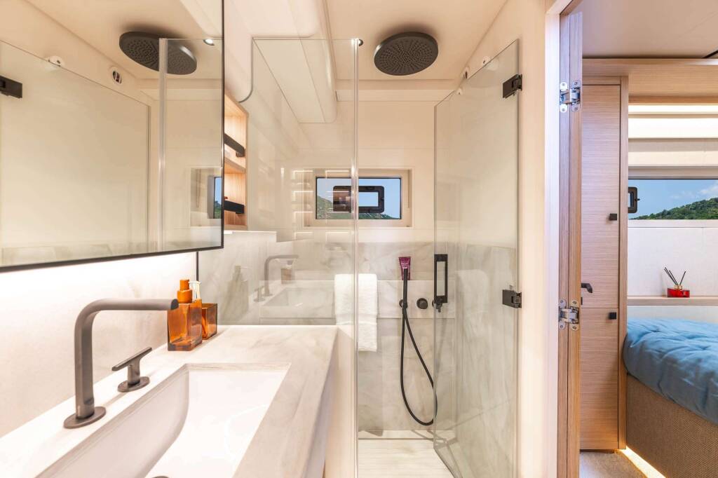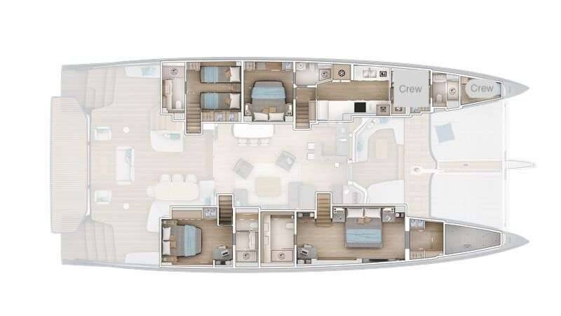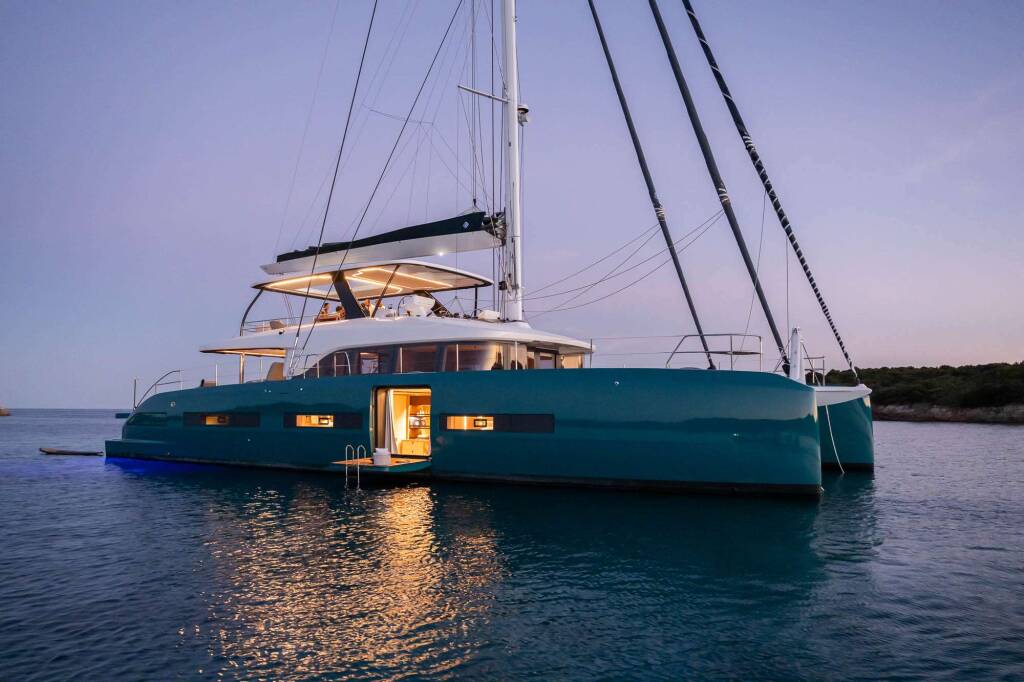 Luxus-Crew-Katamaran IMLADRIS , Baujahr 2025, liegt vor Anker in W. Med -Naples/Sicily, W. Med -Riviera/Cors/Sard.. Sie verfügt über 4 Kabinen und bietet Platz für 8 Personen.