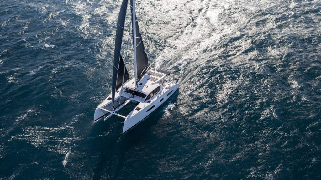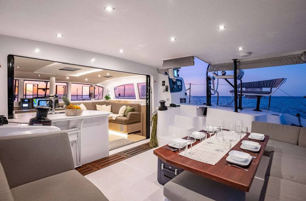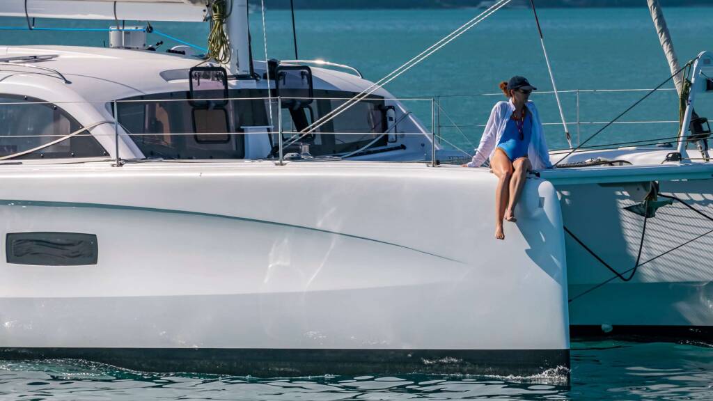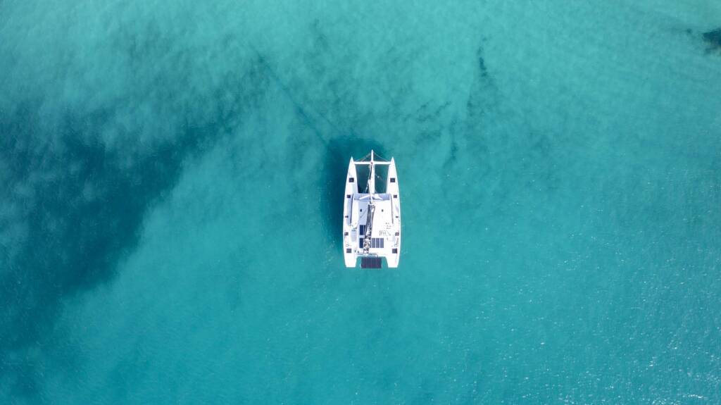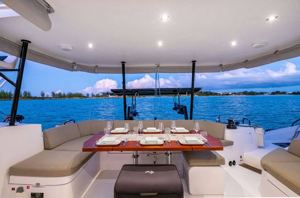 Luxus-Crew-Katamaran Inez V, Baujahr 2023, liegt vor Anker in Bahamas. Sie verfügt über 3 Kabinen und bietet Platz für 6 Personen.