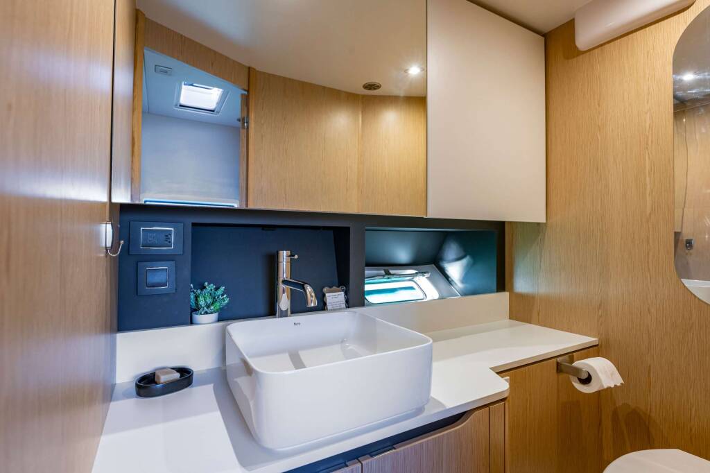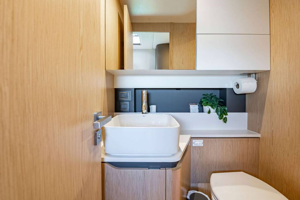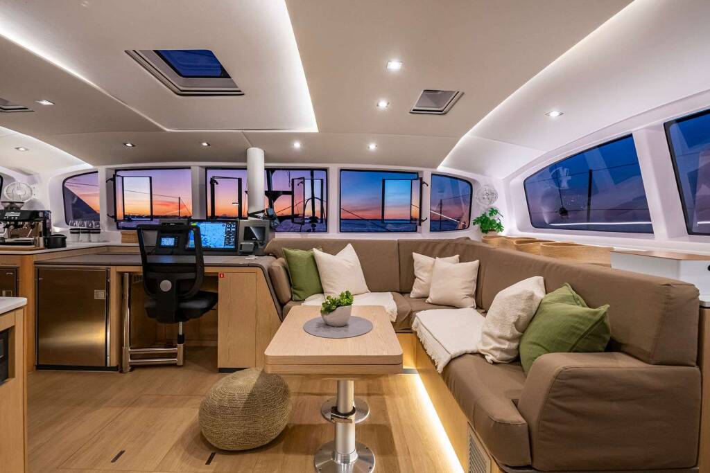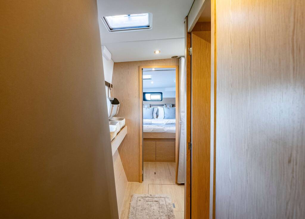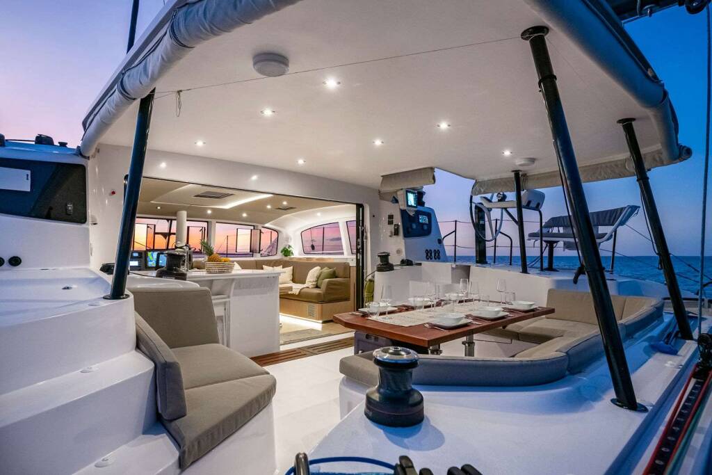 Luxus-Crew-Katamaran Inez V, Baujahr 2023, liegt vor Anker in Bahamas. Sie verfügt über 3 Kabinen und bietet Platz für 6 Personen.