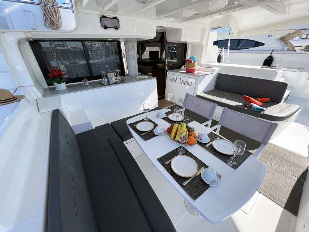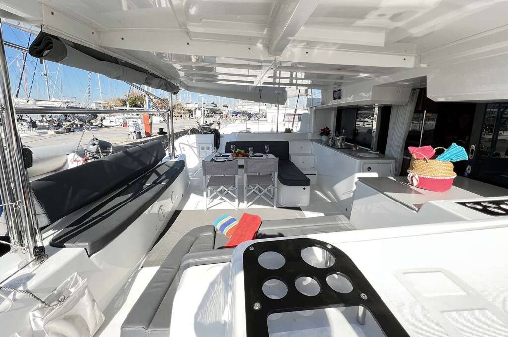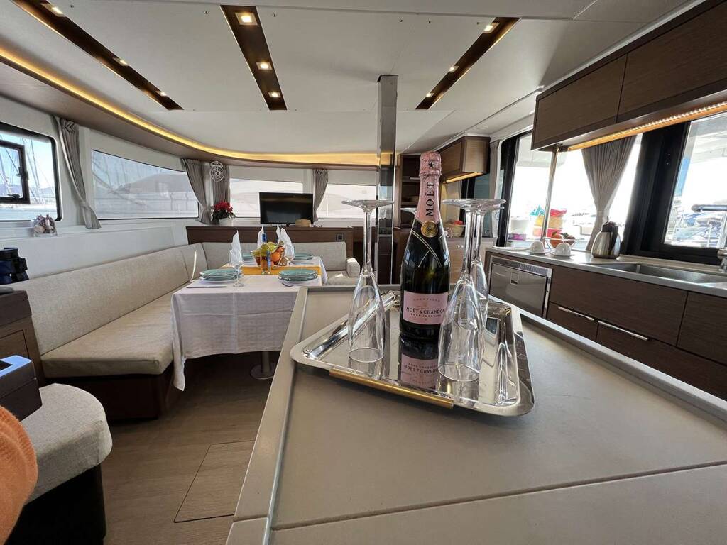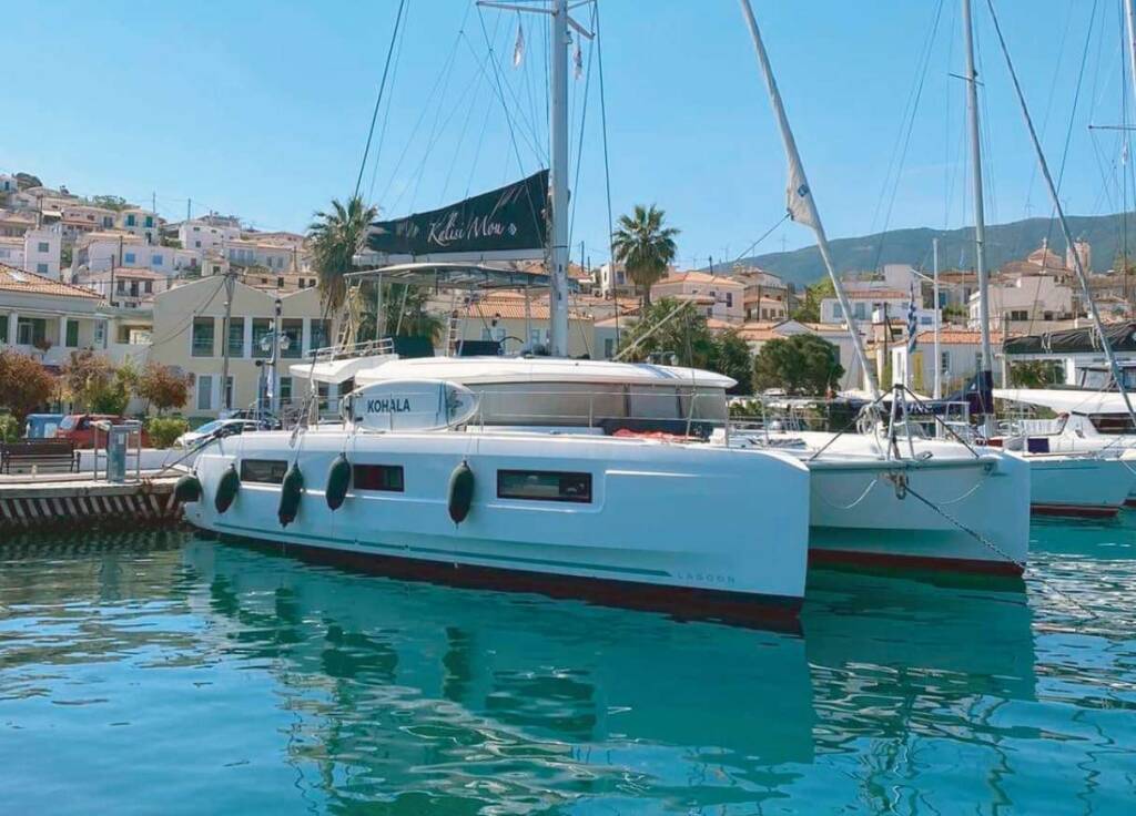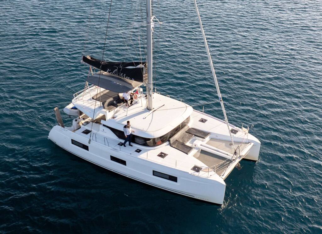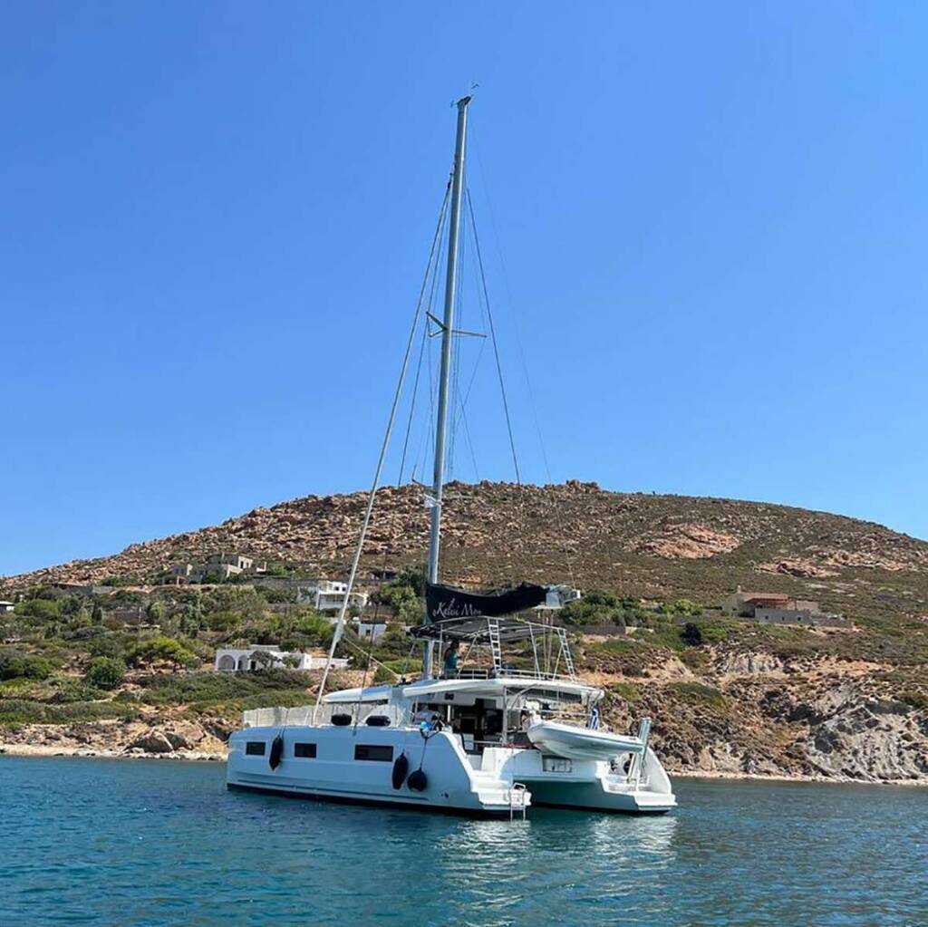 Luxus-Crew-Katamaran KALISI MOU, Baujahr 2021, liegt vor Anker in Greece. Sie verfügt über 4 Kabinen und bietet Platz für 8 Personen.