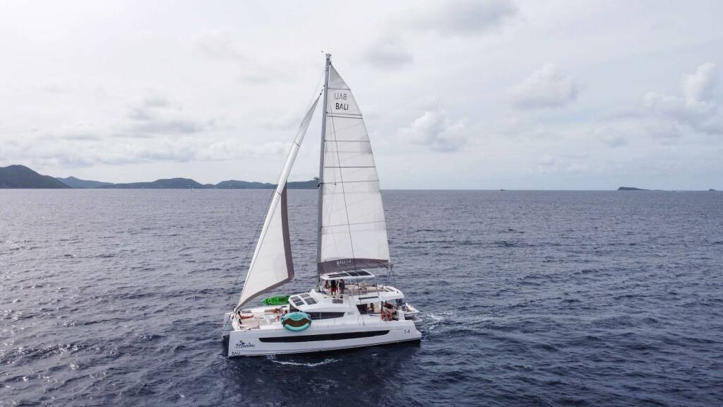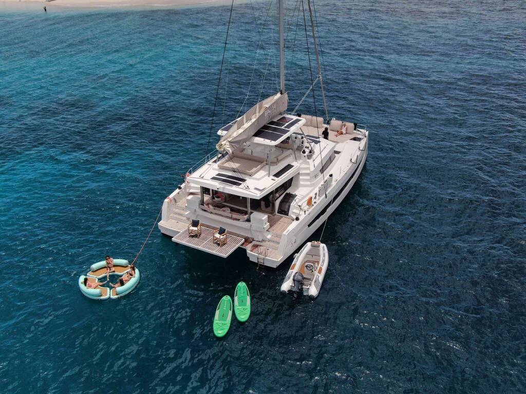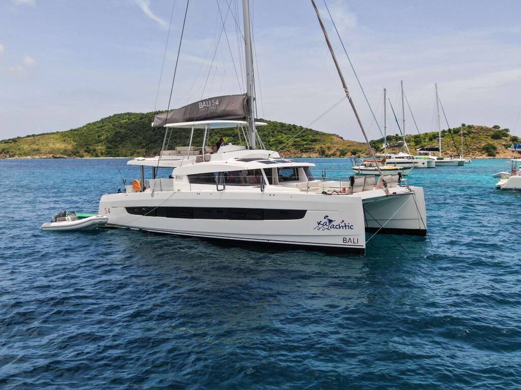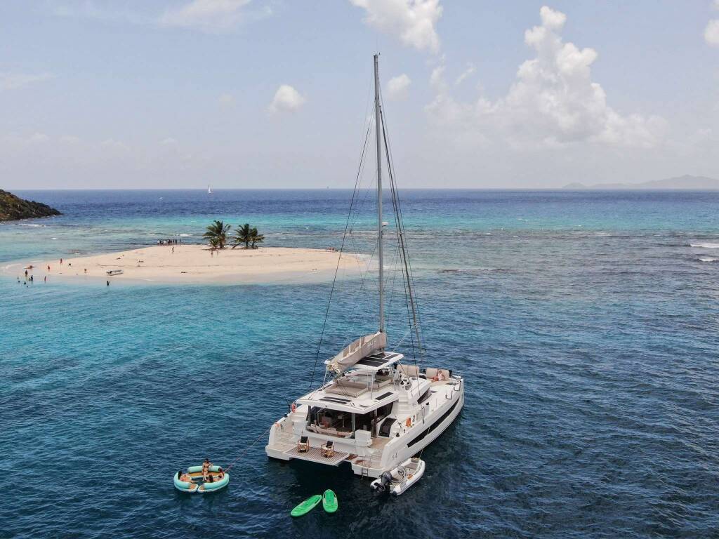 Luxus-Crew-Katamaran KaYachtic , Baujahr 2024, liegt vor Anker in Caribbean Virgin Islands (US/BVI), Caribbean Leewards. Sie verfügt über 5 Kabinen und bietet Platz für 9 Personen.