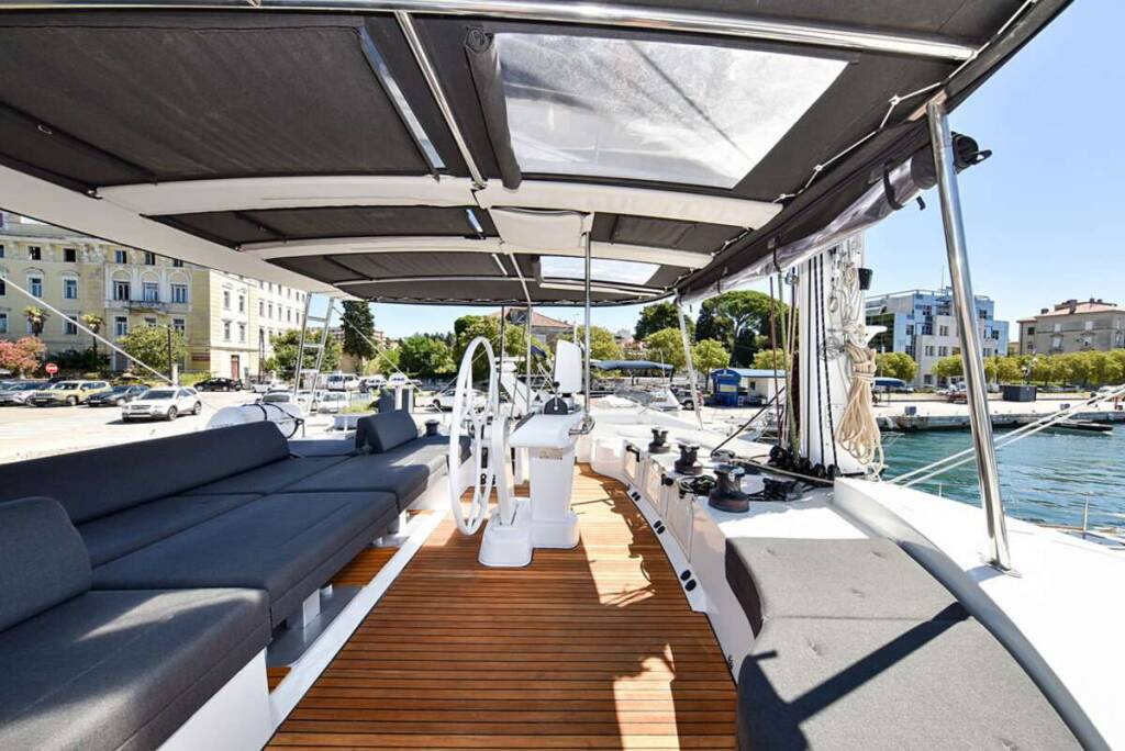 Luxus-Crew-Katamaran LARGO WINCH, Baujahr 2017, liegt vor Anker in Greece. Sie verfügt über 4 Kabinen und bietet Platz für 8 Personen.
