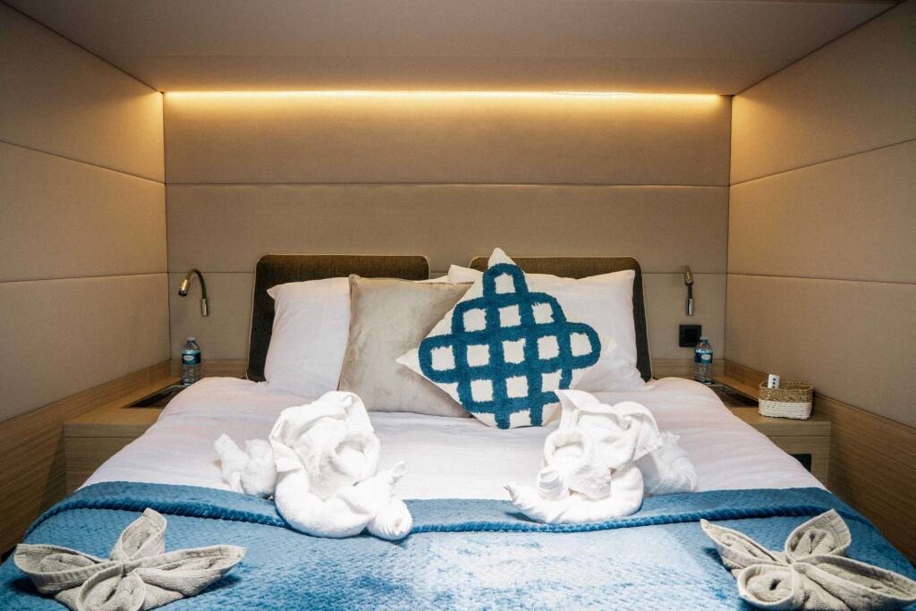 Luxus-Crew-Katamaran Luna Nova, Baujahr 2024, liegt vor Anker in Caribbean Virgin Islands (BVI). Sie verfügt über 4 Kabinen und bietet Platz für 3 Personen.
