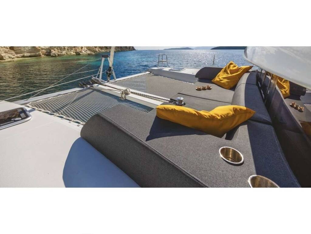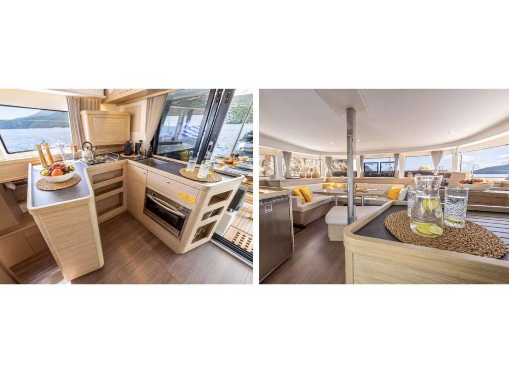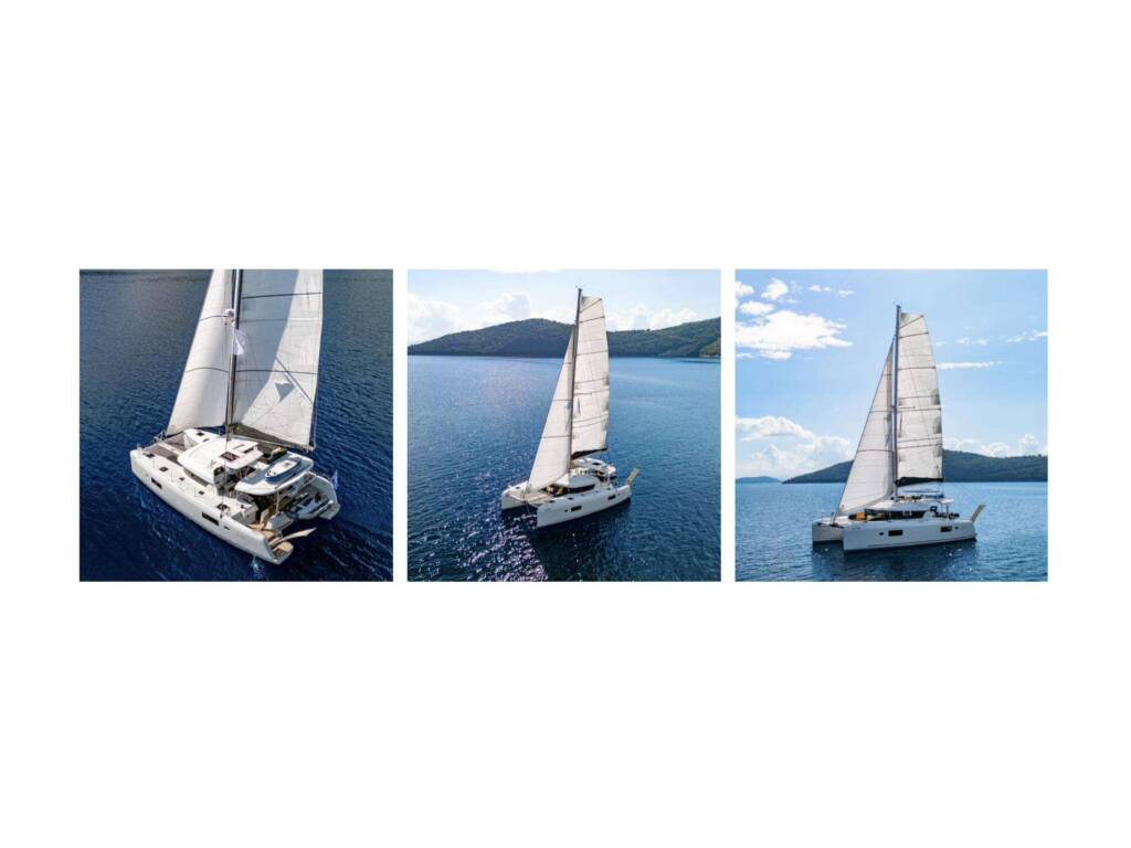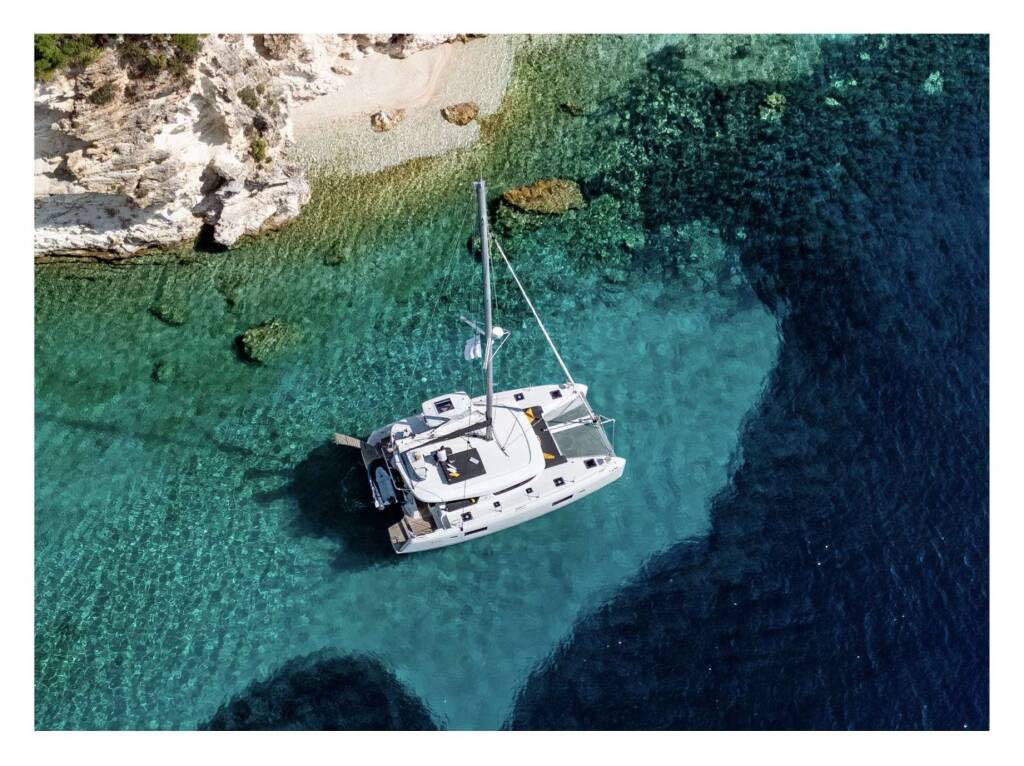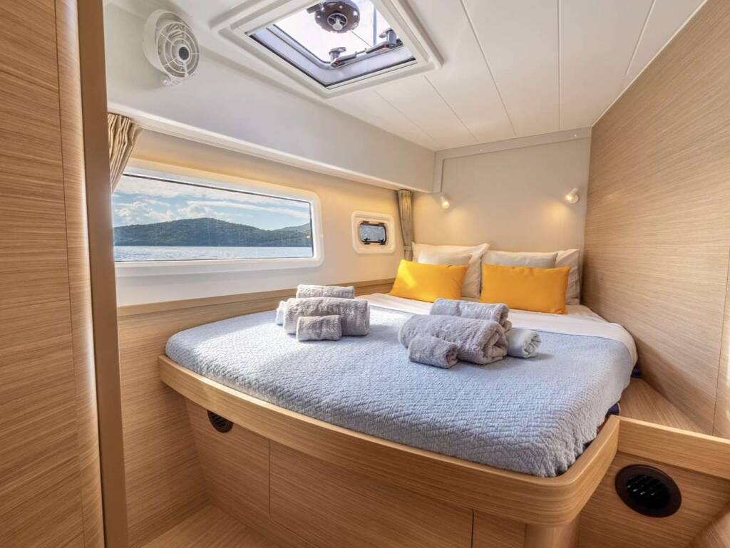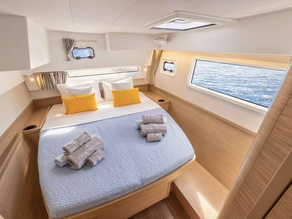 Luxus-Crew-Katamaran LUNA, Baujahr 2025, liegt vor Anker in Greece. Sie verfügt über 3 Kabinen und bietet Platz für 6 Personen.