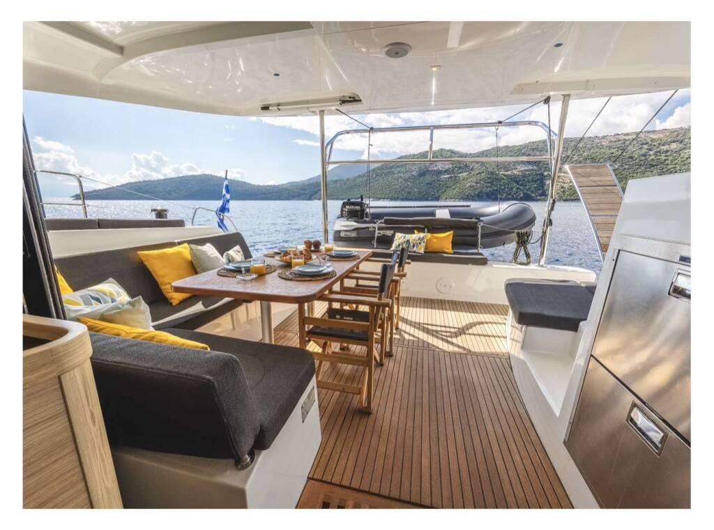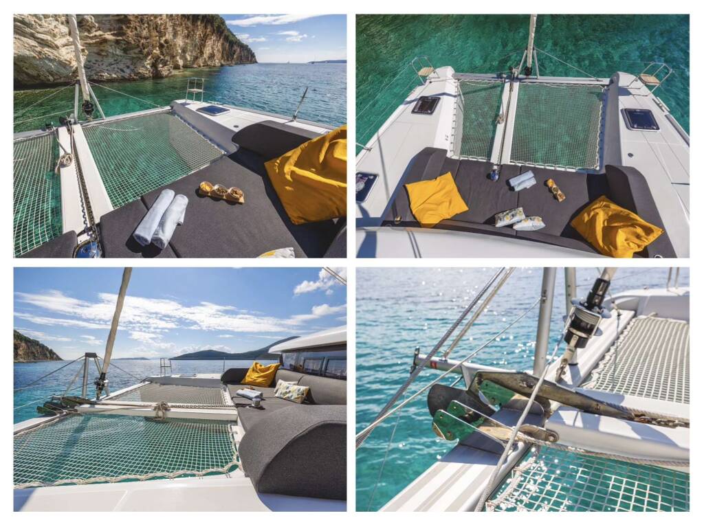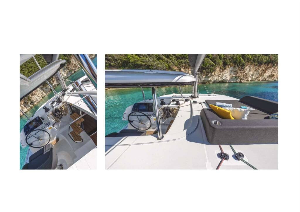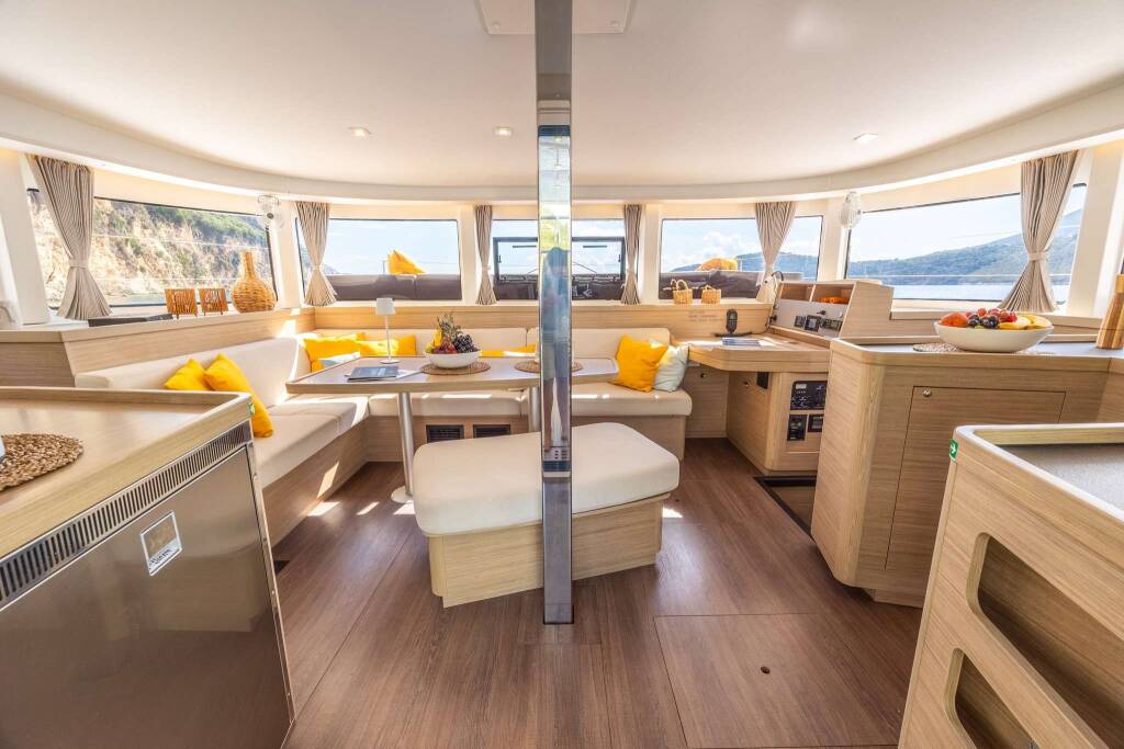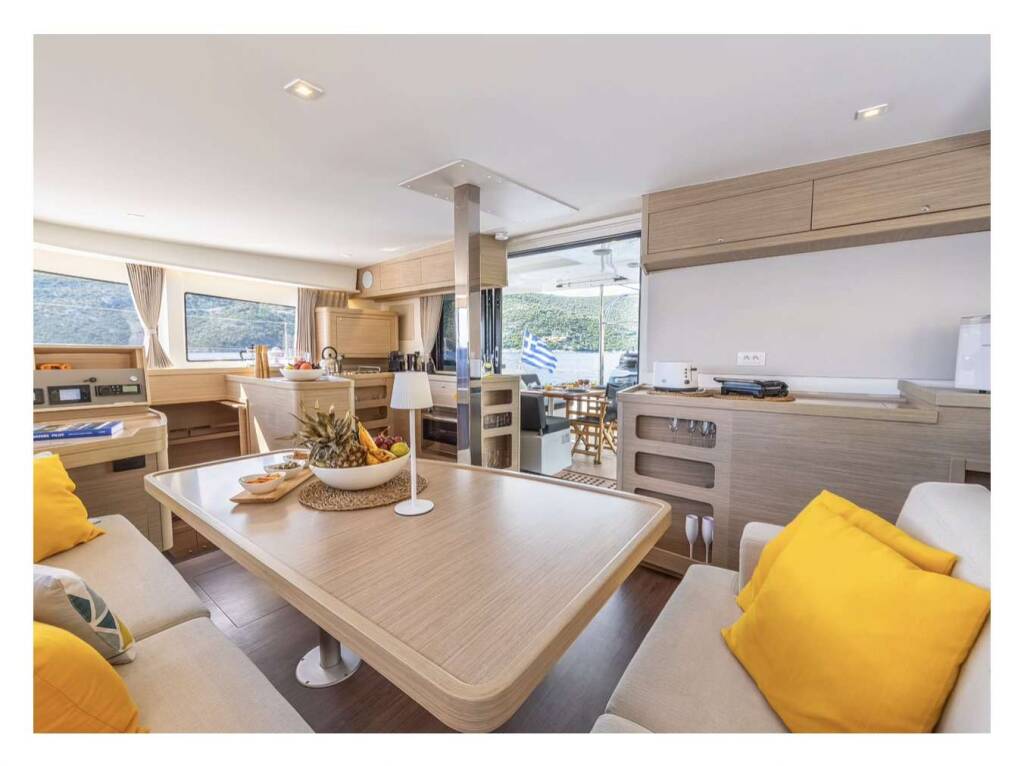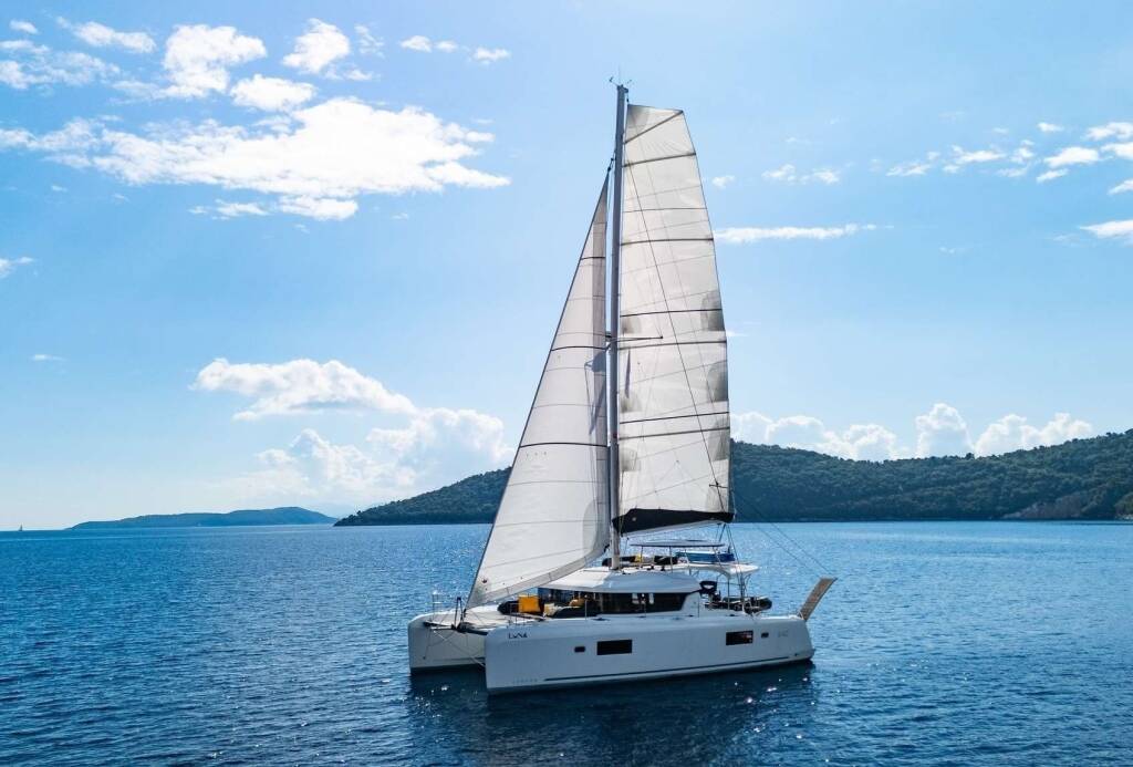 Luxus-Crew-Katamaran LUNA, Baujahr 2025, liegt vor Anker in Greece. Sie verfügt über 3 Kabinen und bietet Platz für 6 Personen.