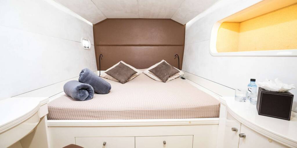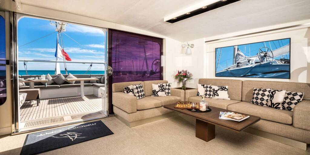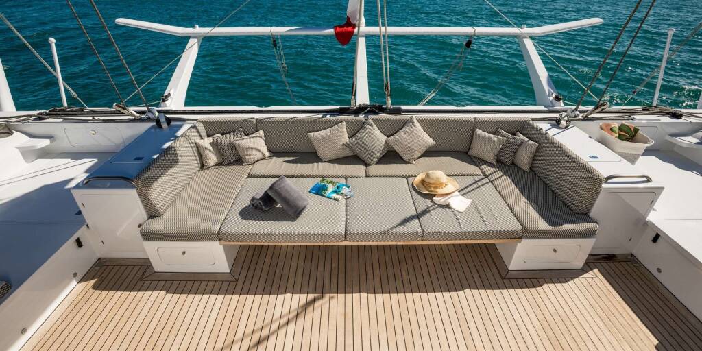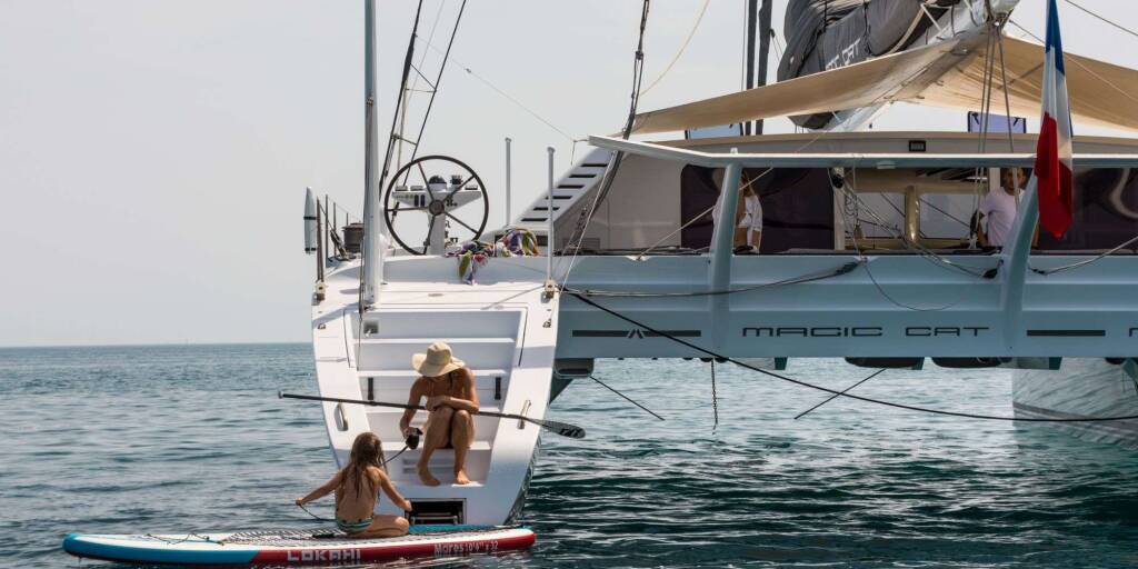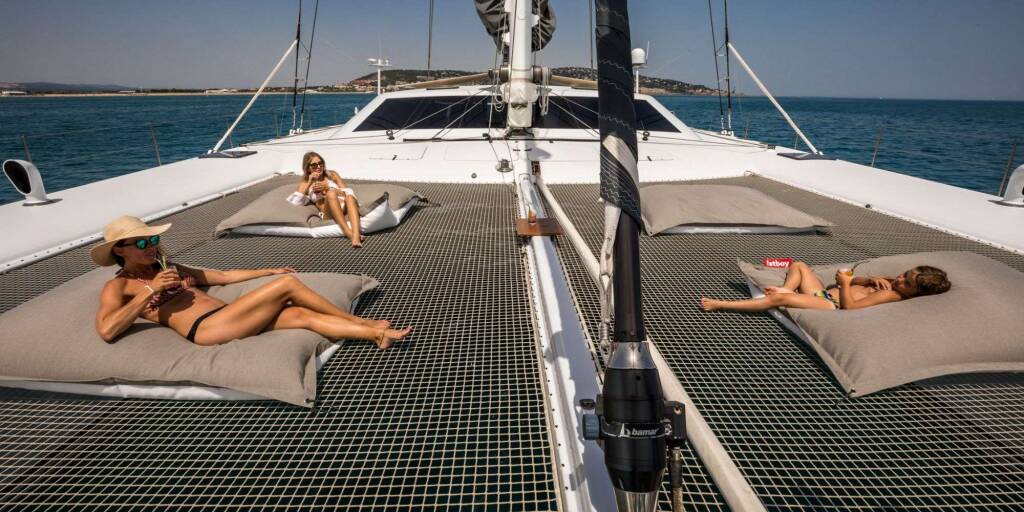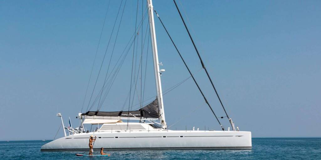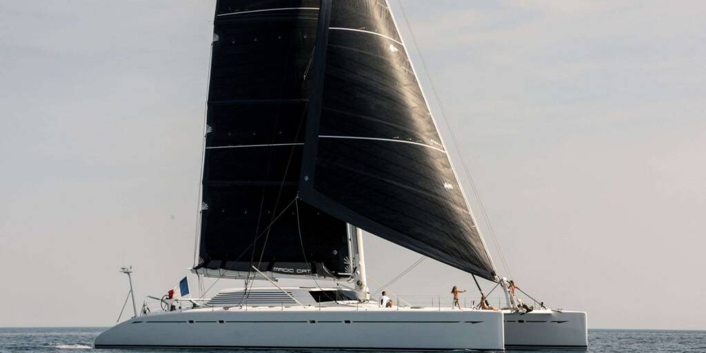 Luxus-Crew-Katamaran MAGIC CAT, Baujahr 1995, liegt vor Anker in W. Med -Naples/Sicily, W. Med -Riviera/Cors/Sard.. Sie verfügt über 4 Kabinen und bietet Platz für 8 Personen.