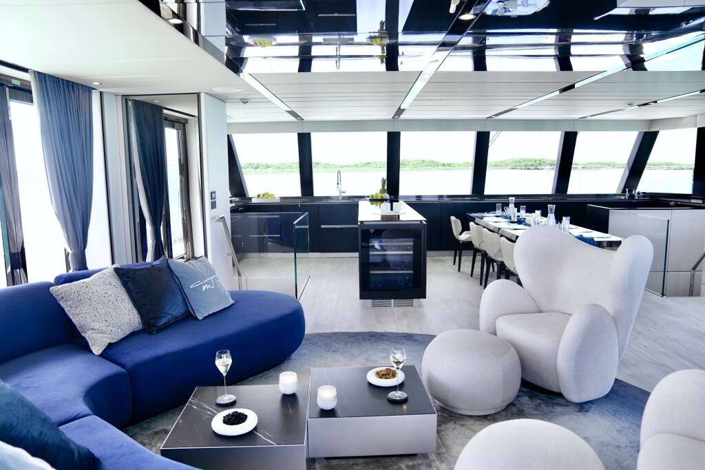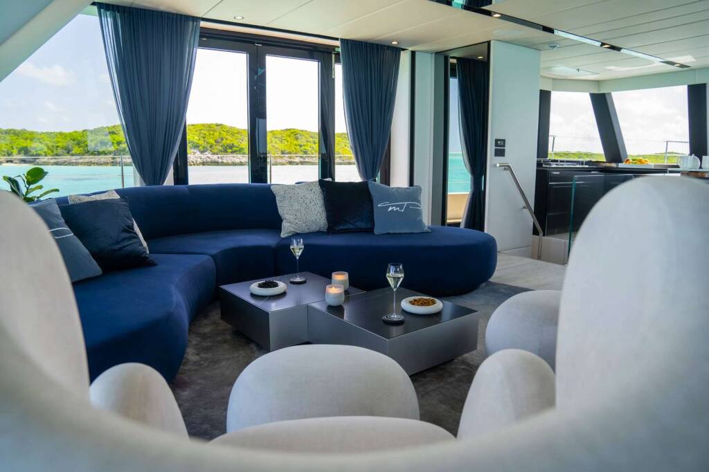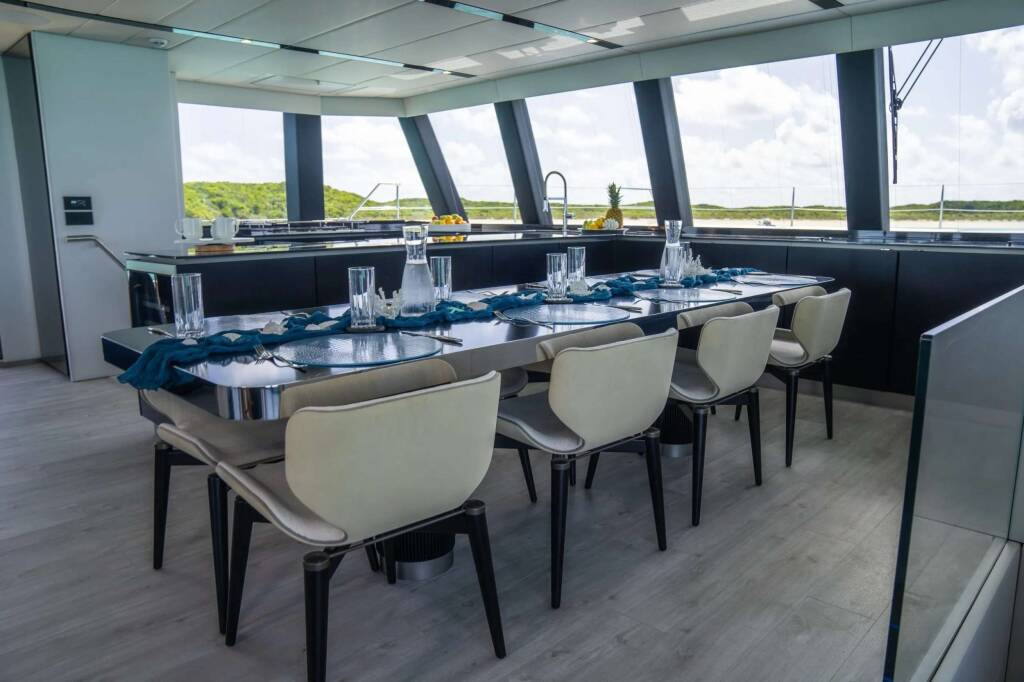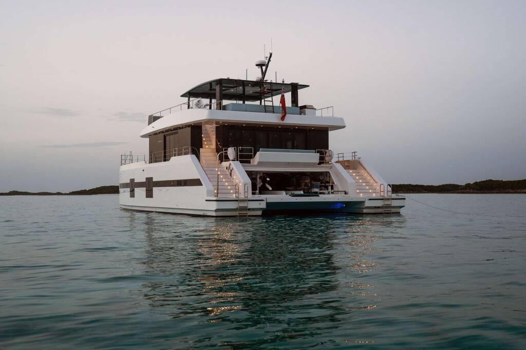 Luxus-Crew-Katamaran MARIA THERESE, Baujahr 2024, liegt vor Anker in Caribbean Virgin Islands (US/BVI), Caribbean Leewards. Sie verfügt über 4 Kabinen und bietet Platz für 8 Personen.