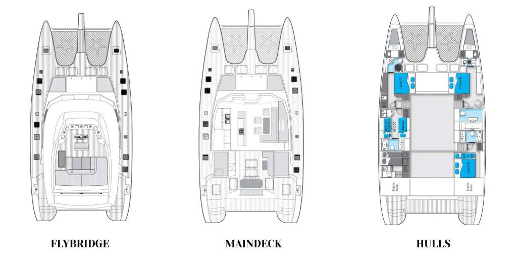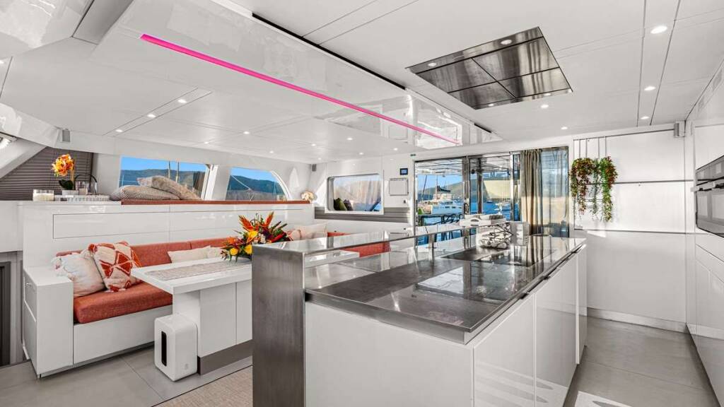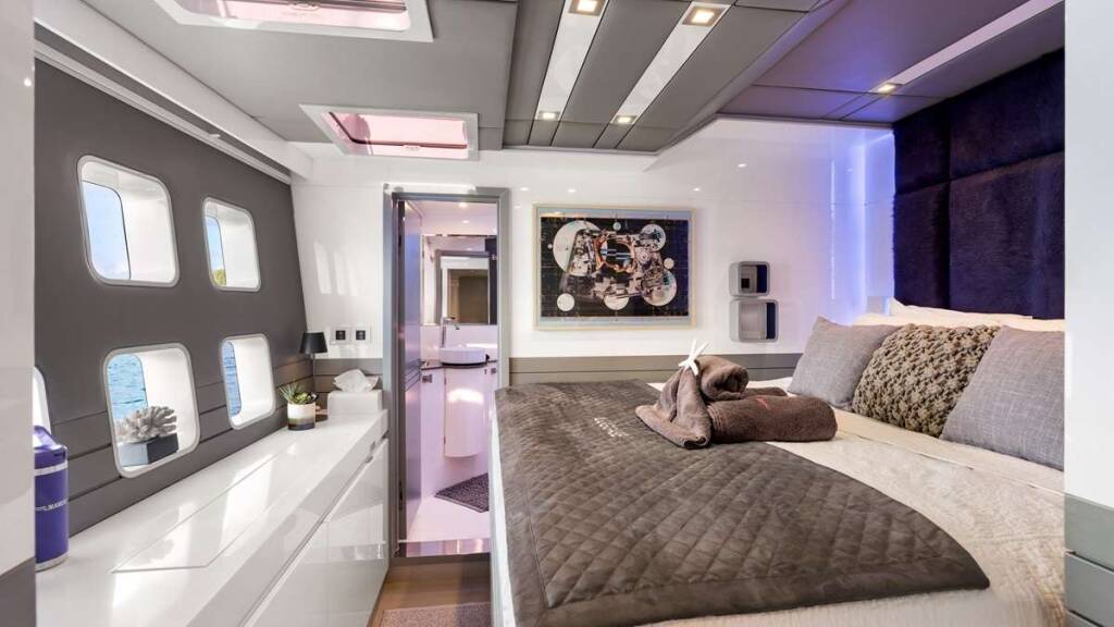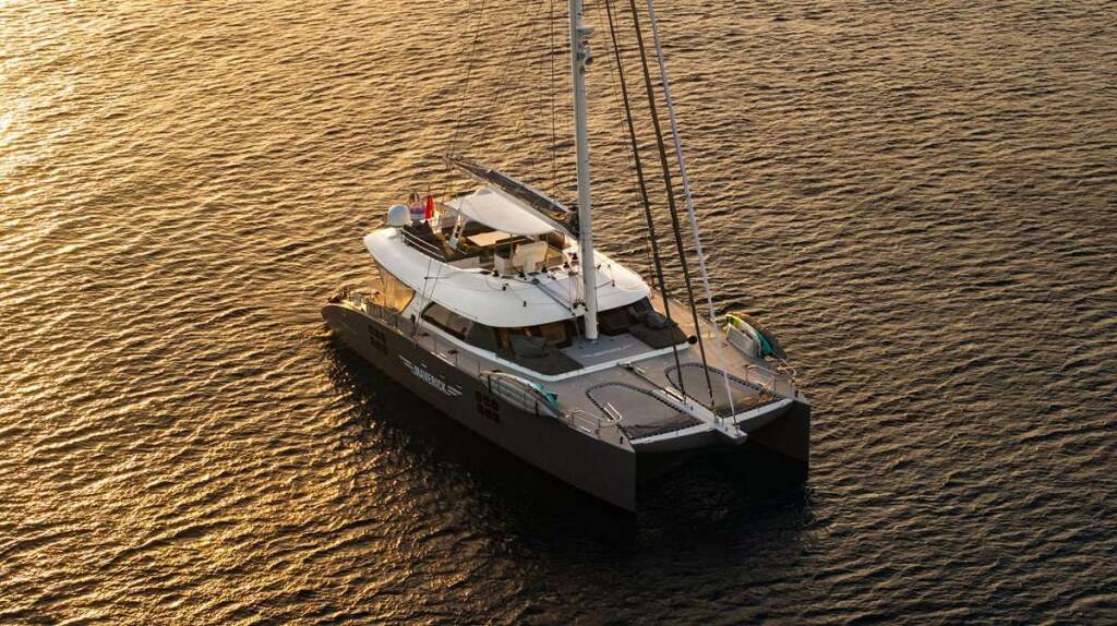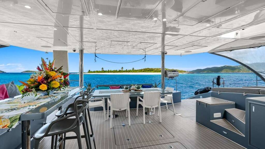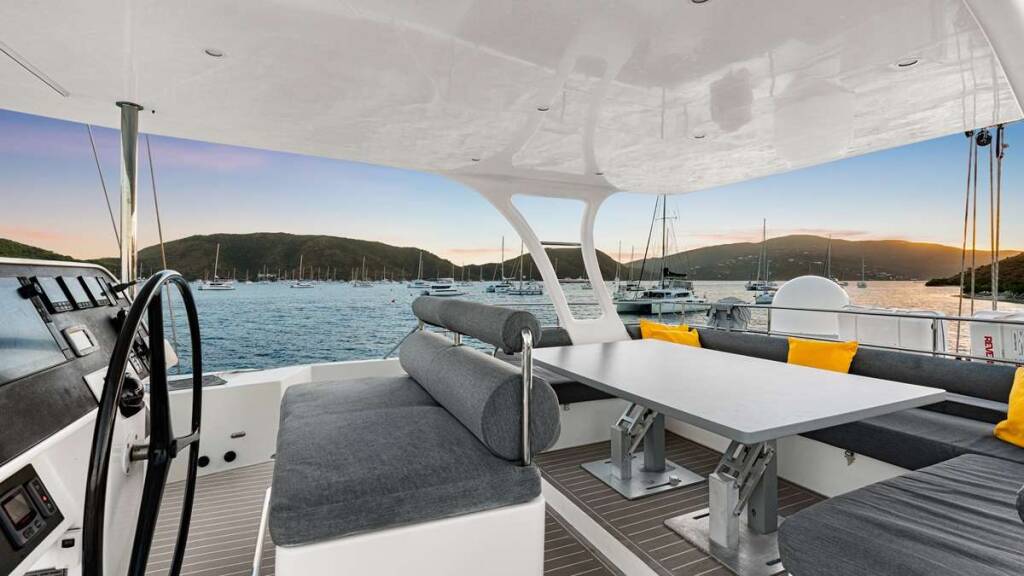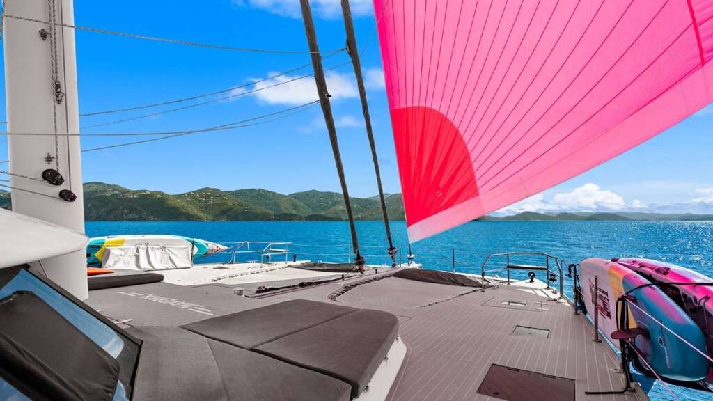 Luxus-Crew-Katamaran MAVERICK, Baujahr 2013, liegt vor Anker in Caribbean Virgin Islands (BVI). Sie verfügt über 4 Kabinen und bietet Platz für 9 Personen.