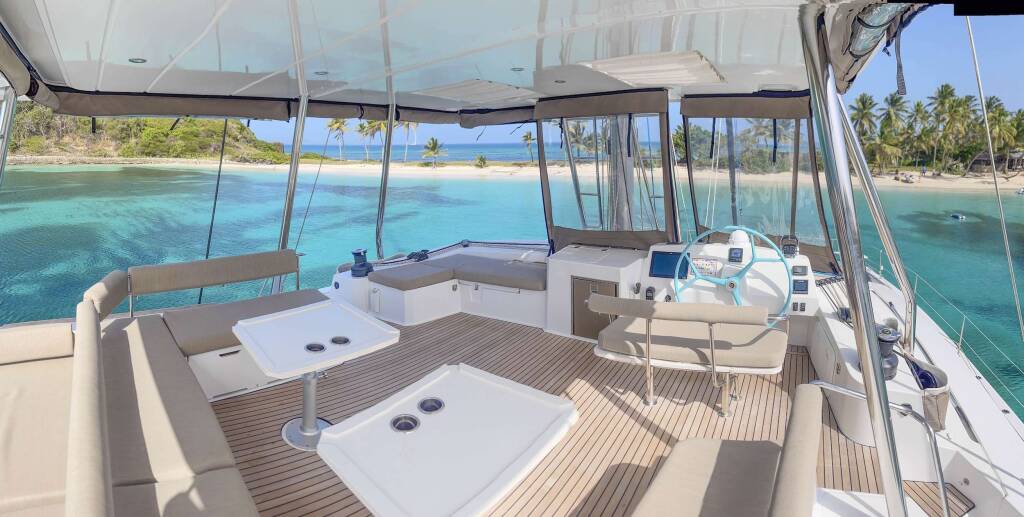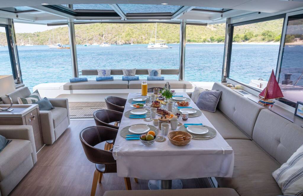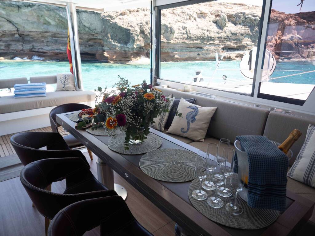 Luxus-Crew-Katamaran MIM OCEAN 1, Baujahr 2023, liegt vor Anker in W. Med - Spain/Balearics. Sie verfügt über 5 Kabinen und bietet Platz für 11 Personen.