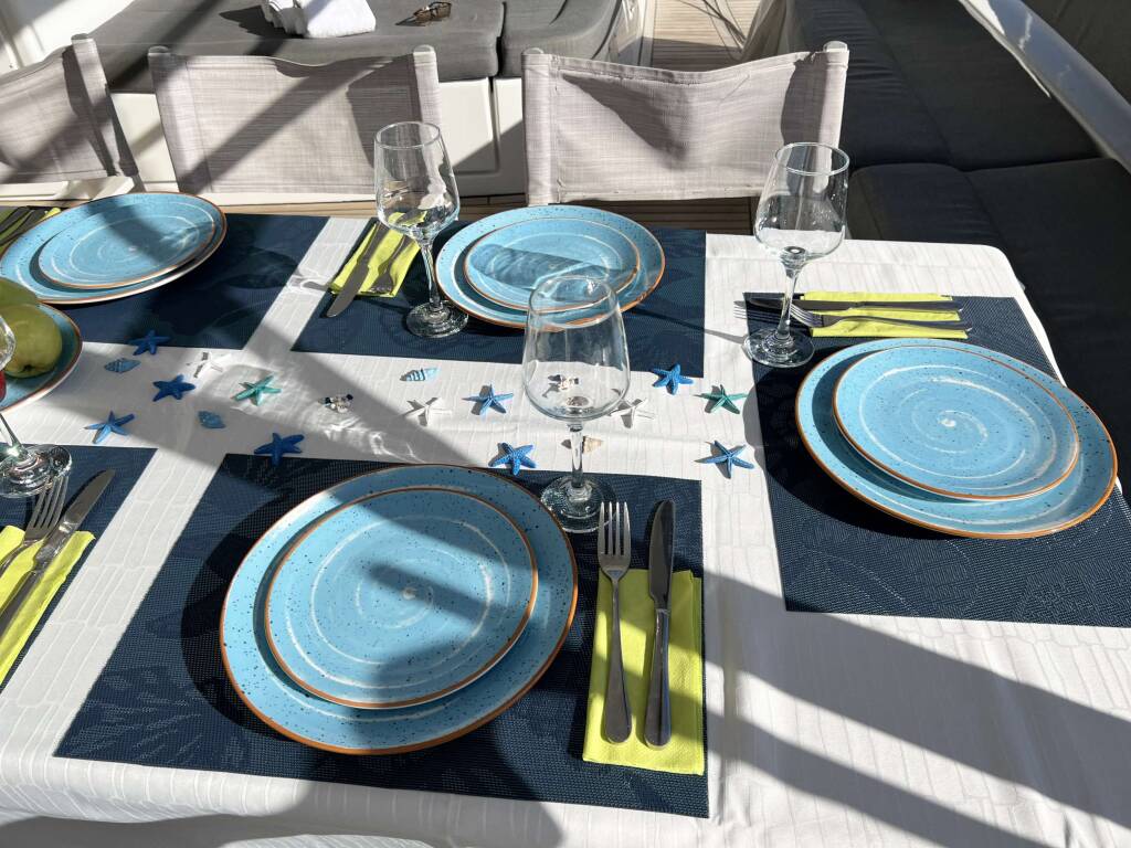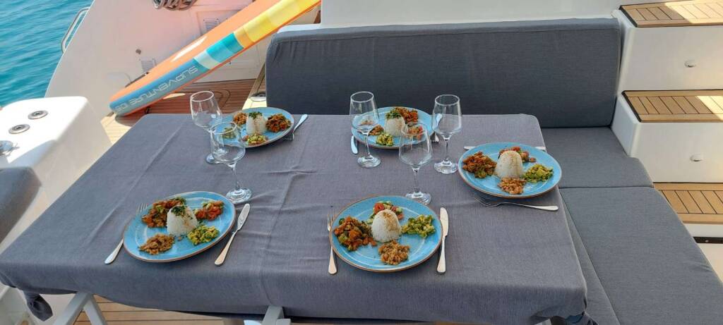 Comfort / Pleasure : Air Condition | Air Heating | Generator | Fans In Saloon & Cabins | 220V sockets | Cockpit Cushions | Cockpit Speakers | Music Player | USB Sockets Saloon & Cabins | Deck Cushions | Snorkeling Gear | Electric Toilets | Chairs | Watermaker | 2xSUP | Hydraulic Gangway | Wooden Foldable Cockpit Table
