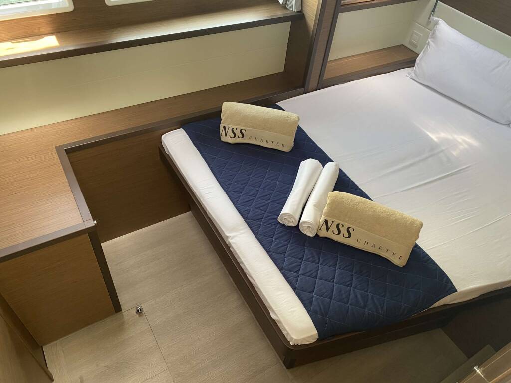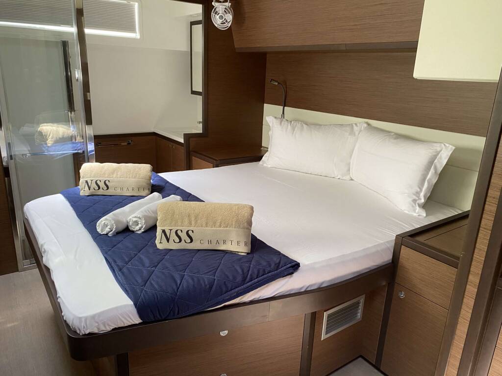 Luxus-Crew-Katamaran Naka, Baujahr 2020, liegt vor Anker in W. Med -Naples/Sicily. Sie verfügt über 5 Kabinen und bietet Platz für 10 Personen.
