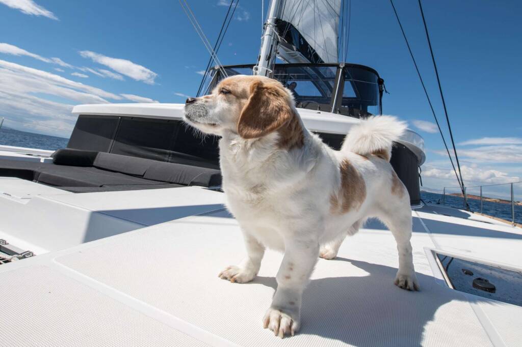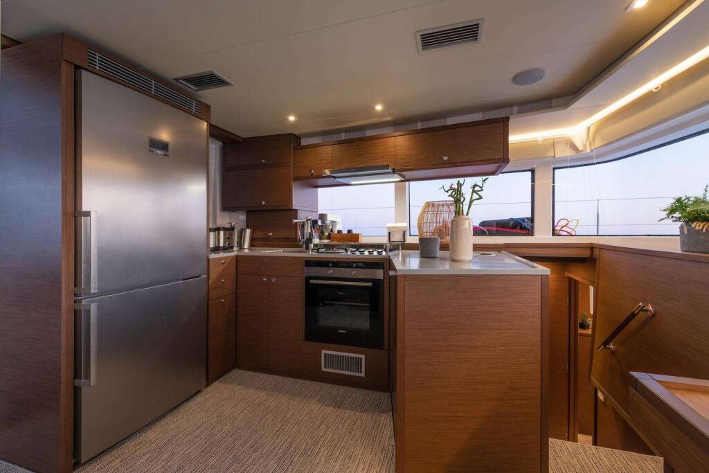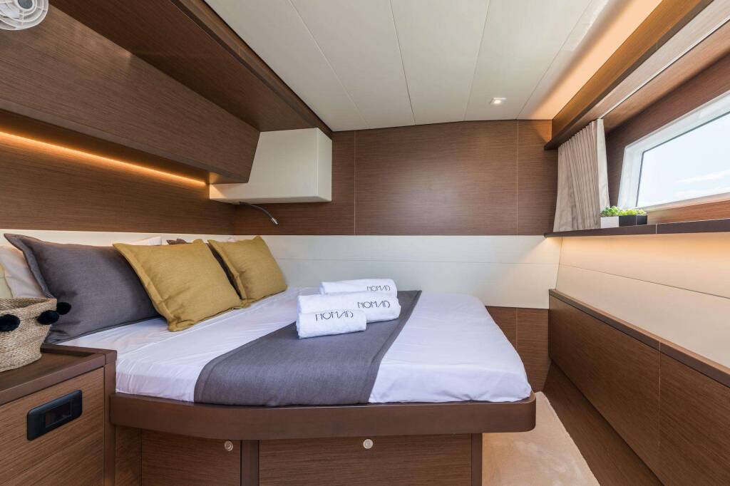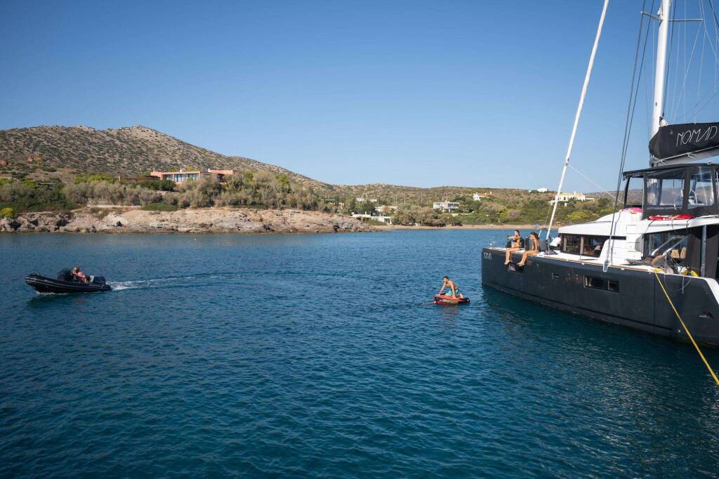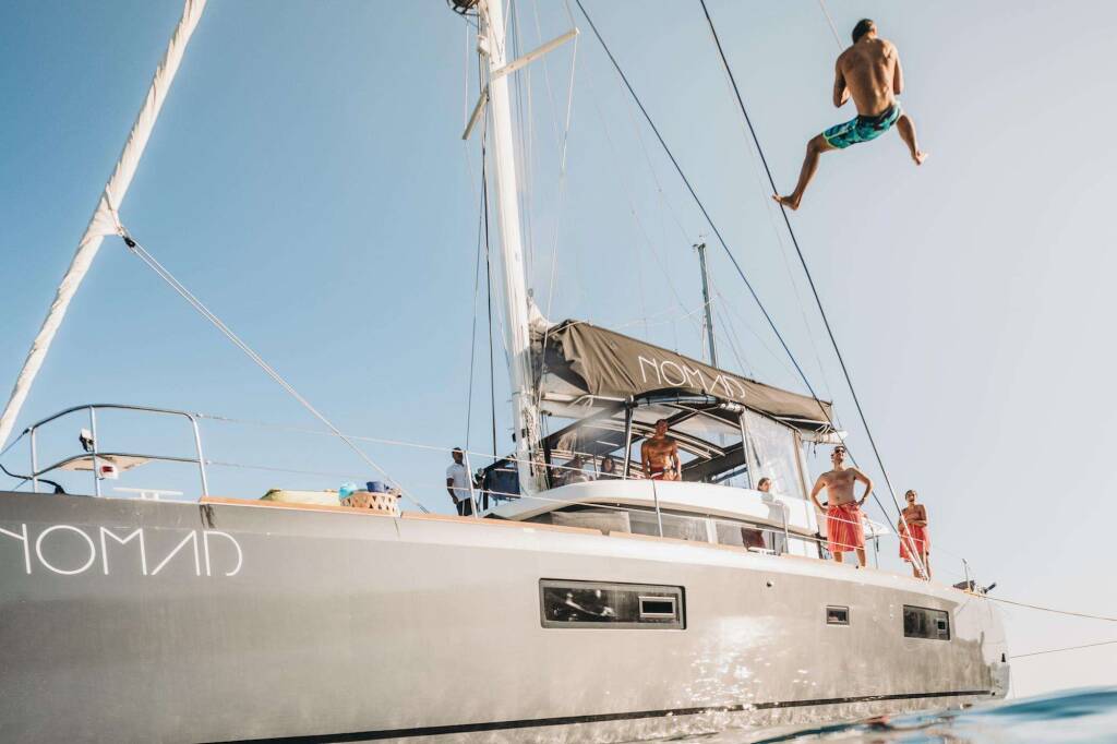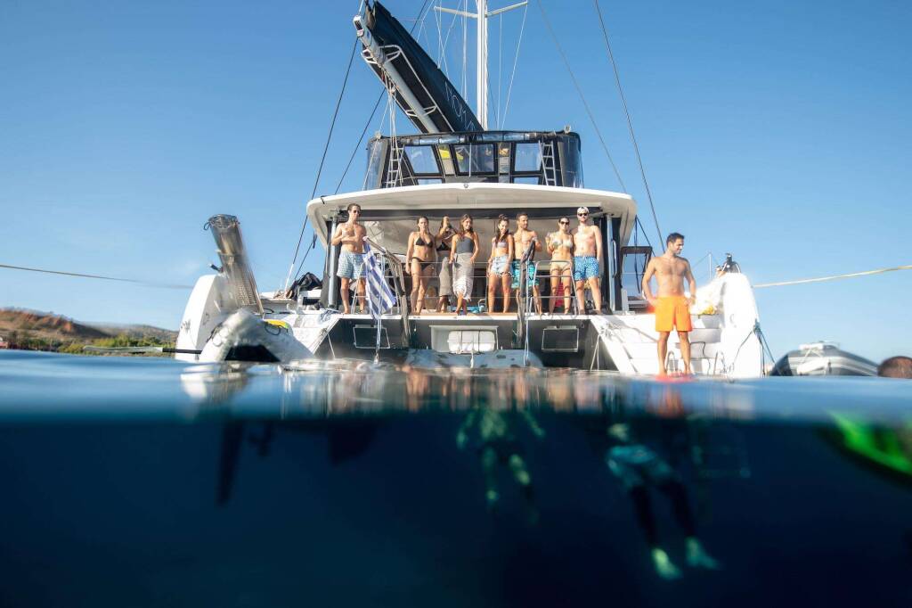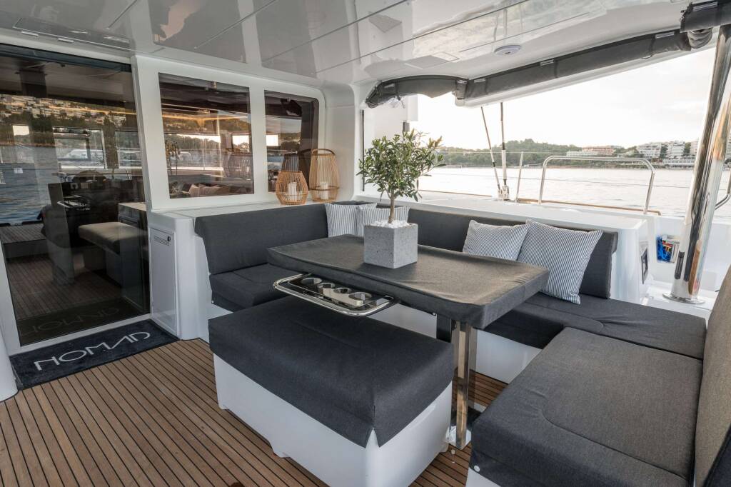 Luxus-Crew-Katamaran NOMAD, Baujahr 2019, liegt vor Anker in Greece. Sie verfügt über 6 Kabinen und bietet Platz für 12 Personen.