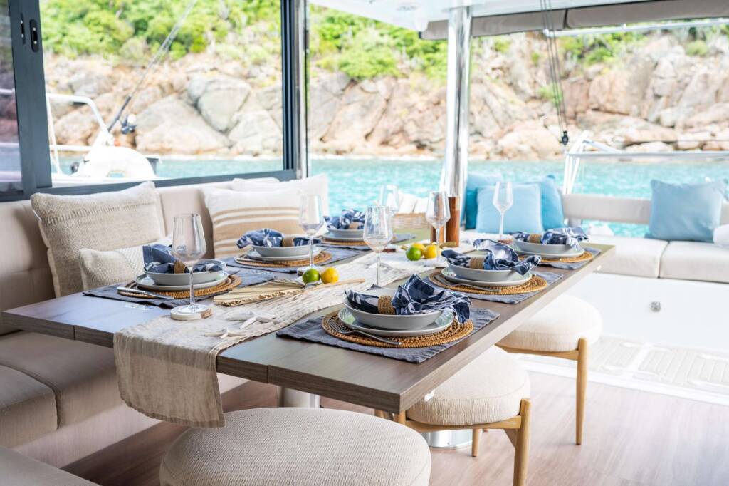 In true Bali catamaran style, the salon back wall lifts up and side widows slide forward to open up the entire space for an alfresco dining experience and panoramic views.